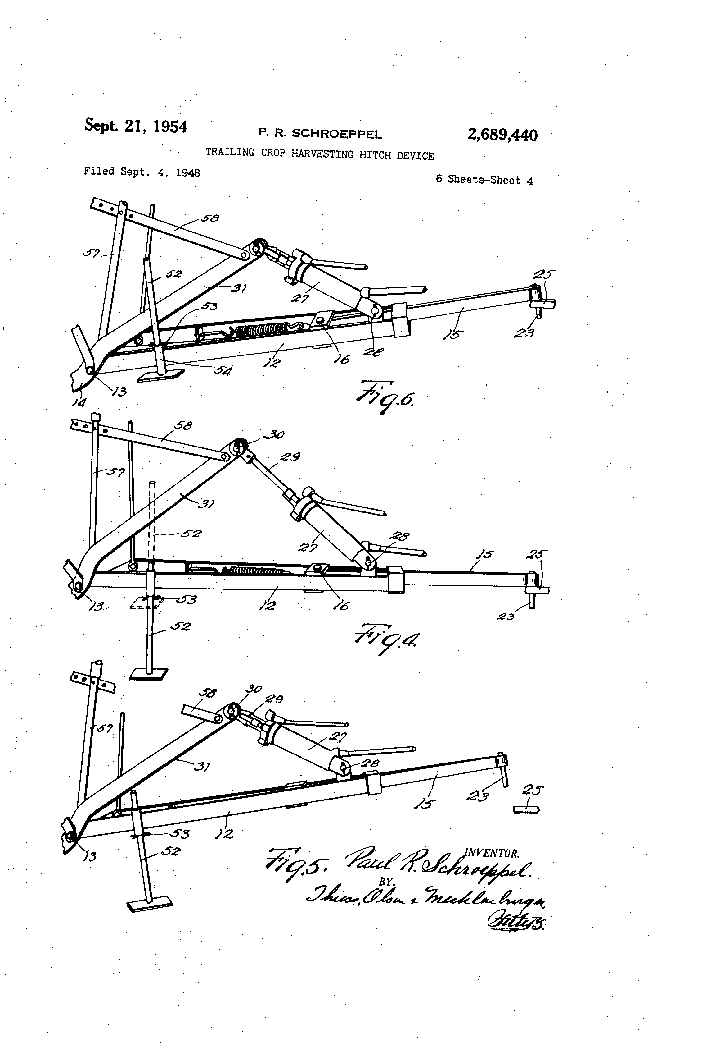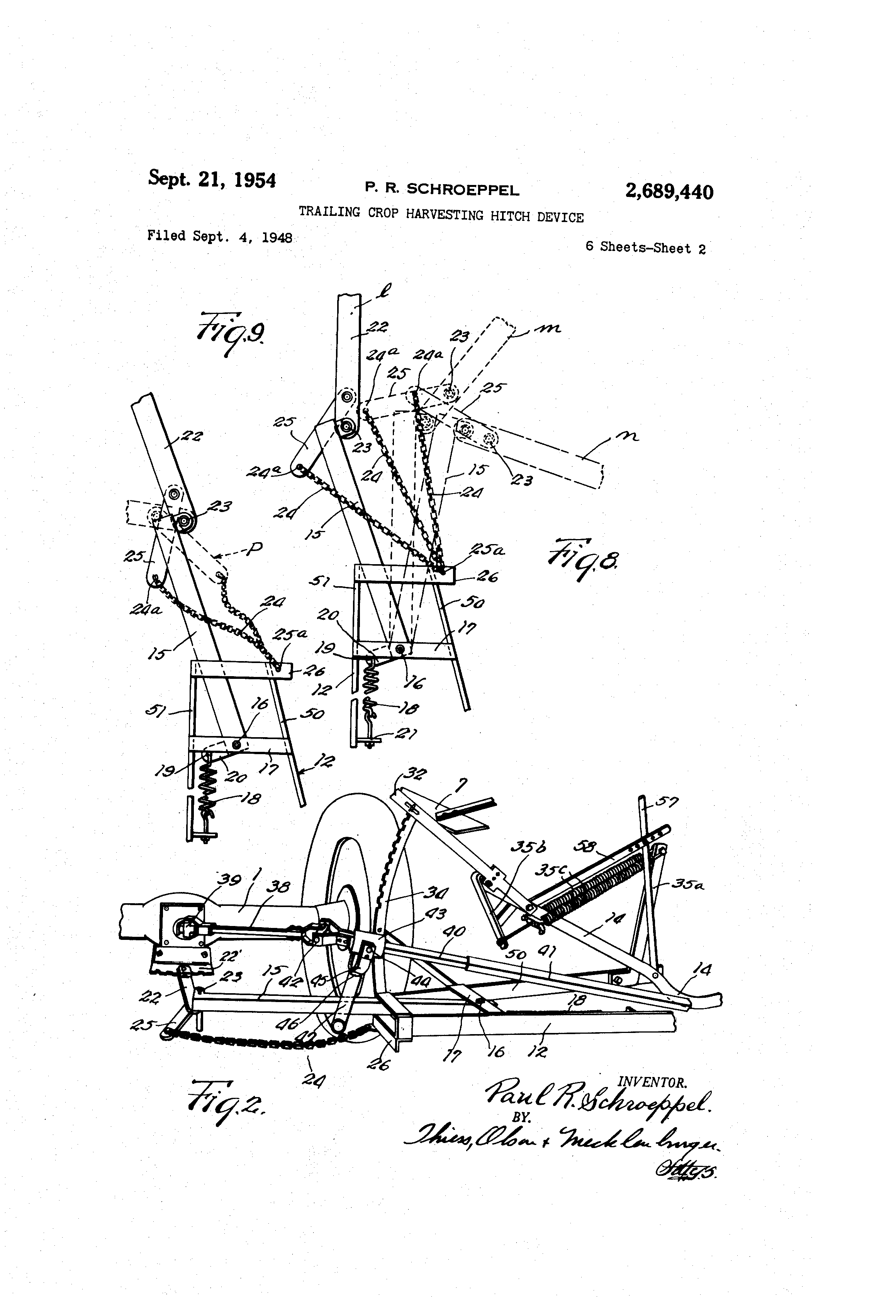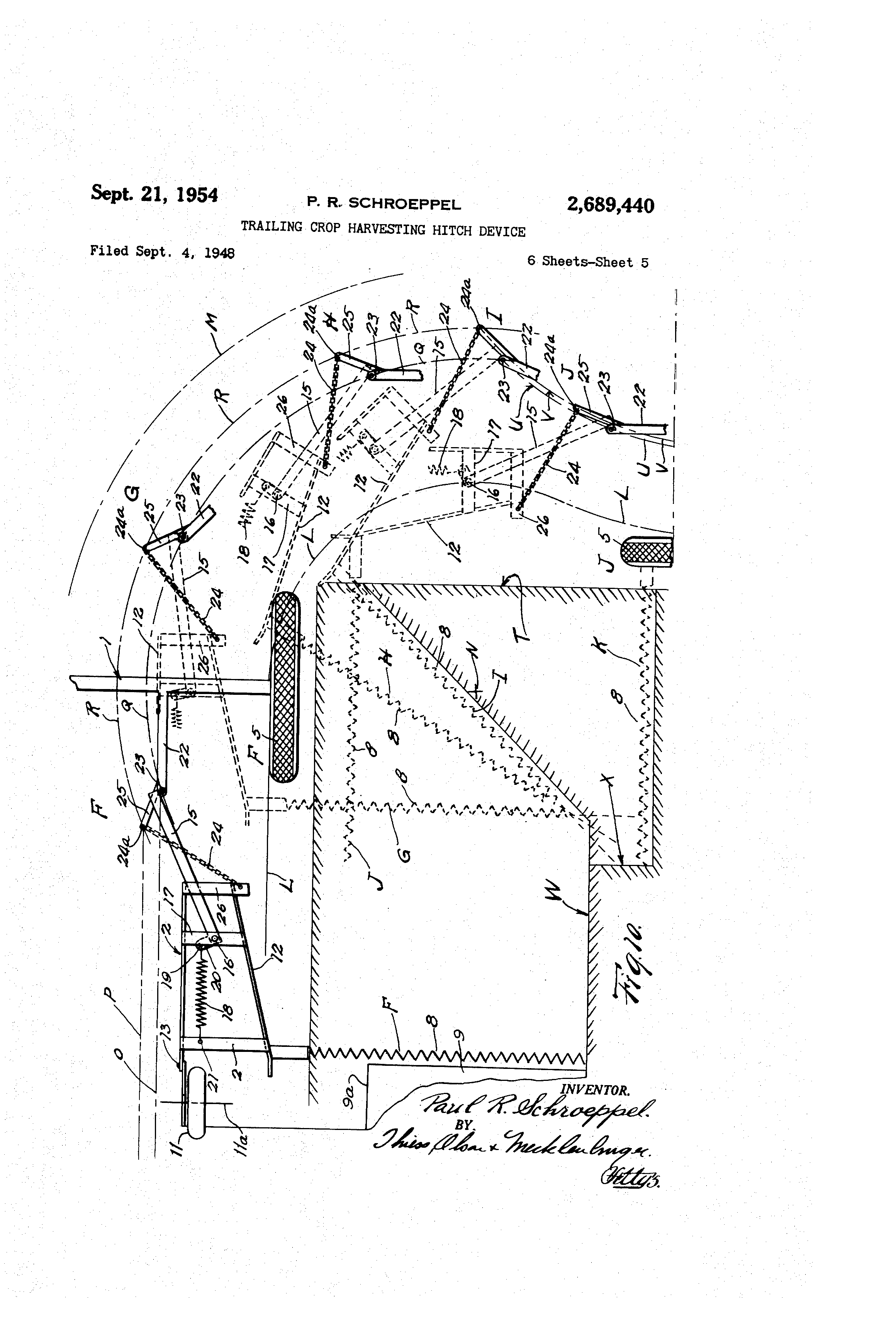 Patented Sept. 21, 1954 29689@440 U.NITED@@ gTA--.,-T-@ES PATE,NT 2-,689,440 TP.AHZNG@@MOP HAP.VESTING HITCH VICE ,P.aut @-&- iSchro6pp6l,@ Rockford, Ill., assignor,to J@,1. Case@Company, Racine, Wis., a corpomtionf% @of @Wisconsin,@ Aoplfcatidn@'96]-Dteniber 4, i948, Serial@;No. 47@793'@ 1 - Claim, (Cl. 56-25) My invention @relates @to hELrvegter @hitchesi one of @the objects,of niy inv-erition is @@to @provide@ a harvester hitclr'f(ir conriectilig' a harvester and tractor by raeans @ lbf@ @ which - the@ corners 'of the uncut area may:b6:mainta-iiied@@substantially - ,@5 reclv-angular notwith8tan'ding that.the: tradtor must travel in an arcuatelt)r our-Ved@path@@in@making the turn. A furthor object @is@,@-to providb.@on.liftiprovgd power take-off betweenla-tractor arfd'the@har- io vester drawn,'thereby which,'@will@'gvoid@ eXcOssiVe angularity between the 'swtioiis of 8hbfting,.wh6n ni aking turns. A further objedt is to provide iniproved'power means for adjusting the height (Jf-@ eut @of @the i,-) harvester. F-urther objects @and @ adVAntiiges @@@df 'the @invention will be apparent:from@thL-7d6scriptibn alid claim. In the drawings, in which'@an.@embbdiment,of 20 my invention is. shown, Mgure I is a perspective @PlEin view. showing a ti-actor@ porti6ns of a @windtower,, @a drawbar@ and power connections @between,@the ttadtor and windrower, the tractor beiiig - shown as @ @having 25 n,iade a@sharp turn; Fig. 2 @@is a rear 6levELtionAl -perspedtive view d,Z f ' @'t ;to @and)@tfieL shbwing the rea,r -en o @ a rae, r ifront end of the windrower, with.@@connectibns therebetnveen@ the reliA;ti-ve, positions coiiiesdonding 30 substantially to 'those -shown @ ydg@ 3 is a @ side @ 6levational view@@! @howing the rear end of the tractor,and,the,front,,end.@6t.the wind@ower and the connections ;therebetween, the tractor bein@ @@h6wn as @travelling @ @traight 30 ahead; Fig@ 4 is an@ enlarged side 6levational. persp - ee tive view showing the drawbar connected @With the rear end of .'the @tractor -hit'&h @ andi " sh6wing on; the ram in ektend6d positi 40 Mg@ 5 is a view similfir to@-'-F'ig,. 4-- but@sh6Wing the drawbdr disconnected -ftbm :thi" tractor, the ram being in withdrawn,position-, Fig@ 6@ is a view similar to I@ig.. @ 4 @but showing the stand in ilus elevated @v,ositi6n and'the rani 45 in its collapsed position for efftcting a,low cut; Fig. 7 is an @enlarged @elevationiii @erspective view showiilg a manueil adjustrhent,for 'height of cut, substituted for the powerram @shown 2 the,position of--,oatts@-v@hian:.the'@tvitotor@:.'I'S rnbking a left-hand -turn" Fig. lo @@ s a diAgran-imqtic-,.-plan'@vieW @ showing the vapious pogitions@'Whidh the pEitts@'of,.thL-@:tractor:and windrower@"8ume@@wlj:en@@the'.mT!ndrower is -cutting a sliarp@ corrier,@and@the tractor@is accordillgly making,Ar,shorp -tlirn, @oneof @the@@windrower vtheels 'beiiyg 2renioved d@@ Fig. 11 is a diagrammatic plan view,,.in@@general similar to Fig@ 10,@but,,,shawing,@the@parts@on a reduced scale:iii@order-- to@bring@in@:a larger@Portion of the field@@ Reforring to the@ the @ construction shoivn comprises,@'a @tractor II ' aild',-a: Win@dr,oWer: 2 drawn;thereby@ @The@@trgctor@'cornpriges,,a @i2@hassis a' provided with @front and@7:reEir . wlheels ,4 @land 51 a s(,,at 5a@, a 4st-eering wheel@-.6i an @engine for driving the @traotorl, @ a draf@t a6ifstruction @ cOnnecting the traetor @'and ,w-iiidtower, and A,,%power @Llake-off,@for 8upplyiiig I)ower:@.fr'om the :engine to actuate the reel 7, sickle -8" con-veyor 9,, etc,, of the windrower. 'Thel,,wiiidr-owi--r:- @comprises a carriage or. chassi@ IO 'pr@ovid0d,,@vith@ a,-pair Of coaxial @ground@- enga@ing@.wlieels' r6tatablb about th-- axis II a (Ftg's.@'lo@fand@' 11) I a sickle 8 'mountedr:for reliprocatf6n@ @tliereon@, a @ conventional conveyor 9 @,'extendihgl ti-an8versel,y of the line of travel 4if the WindroNvar 'f or i receiving @ cut materi@,l and de@liv6fing@@it-@ih',Windrow form at tile end tl- o f the conve, 76r reihote'froxh@the stand ing -grain, and a r;ael 17 for bending@ the rst-alks, of gra-in toward the sickle-,and rw6epirY.- @the:cut grain onto the conveyor@ A4draft con6truction is provided @f6r @ oonnecting, th-e-@, wihdrowi@r ti@ac@or in a manner, to @ena' i6lative,:Iy@ @short, sub8t-antially rectangi@lar turn's of -,the @windrower. 'The transi-nission @ fr Om, tlie@ povier @take-7orl; on the tractor to the@ driven by@ tlie windrower indludes ted sh@ift sections. e gn d o,@ ent:exces nee @d -Si e -,t @@prev sive angular displacenieiii@;-of-.the7sections:with res,,)ect illo each other,@in-making@thialshort turns@ The draft @connections betweeir@@'the lwindrower and@trac+vor,comprise a,:,Irusslike,hitch@.'or@tongue 12 rockably, connected@.,@t @@ 1 3 lo forMrardl-y-@extendi @ ar @l 4 @rigid with'respect@, o 'the.windrower n@ ssi-rns @t @ clia s 10@ a@:draivbar'15"pivbtall@y-@connected,@at IS to svving @ Eibout vertical. axis.,-on @ai crossbar i7 of 'the@windro@,ver hitch,@a coill:tenqion@st)ring in Mgs. 4, 5 and 6 i 5o l'o connected@@at 19@.@with.@allatere@l;@arm.20i.,,@onthe Fig. 8@is@an enlarged@lplan.'view showing@varihit ch-drawbar@@15'@pnd,conneettd'j@at 21 :with the ous Dositions-of the tractor and windrower@hitch windrower hitch 12 for biasing and urging@@the POand the drawbar c6nnecticin bi--tween@theni, @how piv 6ted'draivbar '15:'-to,.itsf-extreinb@loft-lig;nd@, ing the tractor@rntaking@ a@@-ri@ht-hand,tur-n'- siti 6n,, a. tractor hitoh'@'22 @piv6tklly, adjuttg@ble -to '8 s F,lg. 9 is 1 a view'sirhileir't cpig biit @ showitg, 55 diff 6rent, 'gottelble @,.Ijo itions @avout 3 as at 22' showp- in Iqg. 2, on the tractor and pi-votally connected at 23 to the drawbar 15, and a chain 24 having one end secured at 24a to the rearward lateral extension 25 of the tractor hitch 22 and its other end connected at 25a with a crossbar 26 on the windrower hitc-h 12. Means are provided which may be either power means or manually operated means for adjiisting the connectio