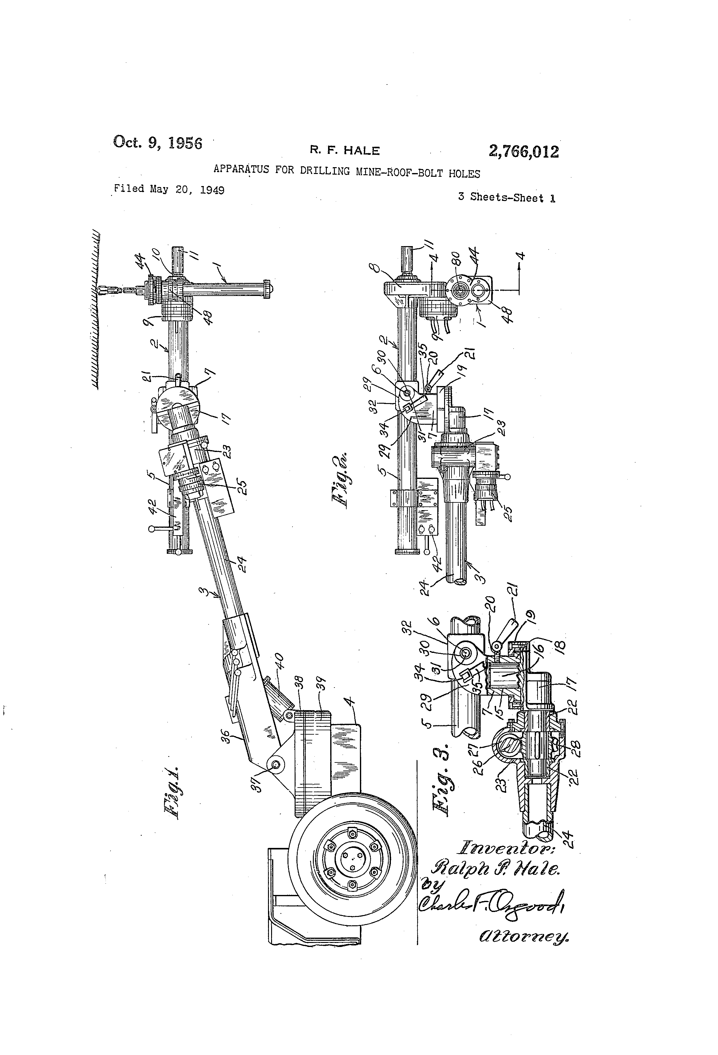 Letters Patent is: 1. In a drillin- apparatus, -the combination comprising 30 a support havin.- parallel vertical bores providing a vertical slideway, a frame havin.- parallel pins receivable in said bores, said pins Teadily removable upwardly fr<)m said support, a motor carried by said frame, said frame havin- an abutment surface which rests on said support 35 when said pins are received in said bores, means driven by said motor for rotatin-. a drilling implement, and feedin@ means for said drilling implement including feedin.- liements extendin- downwardly a substan-tial distance 40 below said frame in parallelism with said slideway. 2. In a drillin,@ apparatus, the combination comprising an adjustable support, a frame mounted on said support, a motor carried by said f@rame, means driven by said motor for rotatin.@ a drillin.- implement, and feedin.- means for said drillin.- iinplement for feeding the la@tter 45 axially relative, to said f-rame cornprising feedin.- elements extendina vertically downwardly a substantial distance below said frame, and a tubular support secured to said said tubular suppoi-t provided with a bottom floor en,-a.-in-. abdtment for steadying the drillin.-,to,ol duiing the drillin- operation. 3. A drilling apparatus as set forth in claim 2 wherein said motor -and said feeding means are fluid operated, and a power source and manually operable control valve 55 means,are provided whereby fluid under pressure may be stipplied to said mc)tor and said feeding means and may be manually re.-ulated, said control valve means carried by said ad,;ustable support and having operator con- (io trollable regulatin.- means. 4. in a drilling lapparatus, the combination comprising a support providiiig a vertical slideway and havin.- an ur,,wardly facin.- sul-face, and a Ln;tary drilling tool compris,'.n,- a frame having a downward projection received in said slideway and readily removable upwardly from (;5 said suppart up(>n removal of the tool, said frame havin.a a downwatdly facin.- surface resting on said supportsurface during the drillin.- operation, said -tool comprisin.- a motor carried by said frame, means driv,-n by said motor for rotating a drilling :Implement and feeding 70 mep,ns for tlit-, driltin.- implement for feedin.- the latter axially relative :to said support and said frame durina drilling includin.- feeding elements extendin.- downwardly a substantial distance below said frame in parallelism wit'a said slideway, said tool having its major portion 75 disposed below said support@surface during verti . cal I overhead drilling. 5. In a drilling apparatus, the combination comprising a base, a horizontal turntable carried by said base, a boom pivotally mounted oii said turntable to swing in vertical planes with respect thereto, a support mounted at the outer extremity of said boom for rotation about the longitudinal axis of said boom, an elongated arm pivotally motinted on said support to swing in planes parallel to a plane which includes the longitudinal axis of said boom, said arm projecting forwardly a substantial distance in advance of said rotatable support, and a unitary drilling tool detachably carried by the outer portion of said arm with its longitudinal axis disposed at right angles to the longitudinal axis of said arm, said drilling tool comprising a drilling implement, a motor for rotating the implement and feeding means for feeding the drilling implement relative to said arm and said boom while the latter remain stationary, said tool being removable as a unit from said arm, said support being rotatable relative to said boom to locate said arm in different lateral tilted positions thereby to vary the angular position of said tool. 6. A drilling apparatus as set forth in claim 5 wherein a second support is mounted on said rotatable support to turn relative thereto about an axis at right angles to said support axis, and said elongated drill carrying arm is pivotally mounted to swing as aforesaid on said second support, said second support being swingable about its pivot relative to said rotatable support to tilt said arm together with said tool in longitudinal planes. 7. In a drilling apparatus, the combination comprising a base, a horizontal turntable on said base, a boom pivotally motinted on said turntable to swing in a vertical direction relative thereto, a support mounted at the outer end of said boom to rotate about the longitudinal axis of said boom, a support carried by said rotatable support to turn about an axis at right angles to the axis of support rotation, an arin pivotally mounted on said second support to swing about an axis at right angles to the axis of said second support, and a unitary drilling tool detachably carried by said arm and arranged at right angles to the longitudinal axis of said arm, said tool removable as a unit from said arm and embodying a motor, a drilling implement driven by said motor and feeding means for the drilling implement for feeding the latter relative to said boom and arm irrespective of the adjusted positions thereof, said rotatable support and said second support being adjustable about their respective axes to tilt said 8. In a drilling apparatus, the combination comprising an adjustable supporting structure including a boom swin-able iii horizontal and vertical directions, a support mounted at the outer end of said boom to rotate about the longitudinal axis of said booni, a second support swivelled on said first support to turn about an axis at right angles to the axis of support rotation, an arm pivotally mounted on said second support to rock relative thereto about an axis at ri.-ht angles to said axis of said second support, a frame carried by said arm at its otiter end and having a lateral projection, and a unitary drilling tool detachably mounted on said lateral projection with its axis arranged at right angles to the longitudinal axis of said arm for drilling holes in the roof, said tool removable as 