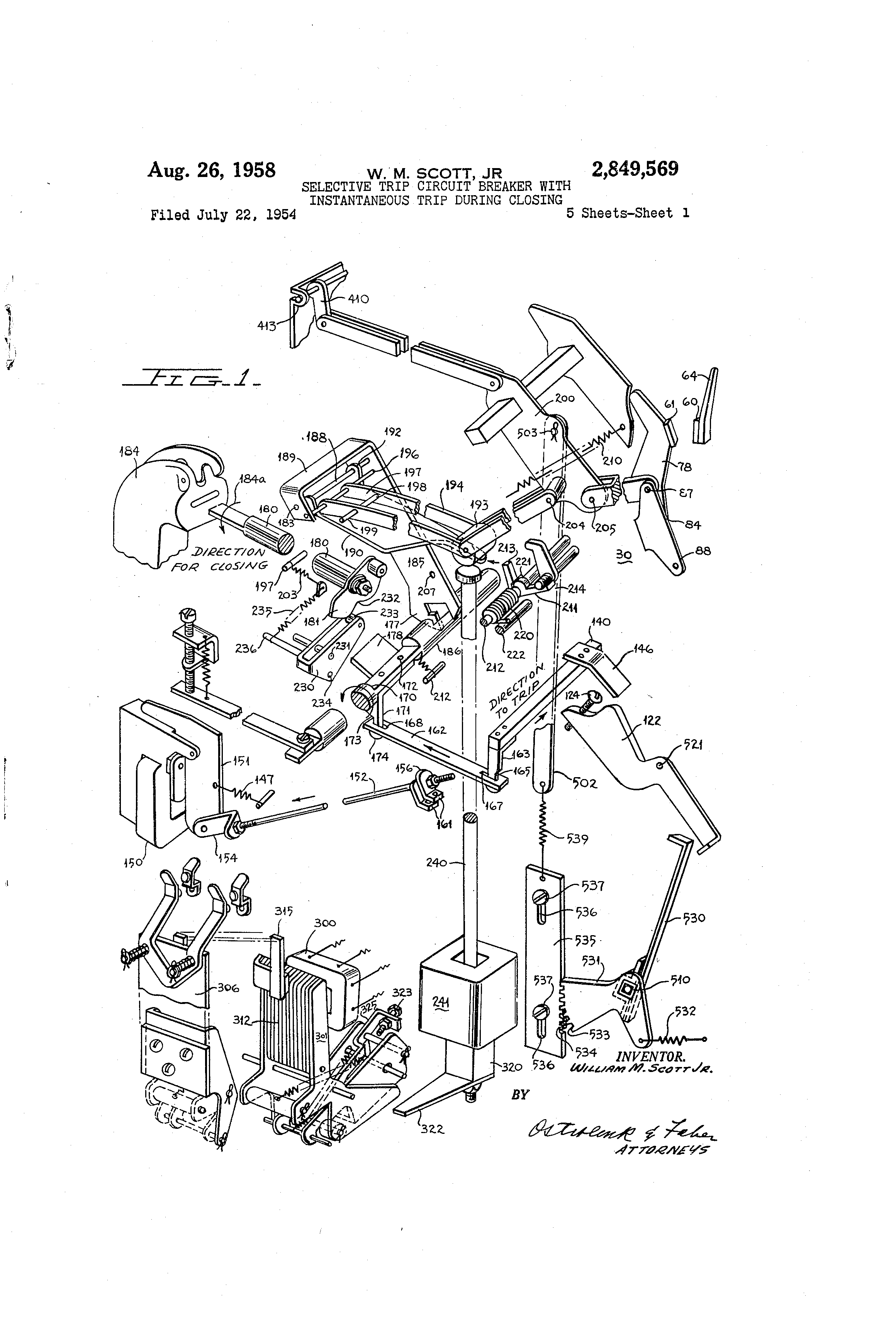 9 It will be i noted that after the conta:cts have latahed closed and the mechanical blocking means 530 is rotated in a clockwise direction by means of the common shaft 510 that the biasing spring 532 will be tensioned and energy thus stored therein. However, the sprin., 5311 dominates over the spring 532 and hence tl-ie biasin.- spring 532 will be ineffective to rotate the ratchet 531 in a counterclockwise direction. I-f the circuit breaker is tripped open by either energization of the overcurrent coil 139 or manually by means of the handle 134 or by means of the shunt trip device 150 the movable member 200 will be moved downwardly. Hence; the link 502 will be moved downwardly due to its being pivotally mounted on the member 200. Accordingly, the mass member 535 will no longer be supported in its upward position and lience, will tend to move down. Furthermore, the stored eneray in the biasing spring 532 can now be released to thereby aid in rotating the ratchet 531 in a counterclockwise direction, which wil@l aid in moving the rack 535 downwardly, The downward inovement Gf the gear rack 535, due to the mesh engagement of its teeth 534 with the teeth 533 of @the ratchet 531, will cause this member to rotate in a counterclockwise direction, thereby rotating the common shaft 510 and the blocking means in the same direction' @l-lence, the bloclcing means for the instantaneous armature 122 will be removed N@hen the circuit breaker is being opera,ted to the open or trip po@sitioii. Thus, the instantaneous armature 122 is iagaiii rendered operative when the circuit breaker is re-closed either manually by the handle 184 or automatically by the closing means 300-301 and 240-241, to thereby provide instantaneous trip operatioii in the event a fault current exists on the line. In the drawings of Figures 1, 2 and 7, 1 have shown my invention in connection with pole of the circiiit breaker. @However, it will be apparent to those skilled in the art that the common shaft 510 can extend past each pole of a multi-pole circuit breaker, so that the instantaneous armature 122 associated with each pole can be rendered operative or inoperative by means of its associated blockin.- means 530 which will be mounted on the 'Common shaft 510. In Figure 9, 1 have shown a seco-nd enibodiment of my invention which provides means to render the instantaneous armature 122 inoperative after the contacts have latched closed. In the second embodiment of Figure 9, the control and coordination of theblocking rneans 530 is achieved by means of a spring @arrangement rather than by a rack and ratchet mesh engagement. ln this embodiment, the rod 502 is moved upwardly whenever the contacts are moved to engaging position and downwardly whenever the contacts are moved to the disen.-a.,,ed position. The link 502 is pivotally connected to the link 540 which, in turn, is rotatively mounted on a cominon shaft 510. A member 541, having stibstantial mass, is rigidly secured to the common shaft 510. Spring members 542 and 543 are secured between the link 540 an@ the .member 541. As heretofore noted, the heavy blocking member 530 is also rigidly mounted on conimon shaft 510. When the circuit breaker contacts 60, 61 are in i disengaged position and the Iiiik 502 thereby in its lowermost position, the biasing springs 542-543 will tend to hold and maintain the member 541, the shaft 510, and the blocking member 530 in their extremely counterclockwise position against the stop member 544. In this position, the instantaneous tri@ armature 122 is rendered operative and free to trip open the circuit breaker. When the circuit breaker contacts 60, 61 -are moved toward their en.@aged position, the link 502 will be rdoved upwardly thereby rotating the Iiiik 540 upwardly. Since the link 540 is free to rc)tate on the common shaft 510, this latter member will not be initially rotated. However, spring 543 and @ tension the ispring 541' tiieteby @ toring energy therein. If the circuit breaker is closed on a fault current the instgntaneous trip armature 122 will be operative to tnp the circuit breaker without tinie delay as heretofore de-. scribed. However, if the circuit breaker shoul.d be closed on a normal line then the stored &nergy in the biasing spring 543 will tend to rotate the member 541@ and the shaft 510 and the blocking means 530 in a 10 clockwise direction after the contacts have latched closed., Rotation of these,mombers in a clockwise direction will@ thereby move the blocking means in the direct@ion @of the. arrow 538 so that the instantaiteous trip armature is rendered inoperative to trip the circuit breaker, in the 15 event an over-current or fault current should exist on@ the line, If the circuit breaker should subsequently be@ tripped or opened either by means of the overcurrent coil 139 or the shunt trip coil 150 or manually by means@ of the handle 184 the rod will then be moved down-@ 20 wardly thereby relaxing the spring 542 and storing energy in the spring 543. Since the link 540 is rotatably mounted on the shaft@ 510 the blocking means 530 and member 541 will not be initally rotated thereby. 25 However, the stored energy in the spring 543 willi subsequently cause the rotation of member 541, shaft@ 510 and blocking means 530 in a counterclockwise direction to thereby remove the blocking membef 530 from th& path of movement of the instantaneous anna30 ture 122 to render the same operative in the event thev circuit breaker is closed on a fault current. In the foregoing, I have described my invention only; in connection with preferred embodiments thereo Many variations and modifications of the principles of 35 iny invention within the scope of the @description herein are obvious; Accordingly, I prefer to be bound iiot by the specific disclosure herein, but only by the appending@ claims. I