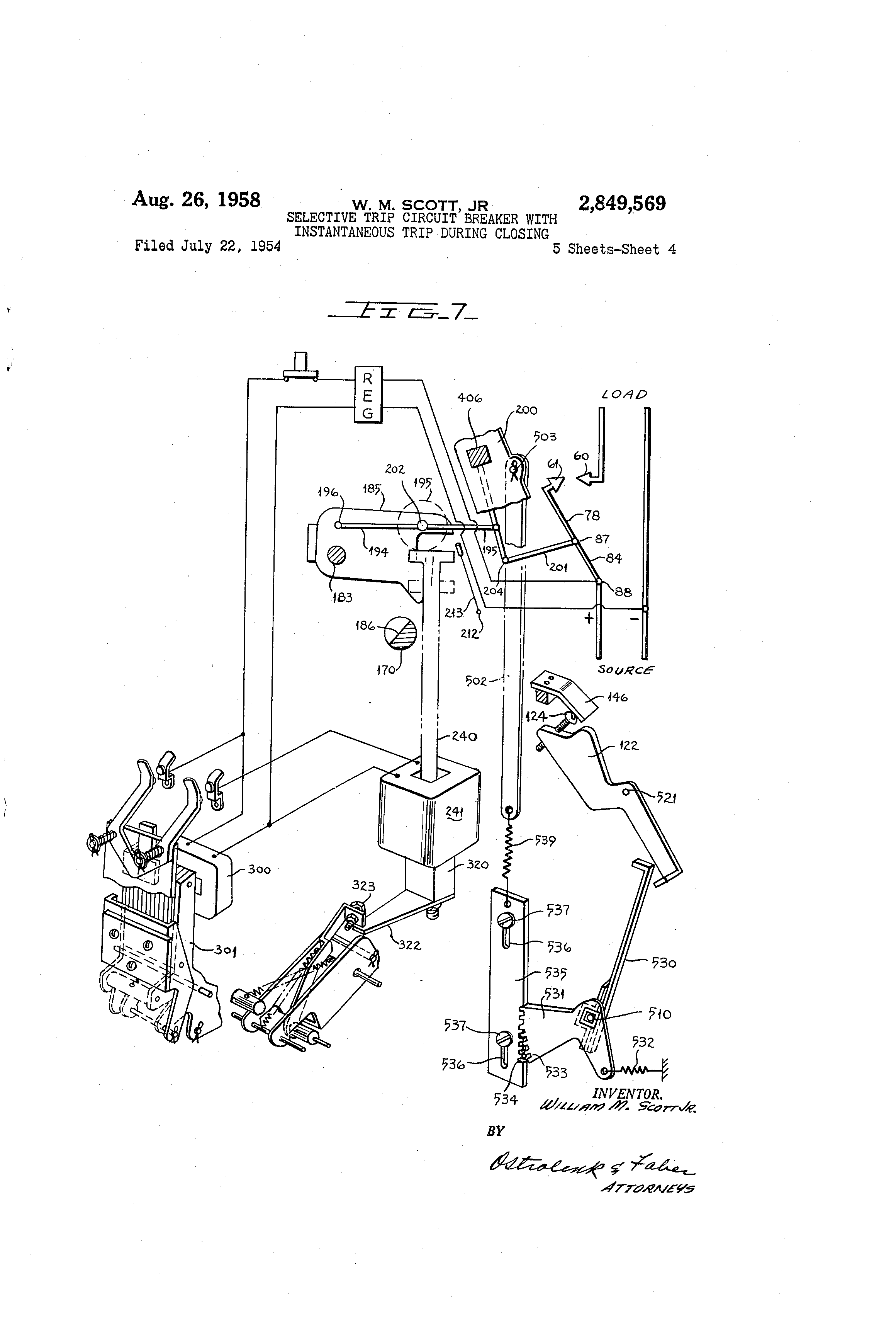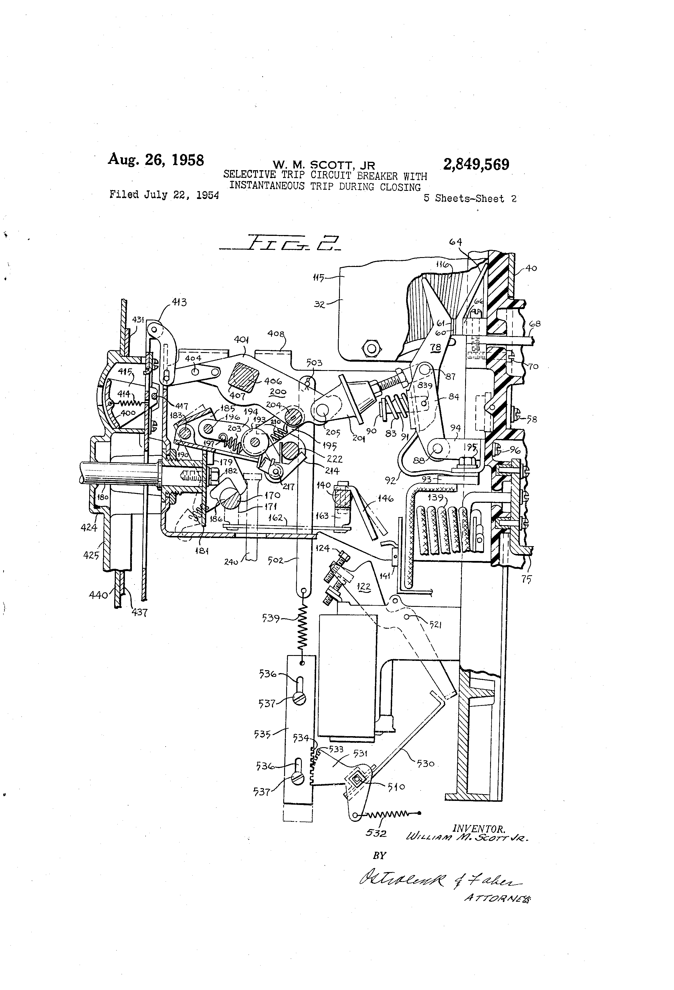 7 Figure 7 algo illustrates the trip-free operation of the circuit breaker. Thus, for e,.amrlc, vvhen the br--al@er is automatically closed by means of the control relay 300-301 and the closing solenoid 240-24-lL, the circuit brea"-er tlieii trip-f@-ce t'@-ic aoovo desc-ribed trip latch 170 is opened as soon as fault current flows through the contacts. That is, even though a continuous closing force may be applied to the breaker from the closing plunger 240 the circuit breaker will nevertheless trip-free, if the trip latch 170 is rotated. Ag heretofore noted, the trip latch 170 m@-,y b-- controlled by the overcurrent short time delay armature 142 or overcurrent long time delay armature 132. However, as heretofore noted my invention provides the breaker with an instantaneous armature 122 which is operative only during the closing operation by means of handle 184 or closin- means 300-301 and 240-24-i. If an attempt is made to either automatically close the breaker by means of the plunger 240 or manually close the breaker by means of the handle 134 on a fault line, the magnetic forces would tend to separate the cooperatin,@ contacts 60, 61. The opening magnetic forces on cooperating coiitacts 60, 61 may be greater than the closin.- force which is derived from the energy flowing in the closing solenoid 241 or may b,- great,-r th,,in the force derived when inaiaually closing by handle 184. I'Vithout my novel instantaneous armature arrangement, the circuit breaker contacts 60, 61 will tend to separate due to the magnetic forces, but the trip latch 170-186 will remain enga-@ed since there is a time do@ay on the armatures IL32 and 142 which controls the position of the trip latch. It is also possible that only the arcing contacts of the circuit breaker will engage, and remain in engagement since -cuit breaker there is an insufficient force to clos@ the cii. against a fault thereby dama-ing these contacts and the circuit breaker. Hence, the components will attempt to assume the positioli in Figure 6. However, since a closing force will be continuously applied, thereby driving the plunger 240 upwardly, a second attempt will be made and the above noted operation will be repeated. Hence, there will be chattering or pumping of th,- cooperating contacts which will result in damage to the circuit breaker and line to be protected thereby. Since the circuit breaker is constantly being made and brok,-n the armature 132 and 142 of the trip coil 139 will always be moved back to their neutral pogition. That is, the current will not be permitted to flow for a sufficient length of time to allow the armatures to move from their energized position agaiiast the time delay created by the timer arm 500 or dash pot 133. it is a primary object of my invention to provide a novel arrangement wherein the circuit breaker has in,stantaneous trip characteristics when it is being closed on a fault current and thereafter when the contacts are latched closed has either long or short time delay trip characteristics. As heretofore noted, I have provided the circuit breaker with an instantaneous trip armature 122 which is seen in Figures 1, 2, 7 and 8. A blocking means 530 is selectively positioned in the path of movement of the instantaneous trip armature 122. Thus, for example, as seen in Figure 1, when the circuit breaker contacts 60, 61 are in the open position the blockin@ means 530 is removed j'rom the pith of movement of the instantaneous trip arma'Ltire 12?. the -rnc.,.iiis 530 is not interposed in the path of thc, armature 122 until after the contacts have latched closed. Thus, as clearly seen in Figure 5, wherein the circuit breaker has tripped free, the instantaneous armature 122 is effective to trip the circuit breaker without delay since the blocking means 530 did not interfere with itsoperation. However, after the circu;t breaker contacts are latched closed, the blockin.- means 530 is interpoged,in the path 8 of movement of the armature 122 as clearly seen in Figure 2. 'T'he manne,@- in wl).ich the b@ockiii.- me-,iiis is ccntrolled and coordinated with the operation of the circuit breaker will now be described in connection with the Figures 1, 2 and 7. The blocking means 530 is rigidly secured to the common shaft 510 and hence rotation therewith. A bell crank- member 531 is also secured to the common shaft 510 and is provided wit'@i an extension arm to v@rhich a biiisid- spring 532 is secured to bias the shaft 510 in a counterclockwise direction. The other arm of the bell crank 531 is provided with a plurality of teeth 533 whicli are in en.-agement with th@- teeth 534 of the member 535. The rack 535 has a considerable mass and is guided iii a vei-tical path by its slots 536, which receive the statioiiary pins 537. Thus, as the heavy rack 535 is moved ul)wardly the ratchet 531 will be rotated in a clockwise 20 direction due to the engagement bet,,veen the teeth 533 and 534. This will cause the common shaft 510 to rotate in a clockwise direction thereby moving the blocking member 530 in a direction of the arrow 538 to a position where it will block the clockwise rotation of the instantaneous trip -armature 122. A helical sprin@- 539 is secured at oiie end to the surplus weight r-,ick 535 and at the opposite end to one end of rod 502. The opposite end of the rod is pivotally mounted on pin 503 to the movable link 200. Thus, wh-,,i the circiiit breaker contacts are in the open position of Figure 1, the rod 502 will be in its lowermost position and hence, the rack 535 will also be in itg lowermost position thereby rotating the ratchet 531 and the blocking means 530 to their clockwise position. In this position the mechanical blockin- means 530 is 0 out of the path of movement of the instantaneous trip armattire 122. It will be noted that both the gear train 535 and the biasing sprin@- 532 will tend to maintain the blocking means 530 in its uiiblocked position of Figure 1 until after the contacts 60, 61 have latched clos