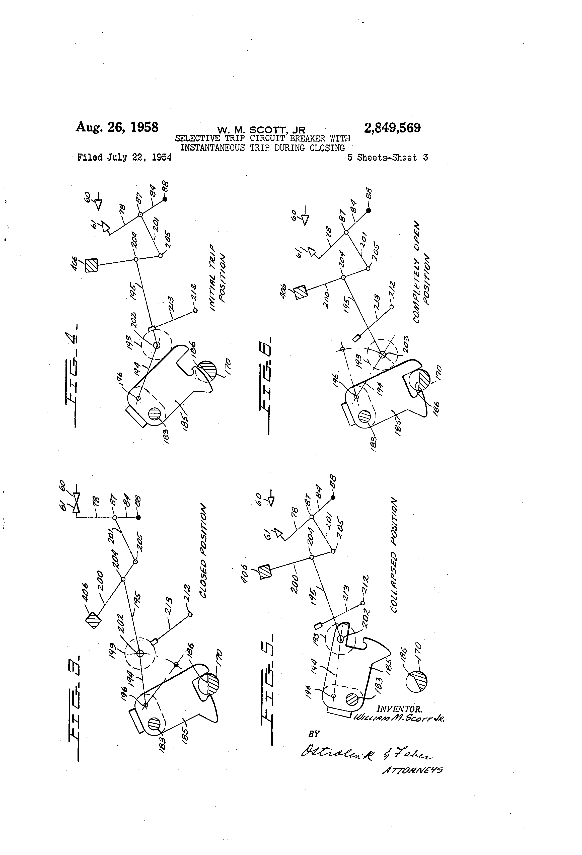 said circuit breaker to control and coordinate the movement of said blocking means with the operation of said circuit breaker, said means being comprised of a mass member which delays the movement of said blocking member to the path of said instantaneous armature until after said circuit breaker contacts have been moved from said initial en.- aged position to said final engaged position. 3. In a circuit breaker having a pair of cooperating contacts havin.a an initially closed position, a latched closed position and an open position, a tripping means operatively connected to said circuit breaker, said trip means being comprised of an instantaneous trip member and a time delay trip member; a mechanical blocking member for said instatitancous trip member, control means operatively connected to said blocking n-leans, said control m,-ans connected to and operated by said circuit breaker to move said blocking means out of and into the path of movement of said instantaneous trip member when said circuit breaker contacts are moved from sa;d latched closed position to said open position a-@id when circuit breaker contacts are moviiig from said open po-qition to said latched closed position; said control means includin- a spring means energized when said circuit breaker is moved from said op@n nosition to said initially closed position; said blocking mear@s bein.- moved into the path of movement of said instantaneous trip member by said sprin.- means when said circuit breaker is moved from said initially closed position to said latched closed pos, 'tion. 4. In a circuit interrupter having an initial closed positioti, a latched closed position ai-id an open position, trip means operatively conneeted to said circuit interrupter and beiiig comprised of a time delay member and an instantaneous member, a mechanical b'iocking means operatively connected with said instantareous member, a control mechanism conpected to said circuit interrupter and said blocking member, said control mechanism beilig comprised of a heavy mass member suspe@ided from a spring which is controlled by the operation of said circuit interrupter, said mass member being operatively connected to said blocking means to move said blocking means into the path of mov,-ment of said instantaneous mer-riber after said circuit interrupter has been moved past said i-,iitially closed position to said latched closed position; ,said mass member being operatively connected to said blocking means to maintain said blockin.- means out of the of movemetit of said instantancoiis member while @aid circu;t interrupter is being moved from said open position to said initially closed position Fnd encrgy is being stored in said spring. 5. In a circuit interrupter having an initially engaged 2,849,569 position, a finally engaged, a latched position and an opened position; said circuit iriterrupter having an instantaneous trip means; a blbcki-@imember operativ-@ly connected witli said ilista-@ita@-icous trip mears to selectively render said iiistanta-iieous trip member operative and inoperative; a first bia--ling member connected aiid positioned to be energized by the movem@ ent of said circuit interrupter from @said finally eiiga.-ed position to said open position, said first biasi-@i.- member connected to said 10 blockin.- means to move said blocking means to said op@@,r,,itive position; a second biasin.- member connected and operated by the movement of said circuit interrupter from said open position to said initially enga.-ed position, said @second biasing member connected and posi15 tioned to move said blocking men-iber to said inoperative rosition wheii said circuit interrupter has moved from said initial enga.-ed -t)osition to said iinally engaged position. 6. A circiiit interrupter having an initially closed, a 20 latched closed and an open position; a trip means operatively coniiected to said circuit iiiterrupter to automatically trip spid circuitinterr-upter from either said latched closed position or said initially closed position to said open posit-on; said trip means includin- a time delay trip member 25 and an instantaneous trip meml,)er; a blockin- rneans, a linkage i-neans and a biasin.- means; said linkage means including said biasing mea-iis aiid being oi)eratively coniiected to said blockitig means; said linl@age means being operatinely connected to said circi-iit interrupter to selec30 tively interpose s,-,id blockin- mepns in the Dath of movei-@ient of said instpntaneotis trip member; said linkage means operative to remove said blocking means from the path of moveme-@it of said instant@nTi--ous armature when said circuit interrupter is moved from s,-tid latched 35 closed to said open posit;on: said biasing means storinenergy Nvhen said circuit interriipter is rnoved from said open position to said initi,@@113, closed position; said blocking means remainin.- removed from the path of movement of said instaiitaneous trip memb@--r ivhile said circuit in40 terrupter is in sai@ initially closed nosition; saidbiasinmeans releasing its ener.-y through a portion of sail linkage means when said circuit ititerrupter is moved from said initially closed position to said latched closed position to thc-reby move said blocking means in the 4,@5 path of movement of said instantaneous -trip member. Cited in the of this patetit UNITED STATES PATENTS 2,393,736 Bennett et al - ----------- Jan. 29, 1946 50 2 483,602 Wallice et al - ----------- Oct. 4, 1949 2:696,536 C,,@g,,hall (@t al - -------- Dec. 7, 1954 2,709,731 MacNeill -------------- May 31, 1955