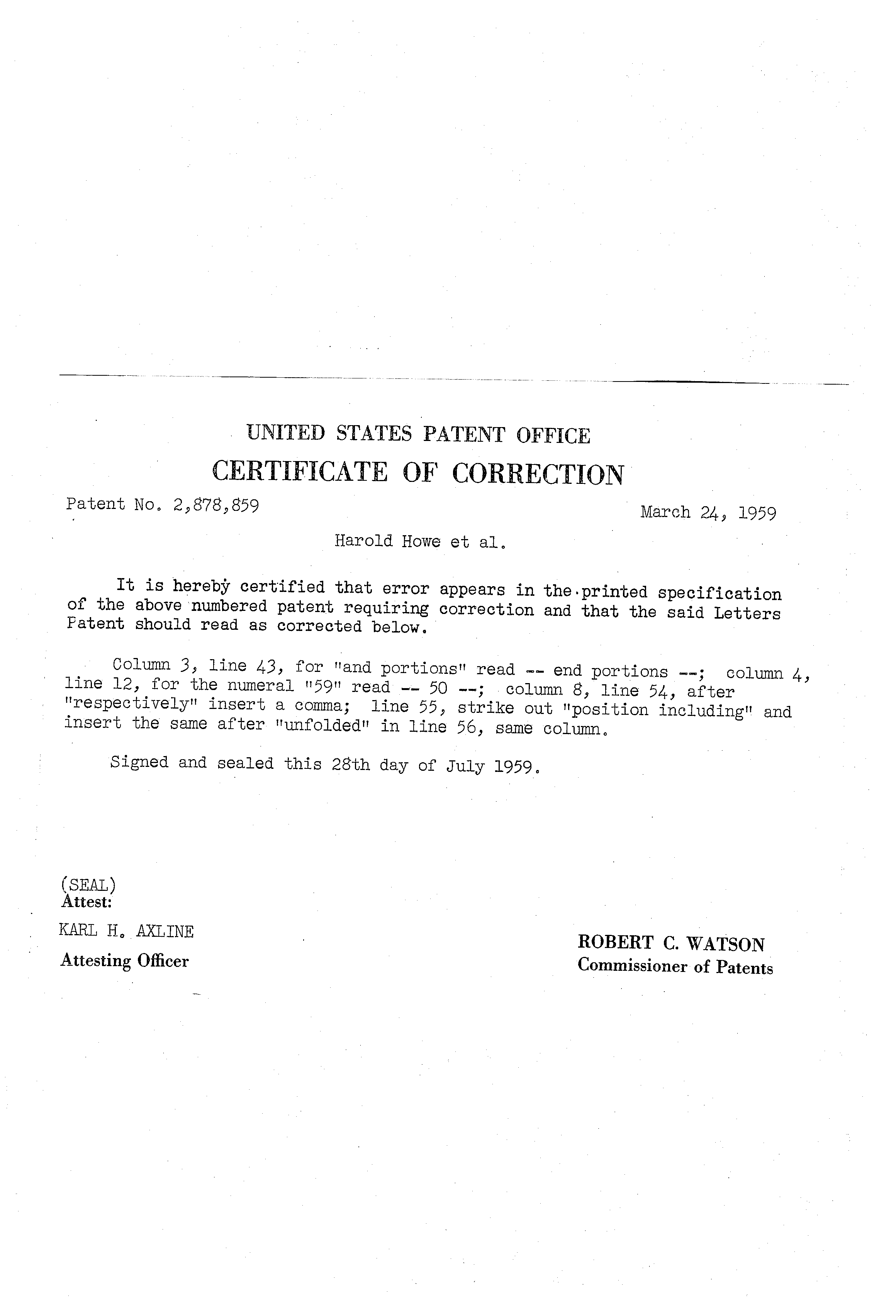 2 @ 8 7 8 , 8 5 9 United St,,-,ites Patetit Office 2,878,859 FOLDING TABLE AND BENCHES STRUCTURE 5 I-larold flowe, Rowayton, and Alan C. Burr, E2st Norwalk, Con.a., assignors to Howe Folding Furniture, Inc., Nevv Y rlr, N.Y., a corporation of New York 0 Application July 5, 1957, Serial No. 670,215 1 0 21 Claims. (Cl. 155-124) This invention relates to a folding table and benches 15 combination characterized in that th.- whole structure is automatically foldable along hinged transverse lines of fold from a horizontal operative position to a folde vertical position. Heretofore table and benches combinations have been 20 provided in which the table top has been either tiltable for converting a table top into a backrest for a bench; or the benches have been swingingly related to the top so that they can be swung up over the lateral edges of the top; or the structure has been divided into several sections 25 collapsible manually into several accordion-like folds, leaving some unexposed top surfaces when folded, making cleaning difficult. Previous attempts to provide a table and benches combination such that the whole structure may be automatically folded in un:lson along a transverse 3 0 hinge line, elevating the sa;d hinge line and drawing in the outer ends of the structure to a collapsed substantially vertical position, have failed. An object of this invention is to overcome the deficiencies of the prior art and provide a ftilly aiitomatic 3 15 table and benches folding structure. Another object of the invention is to provide support, brace and link m.-ans so interrelated that the heig4t of the structure when folded exceeds by a minimum the lengtli of one-half of the top, to facilitate moving the structure 4 0 through doorways. Another object of the invertion is to provide support .neans and link means cog@cting to provide leverage liftin-, t@,e bench parts as tic structure ipproaches coi-nplet.-ly folded position and raisiag ,heir lower ends. Anoth-,r object of the invention is to provide a table 45 aild benches combinaloia, having a lengtli on the order of 12' to 16' which is autlomatically fo-Idable as a unit along the hinged transverse mid-line of the structu're. Another object -of the invention is to provide s@uch a 50 structure in which the inner ends of the bench parts and the inner ends of the table top parts are interenga.-ed when in elevat@-d folded positio@i and thereby steadied against latern.1 or rotary i-,,ioveme,-lt. Another object of the invelition is to pro,vide a struc- 1 ttire of the kind described which may be either folded 55 upwardly along its hinged transverse mid-line or iinfolded with ease, due to unique balancing and spring and lever arrangements. Ano-ther object of the invention is to provide a structure of the kind descr;bed which Nvhen f Ided has a past 60 0 center frictional type of look resisting openi-,ig by a pull on a bench part, and thus preventin.- inaivertent and unauthorized unfolding, as by cliildren. Another object of the itiventio@,l is to provide - structure Of the kind described haviti.a ce-nter anci end support 65 means and interconnecting meaiis such that the structure can bo unf@ided by a force exerted downwardly from the transverse hinged line of fold. Another object of the invention is to provide a strticture of th.- kind described in which the, end support 70 means share the weight of the structure during the early Patetated M r. 24,,1,95@9 2 part of. the. foldi4g operation and the latter part of the iinfolding oppratipn, thus facilitating t4ese operations, and are raised from the floor during the latter part of the fqlding operation thus lifting their fixed castors clear @f the floor and allowing the u'nit to be moved in an y direction on the large swivelling cen.ter castor.s. Another o@bje@qt of the inv'@@ntion is to provide a stKiip7 ture of the kind described in which the two halves, are supported in folded position by single link mpans ex7 tending from a center support means to said halves speetiyely,. and means are als provi ed in pooiqg@ction with the. hi ge mea interconnectin th top. part , cpii ns g e s actiii.- wi.th extensions Qf tjip hinge, pins o the ;binge means interconnecting the parts of the benchps. r@@spe@@tii@ely @Q steady the s@ructure in,fol Qa po@ition. Another object Qf the invention is to provide means ooei-ative n@@ar the end of a folding qct@Q I n to rot4te tbi@ respective s,,ipport me4ns for the outler eads of t,h@@ gri@,c.tuire relative to the top parts to permit, (z!Qspr fpldinr of the. halves of the structure. and to achieve a past ce ter type of lock efiective until the said support- mi@ans are rotated relative to the top parts in the oppq@ite direction, Another object of the invention is to provide a stru tur-- of the above described type such that it may conipletely folded or unfolded by an operator standilng at one central point, on either side of th(@ unit, withollt requirin- hiin to go from end to end of the. unit, as I in the case of all, previous units of this gqneral type. Another objpct of the invention, is to proiide a, folding structur.e of the kind described which i,s simplo, dqrablg and efficient and may be easily moved when in folded position,. and which; then occupies a m . imum of floor space. @D The invention will best be understood if the,fQl@ow@ilgde.scription is read in connection with the di-awi4gs. i,n which: Fig. I is a side elevation of a structlir,e emb@odying t@he invention, in tinfoldfd position: Fig. 2 is a bottom plin view of the said. sttuctpre;, Fig. 3 is a perspective view showing the structura bqing folLIed; Fig. 4 is a side elevation showing the structure in full.ly folded position; Fig. 5 is a detail view partly in cross section of mea,ns by vihich the structure may be locked in unfolded i3osit,'@ o n; Fig. 6 is -- detail view partly in cross sectiqn sbo,,vi,ng a pin extei-ision of the bench hinge pin means rece@ived in a notch in hinge means joining the top parts thus interen