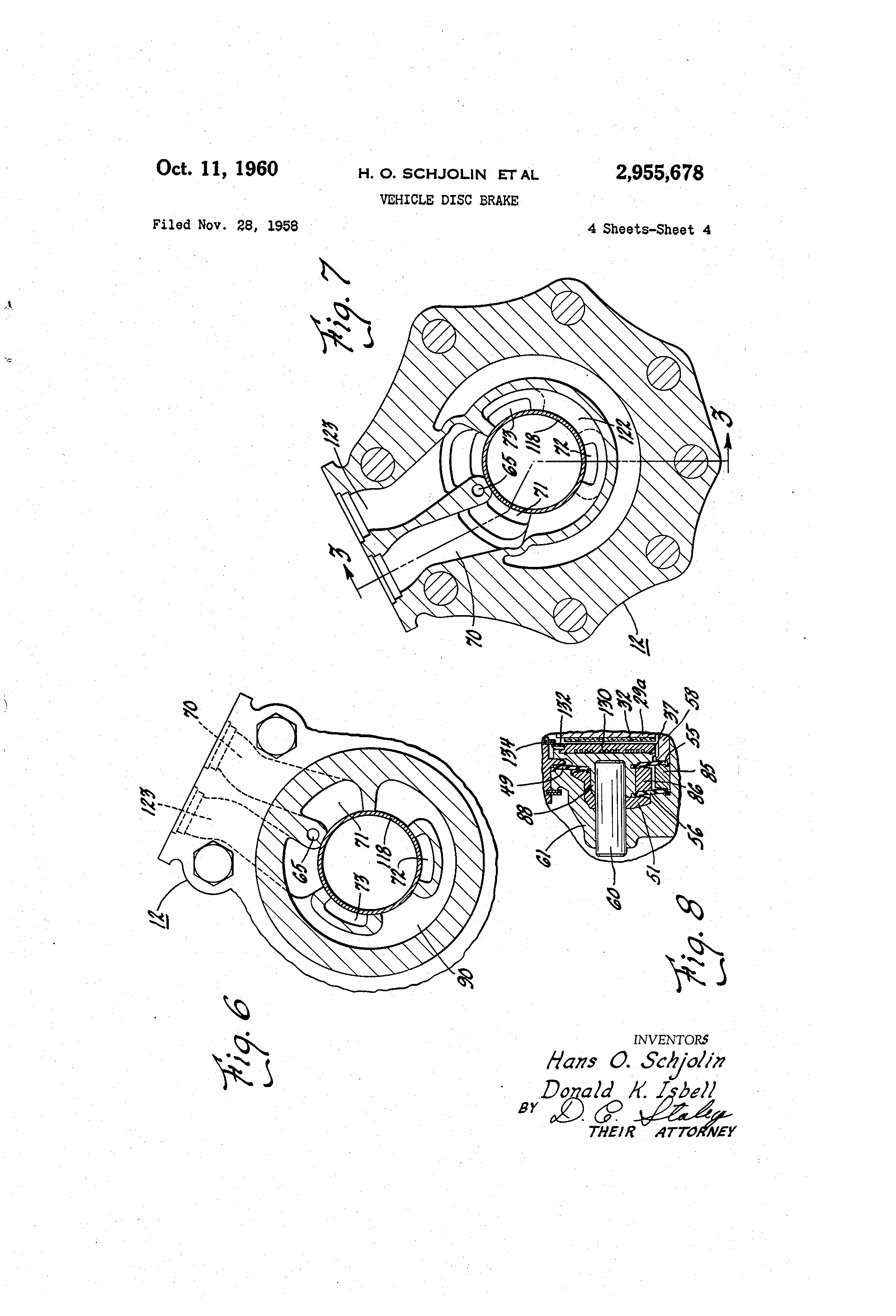 2 , 9 5 5 , 6 7 8 u d States Patent Office P a t e n t e d O c t . 1 1 , 1 9 6 0 2,955,678 VEHICLE DISC BRAKE 5 Hans 0. Schjolin, Birmingham and Donald K. Isbell, Ponltiac, Mich., assignors to General Motors Corporation, Detroit, Mich., a corporation of Delaware Filed Nov. 28, 1958, Ser. No. 777,052 10 8 Claims. (Cl. 188- 18) This invention relates to a vehicle disc brake or more 15 particularly to a fluid cocded and fluid actuated vehicle disc brake. Vehicle disc brakes require a means for compressing of the friction discs to accomplish a retarding force on the rotating discs engaging the stationary discs of the 20 vehicle brake. This is usually accomplished by me-s of a hydraulic wheel piston actuated by a pressurized fluid. A piston operating within a hydraulic cylinder creates 'a sealing @friction on the inner periphery of the hydraulic cylinder. This invention provides a fluid seal 25 with a fluid actuating means wherein the sealing friction is elitrinated. Where the cooling fluid of a ve-hicle disc brake is circulated oier the friction surface,, of the brake discs the fluid acts as a lubricant and lowers the coefficient of fric- 30 tion between the rotating iand stationary discs. A brake nieans wherein the brake surfaces could be kept dry and still provide circulation of the cooling fluid adjace-nt to the fluid disc provides greater braking efficiency. These purposes have been accomplished in this inven- 35 tion by means of a fluid wheel piston operating in co-- bination with a fluid wheel cylinder. The sealing rneans bet,@veen these two members is provided by a diaphragm which suspends the fluid actuating piston relative to the fluid actuating cylinder. Diapbragms are also employed 4:0 as a fluid seal for the cooling fluid for the vehicle disc brake. it is an object of this invention to provide vehicle disc brake which is fluid actuated and fluid cooled. It is another object of this invention to maintain a dry 45 surface between the frictionally engaged brake discs of the vehicle disc brake and fluid cooling means for cooling of the brake discs. It is a further object of this invention to Provide a vehicle disc brake which employs diaphragm sealing means 50 in the fluid cooling passage means, and the fluid artuating chatnber and passage means. It is @a further object of this invention to provide passage rneans froni an external fluid cooling and actuating circuit into the shaft housing means of the vehicle drive 55 shaft to tl-ie vehicle disc brake. The o@bjects of this invention are accomplished by means of providing passage means within the shaft housing wbich are connected to the extemal portion of the fluid actuating and fluid cooling circuits. The passages 6 0 leading to the inner periphery of the vehicle disc brake will provide for circulation of a cooling fluid through chambers which are adjacent to friction discs of the vehicle brake. Passage means are -also provided for the fluid artuat6,5 ing means and are in communication with the actuating chambers within the fluid wheel cylinders for actuating of the fluid pistons for frictionally engaging the brake discs. The fluid pistons are, sealed by means ic>f di,aptiragms to form fluid actuating chambers in the fluid 70 cylinders to provide a positive and flexible sea@l as the r,hamber volume increases or decreases during operation. 2 The hydraulic pistons have a plurality of guides to maintain a relative non-rotating position of the fluid pistons to the fluid cylinders. The whole brakin.- structure is enclosed within the hub section of the wheel and a housing means adjoinsthe hub section and extends to the outboard side of the braking structure. The braking structure is mounted within the outboard wheel of a dual wheel structure. This location provides for ease in dismantling of the braking structure from the outboard side of the wheel. Fur-ther objects and advantages of the present invention will be apparent from the following description, reference being had to the acconipanying drawings wherein preferred embodiments of the present invention are clearly shown. In the drawings: FigLire 1 is a cross section view of the vehicle disc brake viewed fro-m a line normal to the axis of the drive shaft. FigLire 2 is a side elevation view of the vehicle disc brake with various portions of the braking structure broken away to clarify the location of the various parts. The portiois which are broken away are on several planes. Their location will be more specifically pointed,out in the subsequent description. Figure 3 is a cross section view of the shaft housing which shows the conduit means extended through shaft housing to the inner periphery of the braking structure. Various parts are shown which are adjacent to or mounted on the shaft housing to show the fluid conduits within this portion of the brake. Figure 4 is a cross section view taken on line 4-4 of Figure 3. Figure 5 is a cross section view normal to the center line of the drive shaft or taken on line 5-5 of Figure 3. Figure 6 is a cross section view taken on line 6-6 of of Figure 3 showing the inlet and outlet passages in the shaft housing. Figure 7 is :a cross section view taken on line 7-7 of Figure 3 showing the inlet and outlet passages in the shaft housing. Figure 8 is a cross section view taken on line 8-8 of Figure 2. This view shows the alignment pin for aligning the fluid piston relative to the ffuid cylinder. The fluid disc brake illustrated in this application is intended to operato witti an external fluid system for actuating the vehicle brakes and an external fluid system for cooling of the vehicle brakes. The fluid actuating system is intended to be of ar@y conventional air operated means for actuating a disc brak-e. The fluid co(>Iing and actuating systems are disclosed in a copending application of the same assignee filed on November 28, 1958, Serial No. 776,896. Figure 1 is the aeneral structure of the vehicle disc brake. The housing for the drive shaft includ