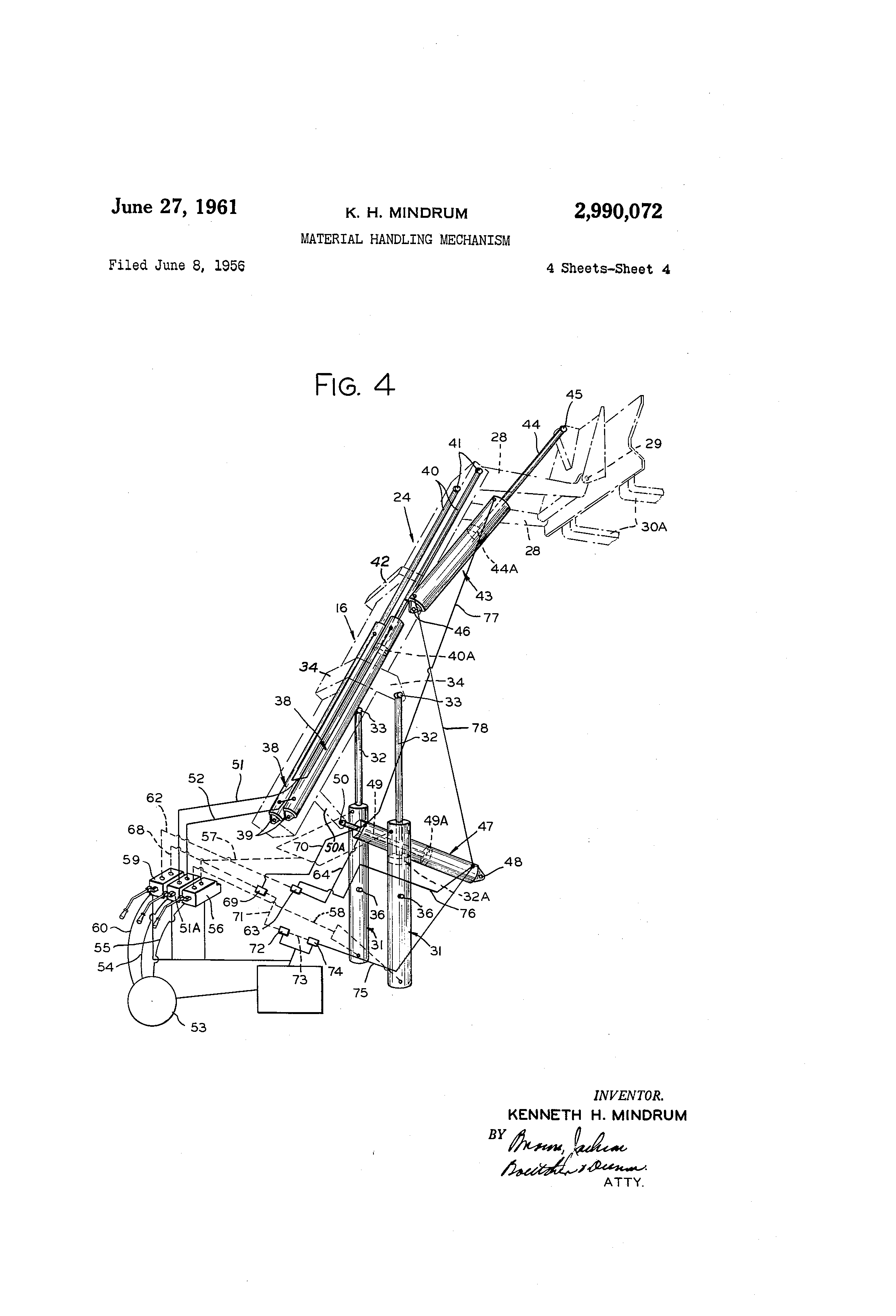 2 1 9 9 0 , 0 7 2 Ullited States Patent Office Patented June 27, 1961 2,900,072 MATERLA L ILANDLING MEICHANISM Kenneth H. Mindrum, Baffle Creek, Tdieh., assignor to Clark Equipment Company, a corporation of Mich. 5 igan FU . ed June 8, 1956, Ser. I No. 590,211 3 Claims. (CI. 214-IL40) T'his invention relates to materials handling, engaging and loading eq@uipment, particularly to such equipment 10 when 'mounted on a mobile vebicle such as a tractbr (>r the like and to novel and improved confr6l mechanism therefor. Conventionall y, such devices ha @e embodied a boom or mast pivotally mountedat one end to the forward 6nd 15 of the tractor and supporting a fork, shovel or other load en,@a,-Ing means pivotally mounted ori its oiher end and operating means in the forni of hydraulic rams or similarly operating mechanical means for independently raising and lowering the mast about its @pivotal connection 20 and tilting the load engaging means are also commonly provided. Successful operation of such devi= in loadin.- or other handling operations has been, however, largely dependent on the ability of the operator to move his tractor toward or away from the load in order to re@ich 25 or release the load. Under some circumstances, as when workin@ on rough terrain, this constitutes a real problem. Moreover, in raising and lowering the loaded fork, it is impgrtant to be able to maintain the angle of the fork either at parallel, i.e. 180 degrees with respect to the hori- 30 zontal or inclined,a few degrees therefrom to prevent premature dislodgin,a or dumping of the load. It is thus an important object of the present invention to provide a liff mechanism for a tractor or other vehicle by means of which its loading fork or other lo,ad engaging 35 means may be elevated and outwardly extended @and ro. tated to various positions of tilt. Another object of the invention is to provide such a lift mechanism with means whereby the load engaging means may be rotated to a given angle of tilt relative to 40 horiz6ntal and maintained in said angular relation during the raising and lowering or extension and retraciion Of the IDad supporting mast. Still another object of the invention is to provide -a lift mechanism for atractor or the like embodying an exten- 45 sible mast or boom pivotally connectable at one end to the tractor and supporting a loading fork or other engaging means at its outer end pivotally mounted thereon whereby the operator may, without moving his tractor, reach out with the load engaging means, retract and 50 raise and lower the same in addition to maintaining a given angle to which the load enaaging means has beeit . tilted during said raising, lowering, retractin.- and reaching out with the load engaging means. A further object is to provide in combination with such 55 a pivotally mounted extensible mast and load engaging means, a pair of cylinders, one being a slave cylinder and the otber a tilt cylinder, which are interconnected with each other and individually mounted between the vehicle and a fixed por-tion of the mast and between the 60 movable portion of the mast and said load engaging means in a manner such that change in pressure in one is accompanied by an opposite change of p@ressure in the other cylinder whereby in the raising, lowering, pivoting and extending of the mast the an,-ular relation of the load 65 engaging means to the horizontal will remain constant or substantially so. Still another object is to provide means whereby the pressure in the tilt cylinder, which is mounted between the extensible por-tion of the mast and the load engagirig 70 means, may be varied independently of and without effecting a simultaneous change in @the slave cylinder so as 2 to tilt the load engaging means to a new angle when desir@d. Still another ;object is to provide compensating means for ,iutomatically redistributing fluid on opposite sides of the plunger in the slave cylinder when the plunger is actuated by the raising or lowering of the mast and the load engaging means has been pieviously so tilted about its pivot -,is to move the pl-ung&r in the iilt cylinder to a p!osition where the tilt cylinder will not respond to demand for inore fluid by the slave cylinder. M@ny other objects and advantages of the invention will become apparent from the description of a preferred erilbodiment: of the invention which follows. It is furtiier to' be understood that many changes and modificati'ons of the embodiment of the invention as hereinafter d6scribed -may be had without dep-arting from the spirit of the invention as defined in the appended claims. Now referrin.- t6,the drawings: FIGURE I is a side elevational view of -a trartor having a material loading, lifting or handling mechanism a@eording to the present invention mounted on the, forward end thereof; FIGURE 2 is a plan of the embodiment of my invention as shown in FIGURE 1; FIGURE 3 is a view taken along lines 3-3 in FIGURE 1 looking in the direction indicated by the arrows; FIGURE 4 is a view somewliat diagrammatic of the lo@ding or lifting mechanism separa@ted from the tractor and showing the hydraulic piping and cylinders to, effect the various required motions; and FIGURE 5 is an enlarged f-r-agmentary and diagrammatic showing of the two interconnected slave cylinders and the operating means and pressure relief means employed in conjunction therewith. Referring to said several views wherein like parts are identified by like reference numerals and first to FIGURE 1, a materials lo-ading, lifting or handling device is illustrated as comprising an extensible mast 11 pivotally connected :as dt 12 to a mobile vebiele such as tractor 13 h@ving a pair of front wheels 14 and a pair of rear wheels 15 steeringly operated by means and suitable linkage, not shown. Extensible mast 11 is thus illustrated as wheel or tractor-bdrne, and it is to be understood that in keeping with the spirit, of the in@vention extensible mast 11 might be pivotally mounted t