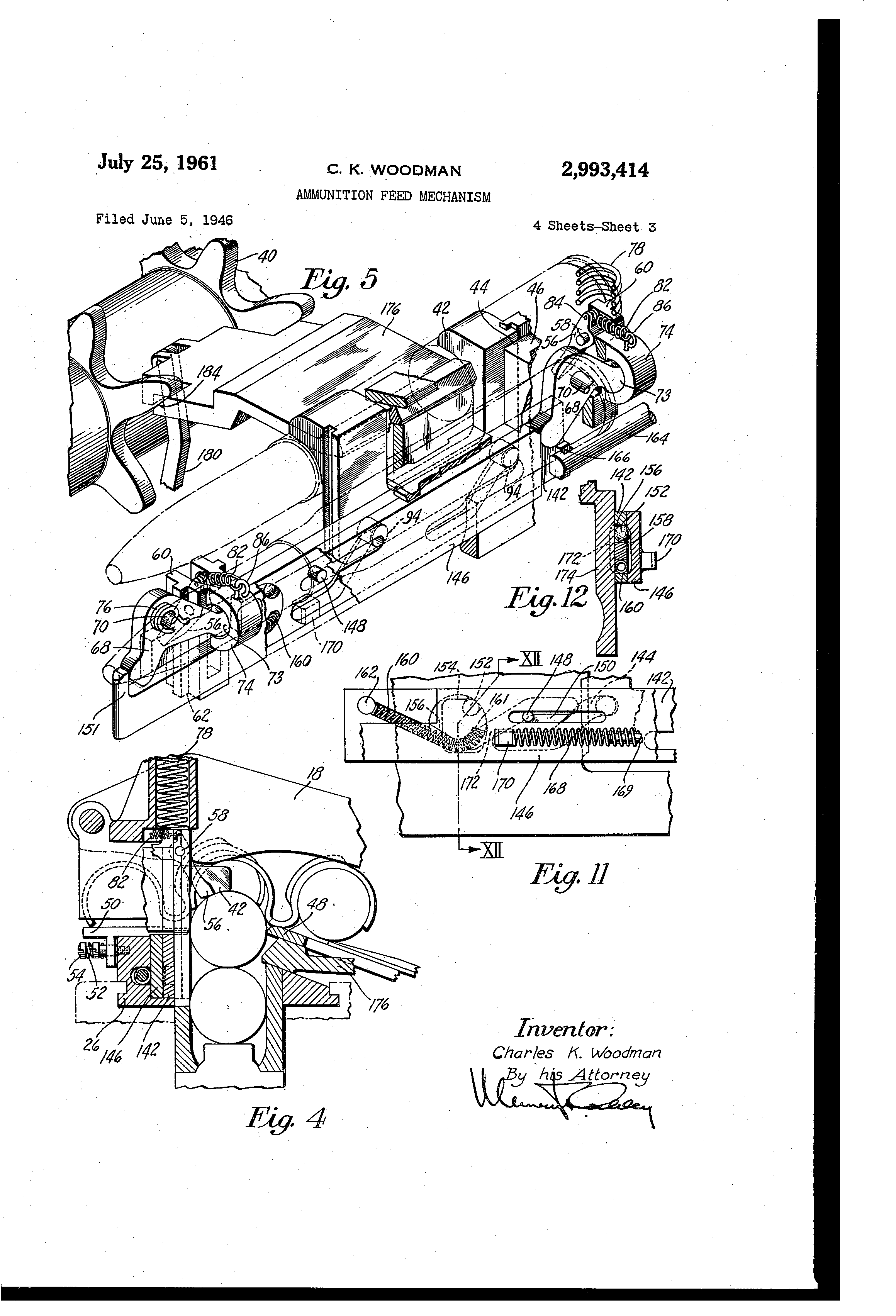 7 Motor control Power is supplied to the gun and to the motor 28 from a remote station from which connections are made to a junction box 186 (FIG. 1) attached to the front of the feed mechanism. Wires run from the junction box to the motor switch 188 and to a firing solenoid 190. The motor circuit is opened periodically during operation of the feed mechanism in the manner now to be described. A spring-torsion microswitch 192 carried by a bracket 194 (FIG. 2) secured to the housing 36 acts to open the motor circuit when the spring 38 has been wound. The switch is controlled by a nut 196. The nut 196 is threaded onto a screw (not shown) forming the end of the feed shaft 32 and is keyed in the sprocket tube 34. Threaded into the nut is a switch engaging stud 198 which may be adjusted relatively to the nut and which is held in adjusted position by a locknut. As the spring 38 is wound, the nut 196 travels outward on the rotatin- shaft 32. When the spring 38 has been fully wound, the stud 198 has reached its positio-.1 in which it contacts the switr-h 192 thus opening the motor circuit and terminating the movement of the feed shaft 32. As soon as the energy of the spring has been depleted by imparting feed movement to the sprocket tube, the stud 198 is moved out of engagement with the switch by reverse movement of the nut, permitting the motor circuit to be closed again so that the spring 38 can berewound. When the last round in the belt has passed beyond the control of the sprockets 40, the sprockets can no longer exert force to bring the rounds remaining in the belt into position above the feeder mouth. This might lead to a jamming of the gun. Hence, a safety or last round microswitch 200 (FIG, 13) is provided which opens the firing solenoid circuit and the motor circuit when the last round is engaged by the sprockets 40. The switch 200 is secured in the frame 10 adjacent to the ammunition mouth 12 and is controlled by a trip plate 202 (FIGS. I and 13) which is mounted to swing about a pin 204 (FIG. 13) in the frame 10 and is normally held in raised position by a spring 206 surrounding the pin. As the belt passes into the feed mechanism through the ammunition mouth 12, the trip plate 202 is depressed by the belt a ca,m face 208 on the plate acting to close the switch ioo and thus to close the motor and firing solenoid circuits. The sprin- 206 raises the plate 202 when the last round from the belt has passed beyond the plate permitting the switch to be opened and to interrupt the motor circuit and the firing circuit. Operation eed The horizontal feed, the stripper, and the vertical f units cooperate effectively in the manner described to provide the gun with ammunition at the rate required by the gun from a belt of considerable length and weight, i.e. containing 100 rounds. In order to facilitate an understanding of the operation of the feed mechanism, it may be assumed that an ammunition belt is passing throtigh the feed mechanism, that the first or leadin.- round in the belt is in a position of engagement with the stripper, that a loose round rests on the closed breech bolt, and that a round is in the chamber and about to be fired (see FIG. 3). Upon firing the gun, the recoil moves the carn bar 88 or 142, 146 rearward longitudinally of the gun, causing the stripper 42 to move downward to strip the leading round from the belt. Simultaneously, the vertical feed fingers 56 are moved upward into position to assume control of the round for the vertical feed, the fingers yielding inward as they pass the round. After five-eighths of an inch of recoil the fingers 56 are released for downward movement under the action of their springs 76, 78 and now press the round just released from the belt and the loose round thereunder downward against the rearward moving breech bolt as shown in FIG. 4. The empty case is ejected in known manner during the recoil movement of the gun. When the bolt has reached 2,993,414 8 a position in which it has passed to the -rear of the two loose rounds, the feed fingers 56 move the two rounds downward, the lower round being brought into its position on the lips 17 of the feeder mouth, from where it can be picked up by the forward movin- breech bolt during the counterrecoil of the gun. As soon as the upper round has been moved downward vertically out of the path of the escapement slide, the spring 38 is free to rotate the sprockets 40 to impart a horizontal feed move10 ment to the belt in order to brin.- the next round into position under the stripper. Tle freed link is ejected through a link chute forined in the cover 66, by the pressure of the belt. Upon completion of the counterrecoil movement the lowermost round has been cham15 bered, the cam bar has been returned to its initial position in preparation for the next cycle, and the parts assume the position first described. Having described my invention, what I clairn as new and desire to secure by Letters Patent of the, United 20 States is: 1. In an ammunition feed mechanism adapted to be mounted on a longitudinally reciprocable automatic gun to feed cartridges from a linked belt to the gun, a feeder mouth, a stripper for engaging a cartridge above the 25 feeder mouth, a cam bar movable with the recoiling gun for positively moving the stripper in a vertical direction to strip the cartridge from the belt, a link plate for supporting the cartridge in preparation for the stripping action, and a spring normally holding said plate in car30 tridge supporting position and permittin- it to yield during the stripping movement of the stripper. 2. In an amrnunition feed mechanism adapted to be mounted on an automatic gun to feed cartridges from a linked belt to the gun, the combination of a feeder 35 mouth, a stripper for engaging a cartridge above the feeder mouth and adapted to move in a vertical direction to strip the cartridge from the belt, feed fingers moving in a vertical direction into feed position above the stripped cartrid