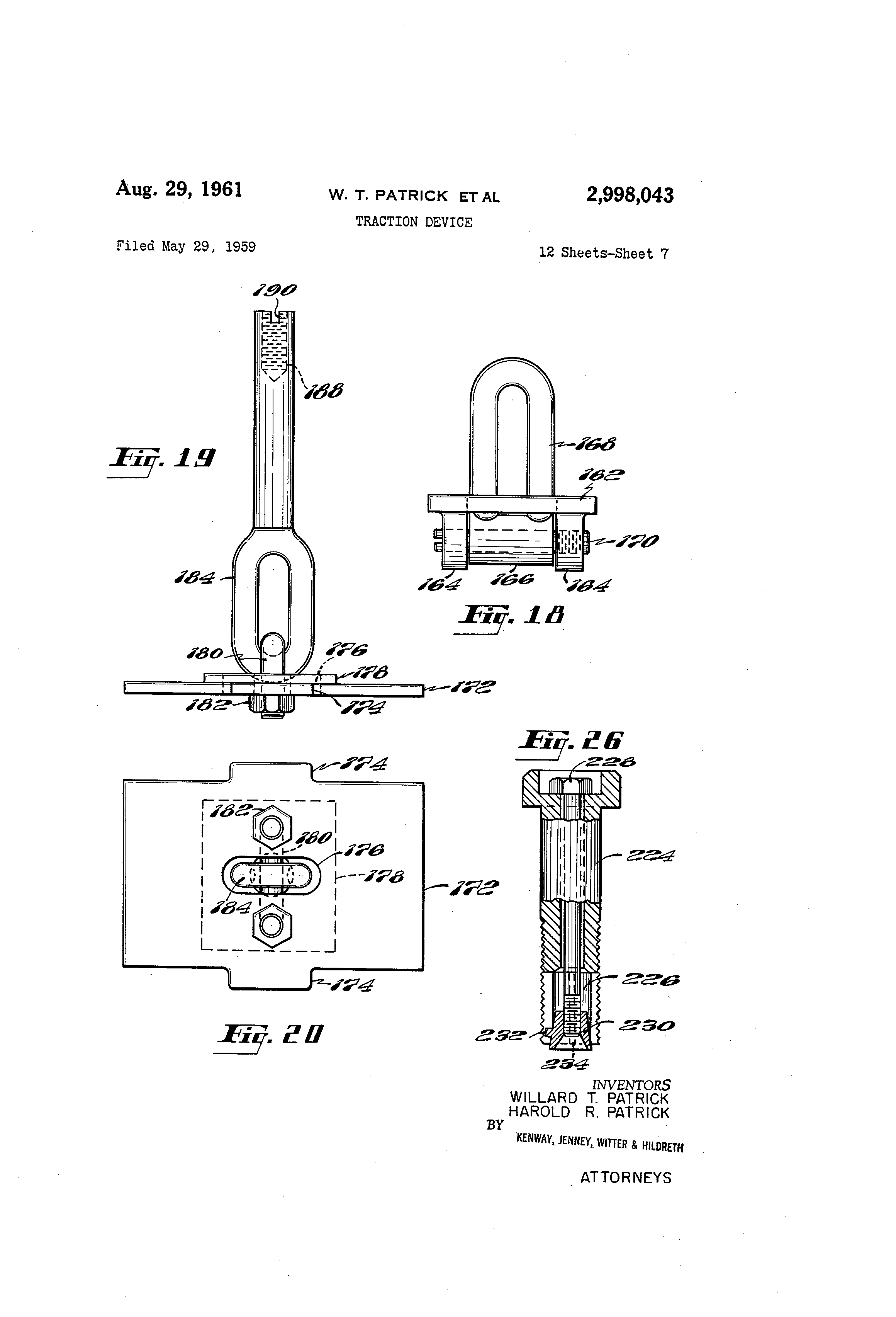 Letters Patent: 65 1. Traction means for a dual tire wheel assembly including,anchoring means mounted between the wheels of said assembly, at least one traction shoe disposed transversely across tires mounted on said wheels, a connecting member radially disposed between said tires for joining said shoe to said anchoring means, said connecting mem70 ber permitting radial movement of said shoe as well as angular deflection thereof, and guide elements coupled to said shoe f(>r orienting said shoe relative to said tire, said guide elements being adjustable according to the @pace between fa-.ing side walls of said tires. 5 2. Tra-.tion means for a dual tire wheel assembly in- 9 cluding anchoring means mounted between the wheels of said assembly, at least one traction shoe disposed transversely across tires mounted on said wheels, connecting means disposed along a radius between said tires to connect said traction shoe to said anchoring means, said connecting means bein.- adapted to hold said shoe against said tire and to permit said shoe to pivot about a point along said radi:us, and guide elements coupled to said shoe for orienting said shoe relative to said tire, said guide elements bein.- adjustable according to the spac-, between facing side walls of said tires. 3. Traction means for a dual tire wheel assembly including anchoring means mounted between the wheels of said assembly, at least one traction shoe disposed transversely across tires mounted on said wheels, a connecting member radially disposed between said tires for joining said shoe to said anchoring means, said connecting member pivotally and flexingly engaging said shoe and said anchoring means to permit radial movement of said shoe as well as an.-ular deflection thereof, and guide elements coupled to said shoe for orienting said shoe relative to said tires. 4. Traction means for a dual tire wheel assembly including anchorin.@ means mounted between the wheels of said assembly, at least one traction shoe disposed transversely across tires mounted on said Nvheels, an adjustable connecting member radially disposed between said ti-res for joining said shoe to said anchoring means, said connecting member permitting radial movement of said shoe as well as angular deflection thereof, and guide elements coupled to said shoe for orienting said shoe relative to said tires, said -uide elements bein.- adjustable according to the space between facing side walls of said tires. 5. Traction means for a dual tire disc wheel assembly including an annular plate mounted between wheels of said assembly, at least one traction shoe disposed transversely across tires mounted on said wheels, an adjustable connecting member radially disposed between said tires for joining said shoe to said plate, said connecting member pivotally and flexingly engaging said shoe and said annular plate to permit said shoe to move radially in and out with said tire and to deflect angularly in response to uneven deformation of said tires, and guide elements coupled @to said shoe for orienting said shoe relative to said tires. 6. Traction means for a dual tire spoke wheel assembly includina spoke wheel, rims mounted on said wheel, tires mounted on said rims, an annular spacer mounted between said rims, at least one traction shoe disposed transversely across said tires, at least one adjustable connecting member radiahy disposed between said tires for joining said shoe to said spacer, said connecting member flexingly engaging said shoe and said spacer to permit said shoe to move radiary in and out with said tires and to deflect angularly in response to une-ven deformation of said tires, and guide elements depending from said shoe for orienting said shoe relative to said tires. 7. Traction means for a dual tire wheel assembly including anchorin.- means mounted between wheels of said assembly, tires mounted on said wheels, said anchorinmeans provided with at least one countersunk opening, at least one traction shoe disposed transversely across said tires, a countersunk opening formed in said shoe, a trod provided with threads at both ends, said rod passing through an opening in said anchoring means and the opening in said shoe, ball seats formed in said shoe and said anchorin- means, balled nuts engaging said rod and received in said ball seats, said ball seats and said balled nuts thereby permitting said traction shoe to deflect angtlarly and move in and out along said rod in Tesponse to the movement of said tires. 8. Traction means for a dual tire wheel assembly including an annular band mounted concentrically between wheels of said assembly, tires mounted on said wheels, said annular band provided with at least one radially ex2,908,043 10 tending pad eye se@,ure@ t-o the outer surface thereof, at least one traction shoe disposed transversely across said tires, a conneoting member provided at one end with a swivel joint for connection with said traction shoe and provided at the other end with a hook for engagement with said pad eye, said connecting member further provided with means for adjusting the effective length of said member. 9. Traction means for a dual tire wheel assembly in10 cluding anchoring means mounted between wheels of said assembly, tires mounted on said wheels, said anchoring means provided with at least one countersunk opening and a baU seat fonned therein, at least one traction shoe disposed transversely across said tires, a connecting member 15 including a length of bxaided wire rope having a ball secured to one end and a post secured to the other e-.id, said ball received in a swivel device connected to said shoe, said post passing through the opening in said anchoring means and provided with a threaded end portion to 20 receive a balled nut, said post being slotted at its end to receive a tool to hold said post against rotation while said nut is being turned. 10. Traction means for a dug tire wheel assembly including anchoring means mounted between wheel