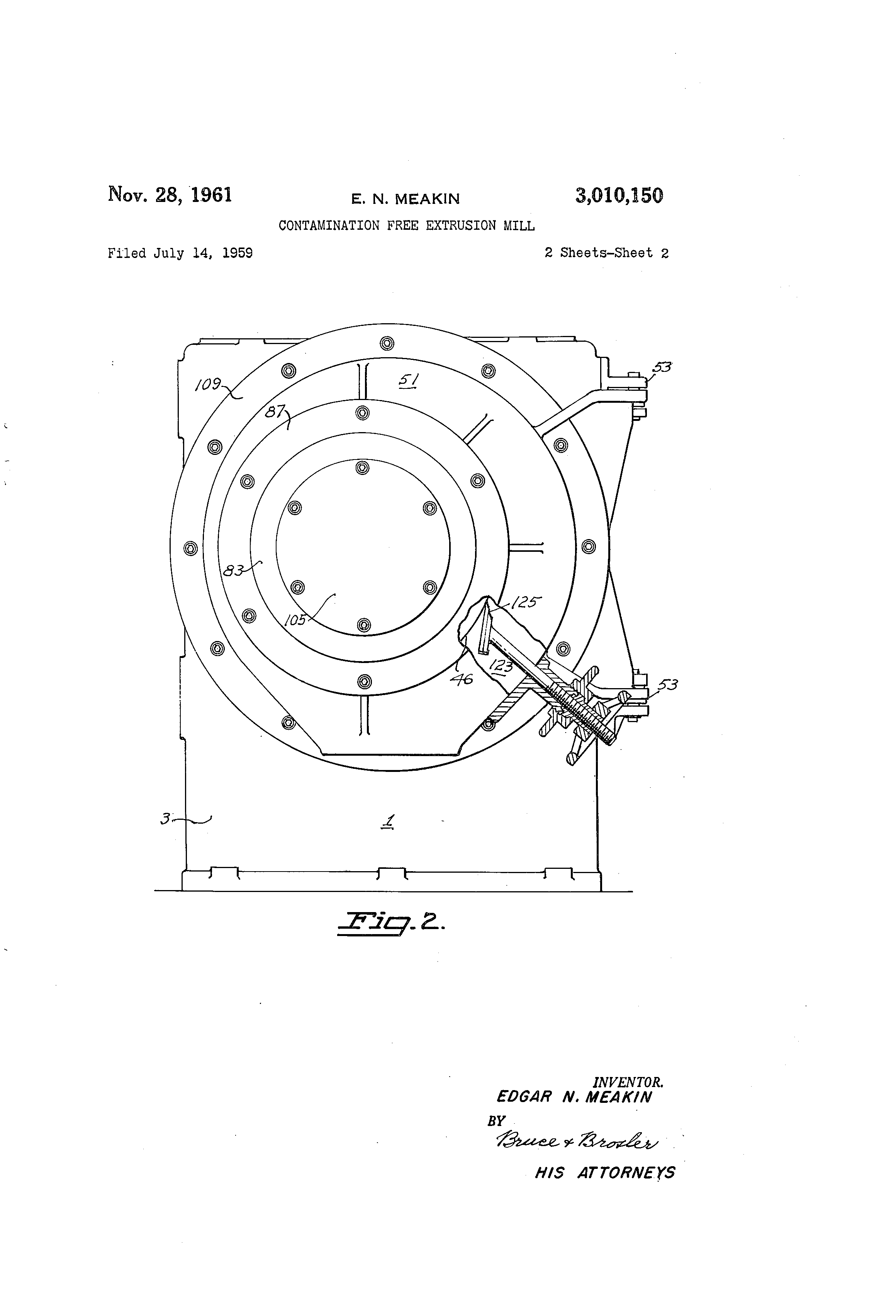 claim: 1. An extrusion mill cor@iprising a housing havipg front and Tear walls, a hollow shaft rotatably supported by said walls and extending beyond said front wall, a ring die @rarried on an end of said hollow shaft beyond and adjacent said front wall, a door hinged to said housing and adapted to enclose said die and engage the edge thereof to complete a die charnber, extrusion means within said die chamber carried by said door and adapted for with10 drawal with opening of said d-oor, and means for feeding extrudable material through said hollow sha@ft into said die chamber for extrusion through said die. 2. An extrusion mill coniprisin.- a housi@-ig havin.- front aiid rear walls, -a hollow shaft rotatably supported by 15 gaid walls and having a flange at one end beyond and adjacent said front wall, a ring die carried by said flarge, a door hin.-ed to said housing and adapted to enclose said die and engage the ed,-e thereof to coniplete a die chpmber, ex-trusion means within said die chamber carried 20 by said door and adapted for Nvithdrawal Nvith opening of said door, and means for feeding extrudable material through said hollow shaft into said die chamber for extrusion through said die, said feed means inelliding a feed screw lying within said hollow shaft and extending beyond 25 ihe other end thereof, and a feed screw housin.- for the extended por-tion of said feed screw, said screw hoiisin.including a feed hopper, and means for rotating said holiow shaft and said feed sr-rew. 3. An extrusionmill comprising a housing having froiit 30 and -rear walls, a hollow shaft ratatably supported by said walls and having a flange at one end beyond and adjacent said front wall, a rin.- die carried by s-,tid flan---e, a chatnber type door hinged to said housing atid adapted to enclose said die to form an extruded product cham35 ber thereabout and to engage the edge of said die to complete a die chamber, extrusion means within said die chimber, means for feedingextrudable material tliroiigh said hollow shaft into said die chamber for extrusior, through said die, and means for protecting the rotatable 40 shaft supportin-, means of said front wall from material in said extruded product cliamber, said protecting means including a block,:ng wall affixed to said flange and extending substantially to the inner peripheral wall surface of said extrusion chamber, a Tib along sa@d inner 45 peripheral wall surface adjacent said bloeling wall, and a shropd on said blocking wall overhan@ging said rib. 4. An extrusion mill comprising a housing having front and Tear walls, a hollgw shaft rotatably supported by said walls and extending beyond said front wall, a ring 50 die carried on an end of said shaft beyond and adjacent said front wall, a door hinged to said housing and adapted to enclose said die and engage the edge thereof to com@plete a die chamber, extrusion means within said die chamber, said extrusion means includin.- a roll fixli5 edly secured to a shaft extending through said door, bearing means carried by said door externally of said die chamber for rotatably supporting said roll shaft, and means fo@r feeding extrudable niaterial throu,-h said hollow shaft into said die chamber for eytrusion through 60 said die. 5. An extrusion mill con-iprisin-.- a housing havin.a front and rear walls; a bearing assembly in said front wall; a bearing assembly in said rear wall in ali.- nment with said -first bearing assembly; a hollow shaft passing through and 65 supported by said bearing assemblies; said hollow shaft having a flan,@e at one end beyond and adjacent said fi-ont wall; a ring die carried by said flange; a chamber type door hinged to said housing and adapted to enclose said ring die and engage the ed,@e of said die to complete a 70 die chamber and at the same time form an extruded product chamber about said die, said door havin- an external cylindrical flange on the front wall thereo and an insert in the front wall havin.- an opening concentric witli sa;d cylindrical Range and a discharge opening at the 7r, lower@end of said door; extrusioi means supported with- in said cylindrical flaige and extending tlirough said door ope-iiing into said die chamber, said extrusion means includin.- a sle.-ve fittin.- into said cylindrical flan,-e and removably secured therein, spaced bearings within said sle-@ve, a shaft jolrnalled in said bearings and extendin.into said dia chamber, and an extrusion roll affixed to said shaft within said die chamber, said shaft having a flange adjacent said door; leak seal means between the ed-e of said shaft flange and said sleeve and between said shaft flan.-e and said door insert; said door, at the lowermost point of the junction of said cylindrical flange and door insert, having a passage for discharge of material escapin.- past said seals; and means for feeding ext-rudable material into said die chamber, said means including a feed screw lying within said hollow shaft and protruding beyond the back wall supported end of said hollow shaft, and a screw housin.- for the extended portion of said feed screw. 6. A pellet mill comprising a cylindrical die, means rc-tatably supporting said die at one end thereof, a closure for the opposite end of said die, an extrusion roll 3,010,150 6 supportir@g shaft journalled in said closure with the roll supporting end of shaft terminating within said die and the opposite end terminating in said closure, an extrusion roll fixedly mounted on said shaft within said die and i-,i extrusion engagement therewith, means for driving said die, and means for adjusting said extrusion roll with respect to the proximate surface of said die, said adjusting means compris;n,- a bearing housing on said -,Iosure, a bearing assembly in said bearin.- housi-@ig and including an 10 angularly adjustable eccentric bu@-,hing and spaced roller bearings surrounding the associated roll supporting shaft within said eccentric bushing, whereby angular rotation of said eccentr