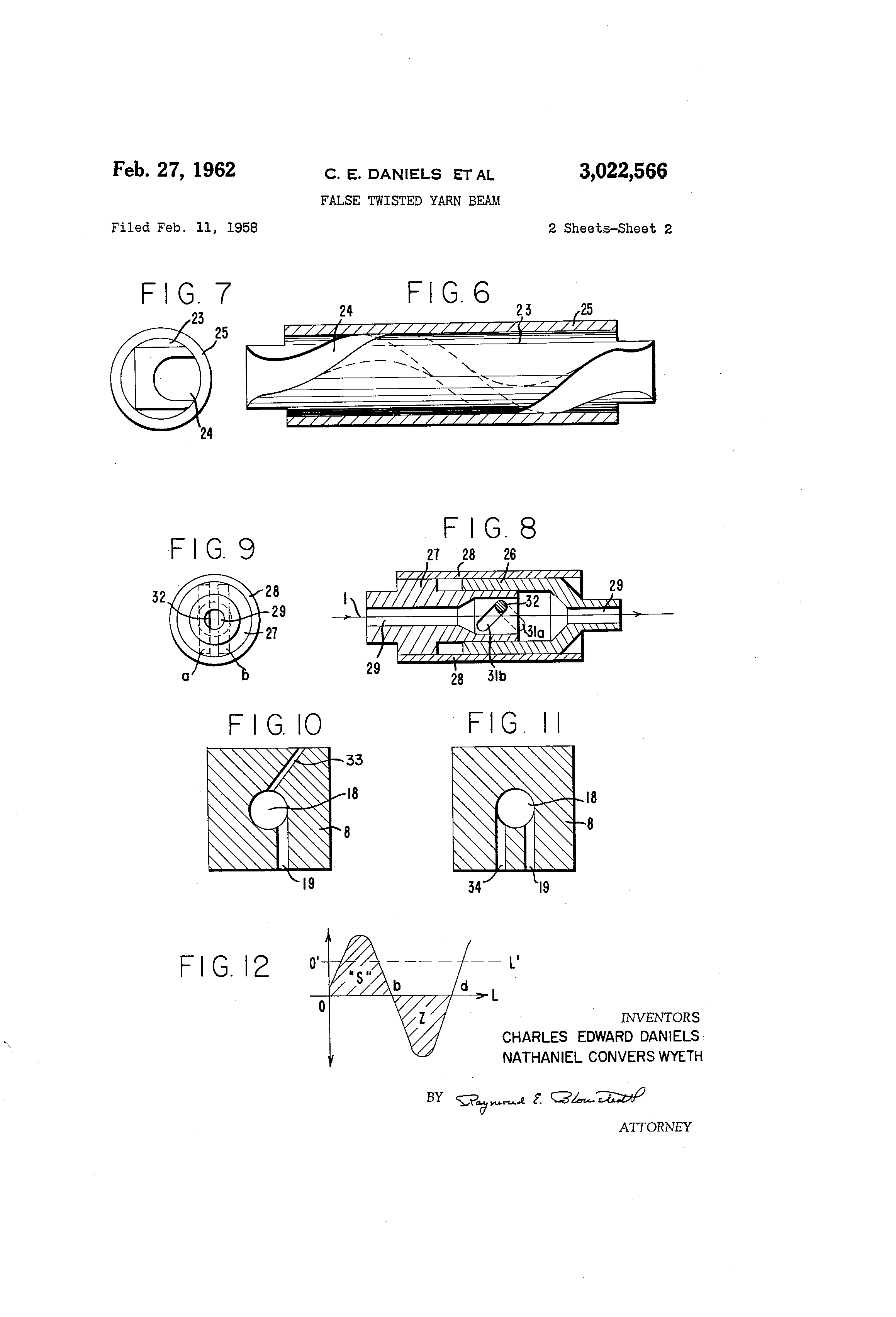 3,022,566 13 on a rotating spindle. The shortest beam-to-tension rofl (a form of snubbing guide) distance is about 5 feet. Twist removal is substantially co@-r.-t.)lete up to about 0.6 t.p.i., above which, however, twist removal becomes progressively less complete, as evidenced by t,,vist variation in the downtwisl,ed product. For example, when the average residual twist in the yarn is about 0.2 t.p.i. of alternatin.a twist, the net twist variation in the downtwisted product is at once about 0.4 t.p.i., which occurs in addition to the twist variability which normally occurs in 'Lhe downtwister packa.-e (pim). Such twist variation is highly detrimental to Lhe performance characteristics of the yarn in demandin.- industrial applications, e.g., in tire cord. However, by increasing +he average twist level to above about 0.8 t.p.i., some twist retention occurs. Retention of twist may be highly desirable in many applications, e.g., in textile uses. Progressively more twist retention occurs as the average twist level is further increased. The process of this invention has been illustrated by intermiftent unidirectional twisting (Examples 1 and 3) and intermittent two-directional twisting (Example 2). Thou.-h less desirable, it is also possible to apply an alternating twist to a running yarn line with the application of unidirectional twistin.- by periodically varying the yam tension, speed, the twister speed, or the upstream guide distance. Moreover, such twisting may be accomp'Ashed by utilizin@ upstream setting means, i.e., by employin.plasticizin.- agents (e.g., heat or solvent) upstream from the twister so that the yarn is twisted while in the plastic or semi-plastic state. Upon passing such setting means, the yarn becomes "set" in the twisted confi-,Uration. Twistsetting also occurs on the beam when a dry-spun yam (e.g., cellulose acetate) containing residual solvent is packaged, since such a yarn is twisted while in the semi-plastic state. Eventual evaporation of the residual solvent leads to twist settin,@. Twist which has been "set" may be relieved by increasing the yam tension during backwinding. Twist may be releasably held by slashing. Many species of mechanical or pneumatic twisters may be employed in carrying oull the process of this inventionFor example, in FIGURES 10 and 11 are shown variations of the pneumatic twister of FIGURE 2 which are useful in the "warp twisting" applications. In FIGURE 10 is shown the twister 3 having twisting section IS and fluid conduit 19 as in FIGURE 2. A yam string-up slot 33 is cut throughout the length of the twister 8. In operation, air entering throu.-h conduit 19 serves to screen the strin.--up slot, so that the twister operates at full efficiency. This twister is ideafly suited for spinbeaming where rapid string-up and continuous operation are prerequisites. Tn FIGURE 11 is shown the twister 8 having twisting section 18, fluid conduit 19, and the additional fILid conduit 34. In operation, air enters the tw;ster 8 alternately through fluid conduit 19 and fluid conduit 34. Operation is similar to that of the mechanical tnvister in Example 2, i.e., resembles intermittent unidirectional twisting through onehalf of the twistin.@ cycle; during completion of the cycle, fluid enters the twister through the opposite fluid conduit, thereby positively applyin.- twist of the opposite direction onto the yam being packaged. The twister Of FIGURE 11 has an additional advanta-e, namely, that twisting in any given direction may be carried out for Ion.-er times before the initiation of an equilibrium twisting condition. Fluid supply may be provided to the twister Of FIGURE 11 by use of rotary valve means, or by suitable mod;fication of the apparatus of FIGURES 5-5a. The process of this invention is applicable to any continuous multifilament yarn, such as poly(hexamethylene adidamide), poly(e-caprolactam), or other polyamides, polyesters, such as poly(ethylene terephthalate), POIY(acrylonitrile), or its copolymers, and other polyacrylates, regenerated cellulose (rayon) or protein, cellulose acetate, poly(vinyl chloride or acetate), poly(vinylidene cyanide or chloride), any suitable copolymers of the foregoing materials, glass and many other fiber-forming compos,@- 14 tions. Yarn prepared from such composit;ons may contain 2 or more filaments per yam bundle, and the total denier of such a yam bundle may ran.-e upwnrds to several thousand or more grarns. When warp tv-iistinr, extremely larg@- or small yarn buiidles, tvils"@r dimep-s@ons may be adjusted for opt-'.Mum twisting. Such yarns may contain any of the usual textile additives, e.g., titanium dioxide as a delustrant or copper chloride/po@'Lassium iodide as an antioxidant, and may be "finished" in accordance 10 with accepted p.-actice. The process of this invention is applicable to any packaging operation, but it is most useful in those cases vihere two or more yarn ends are simultaneously v,,ound oi+o a common package core. DifEculties iii backwindin-, zero15 t-xist yarn become most pronounced whenever such yarn is wound at reduced helix angles; hence in 1'-eu ol' either true twisting or slashing, th-. practice of this inve@ition becomes an essential prerequisite to good baclc,,viqdability w'-qenever several yarn ends are wound at s,,ich reduced 20 helix angles. Of coi-,rse, the alternate tviist in the pocra.-ed yarn may be regtilar or irregular wilh resp,--ct to twist period and average level, so long as the av-.ra.-c level does not 'Lall below about 0.4 t.p.i., and may contaip reasonable lengths of zero-tnvist yarr-, at the reversal 25 POints. It is noted that the yarn cross section becom-.s circular as the twist level increases, and individual filaments in the yarn bundle tend to spread into a band or ribbon at segments of zero twist. Accordingly, at close yam-to-yarn spacings in the warp, the lengtli of such zero30 twist yarn segme-.its, relative to th.- length of the 'LN-iisted segments, should be minimi