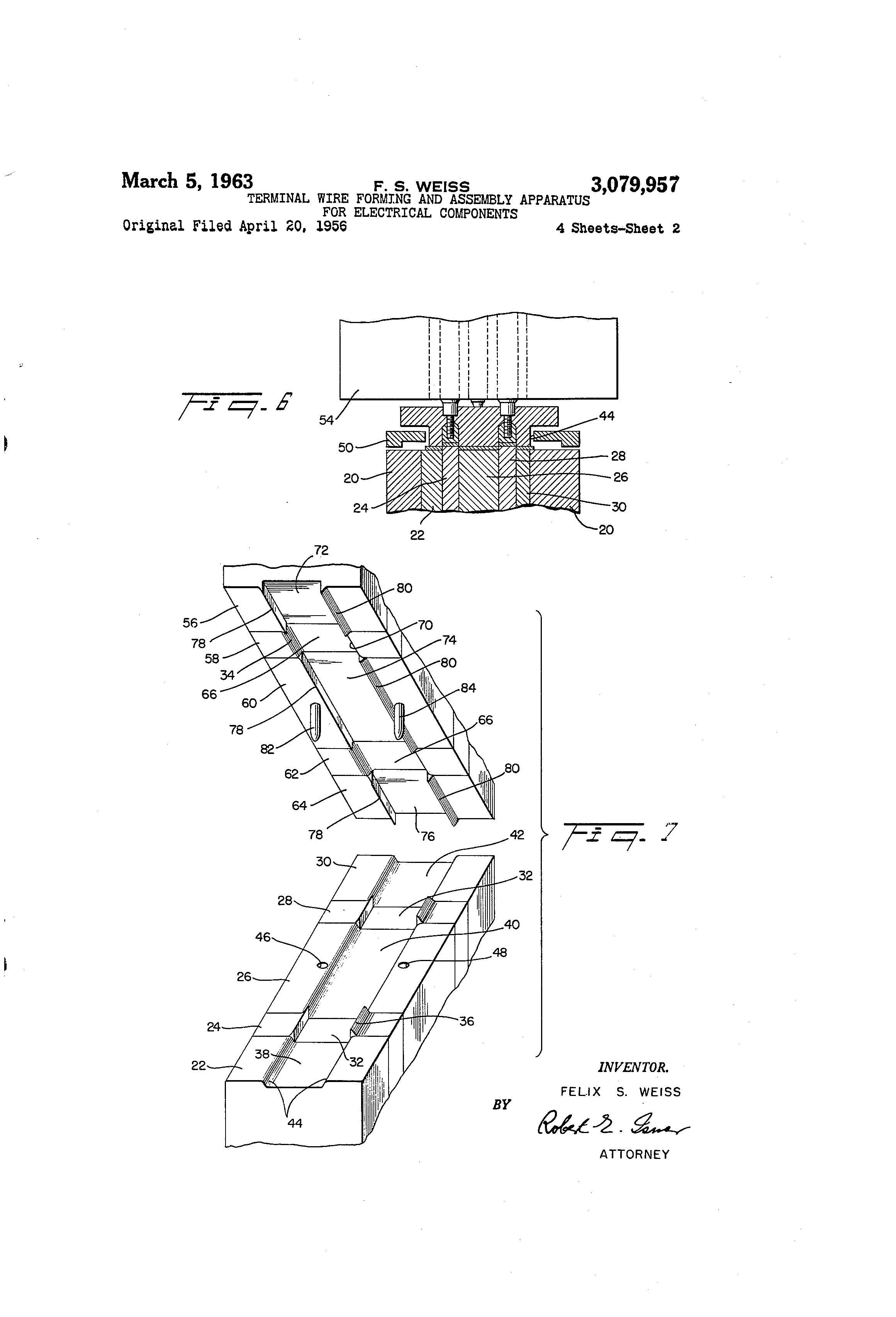 U,-ql"ted Stqtts Pateil,.t Office 3@079@957 3,079,957 TE@P,YiP-TAL W= FORIM!NG Al'@@@D AE-C@E,,Vi-RL"FZ @kPPA-P-ATUS FOR ELECTR;,CA-L CO@,,,Z@-ONT:,@:NTS Felim S. Weiss, ch,-stuut IEll, Mass., assigpor to CorneflDub!Her Electric Cor-peration, South pi-n!nfi@-I id, a corpi)i,ation of Delaware app'@icql@on A,@-@;r. 20, 1956, Ser. 579,679. D.@vi-ned and tMs nr,@pucat:on Mar. 13, 1959, Ser. Nlo. 799,179 3 CMr-is. (Cf. 140-71) Th-'s invent-ion relates to certain improvemenfs iTi machir@,-' s for manu,'acturina capacitors, or sirriilar relativ,-Iy small electrical instru@-netatalities incorporating a 1)lurality cf exlcnding terminal wires, by production line metbods ;.n which an effectively endless conveying mediun, such as, in the p,-eferred form here shown, a dispei-isable strip of flexible pap,-rlike material, advances the matcrial froni V,;-bic'A the capacitor or other electrical inst.-umentality is to be asz,:eribled and finally the ca-oacitor or other electrical instrlm@-ntality itself through various operating s'Lalio@-is at vvh:,cb seq-,iential steps of assembly and eventually final processing, and if desirable, testin.@ of the coirpl-,ted units are performed. T-Iiis app,ication is a division of my application Serial L@lo. 579,679 filed April 20, 1956, now abardoned, and is particularly concerned, as will hereinafter more fully be dp-scrib,-d, Nith imdroved st,-ucti,@re for a processin- or operatin@ station at whica the conveying medium is conditioned to receive a term@@'nal wire subassembly and at which a t,-ripinal wire subassembly is formed and is disposed in reriovably secured operative relationship with said conveying medium to provide a novel and us-,ful product i-,i the fo@-m of a web mounted terminal wire subasserqbly. Th-- mechanical impro,,,ements and product which are the sil-bj-,ct of this inveti@lion are adaptable to the above dzscribed gen@-ral assembly rnethod of production for the pr;nciples, purpos-I and object of inereas-.n.- efficiency of production of such methods and the quality and uniformity of the articles so produced. While its principles may be advantageously used in the production of capacitors and other siriiiiar cle-,trical instrumentalities such as resistors and recti-Rers iTi varioi-is sizes and shapes nrd @vhich inc-@roorate a plurality o' extending terminal wires and may @e applied whether t'he conveyiii- strip be made o f one fl,-xible mqerial or another, the present invention is particulq-riy useful in the production of ceramic disc ca pacitors ,,ibic'n include a relatively small ceramic dielectric d-isc with a lay.-r ol' conductin.- mate.-ial dis-,osed on each o@ the opposite faces tbereof apd servi-@ig as the electrode elements 'Lor the capacitor units. In the assembling of such i-inits, suitable tcrin-inal or lead N@iires are secured to the cor@duct'ng layers on th@- ceramic disc and the disc a,id adjacent i)ort;ons of the tertrinal wires secured thereto are covered with a coatin of suitable insi -ilating material. The success of the use of coptinuoils assembly methods of the general type described in the manufacture of these c,-ramic d;sc type capacitors dep@-nds not only upon the rap:dity ald continuous flow of operations at the various as,,-.mbly and processin,@ stations, but also 1-ipon th.- accuracy and reproductab:@lity of those operations at each station, all to the eiid that each capacitor, as it cornes to a point of completion, is as much like the precedin.@ and follo@,;in- capacitors as possible. These'objectives are materially aided by the provision c)f unil'Ormly positioned web mounted terminal N@iire subass.-mblies on a conveying medium in such manner as to perm't d--sired posit-oning and manipulation thereof for subsequent op-,rations and yet prevent any undesired displacement thereof occasioned by conveying niedium displac.-ment. Patented Mar. 5, 1963 2 'ne i-@ivention may be briefly described as including riovel and improved apparatus for forming a generally Ushaped, hairpin type, terminal wire subassembly of predetermin,-d character from a length of strai.-ht wire stock . conjtinction with the preparation of a web of suitably In precondilioned co-.iveyor material to form a terminal wire sub-,ss.-mbly receiving channel therein together with associated means for effectin- the introdiiction of said hairpin type terminal wire subass'embly in said channel to produce 10 a useful p.-oduct in the form of a conveying medium havin,@ terminal wire subassemblies mour.-ted in releasably secured operation relationship thereon for continuous assembly production line n-ethods of manufacture of capacitor and similar reialively small electrical instrumenma 15 ta'ities i-@icorporatin- a plurality of extending term' I wires. Ar@iong the advantag.,s attendant the practice of this iiiveilt;on, apart from the obvious manufacturing economics that flow therefrom, is the provision of uniformly 20 disposed web mour@ted term;nal wire subassemblies wherc;n such wire subassen-blies are disposed in slotlike chann'els trans@,icrsely of th,- conveying web in which the characteristics ol both the de4ormed web material and the U-shaped termilial wire subasse mblies cooperate to pro25 vide a releasably secured operative engagement thereb@- tween which p.-rmits desired positioning and manipulatioi of the wire subassembli-.s for subsequent operation aiid yet prevents any undesired displacement thereof that mi.-ht be occasioned by displacement of the conveying to medium. The object of this invention is the provision of improved apparatus for automatically fabricating web mounted terminal wire subassernblies in the fabrication of capaci'Lors and similar small electrical insl.-umentalities 3@5 iticorporating a plurality of extendin- terminal wires and by contintious assembly productionoline manufacturin-, methods. Another object of this invention is the provision of a novel and use-'Lul product in the form of a web mounted do terminal wire subass,-mbly. Other objects and 