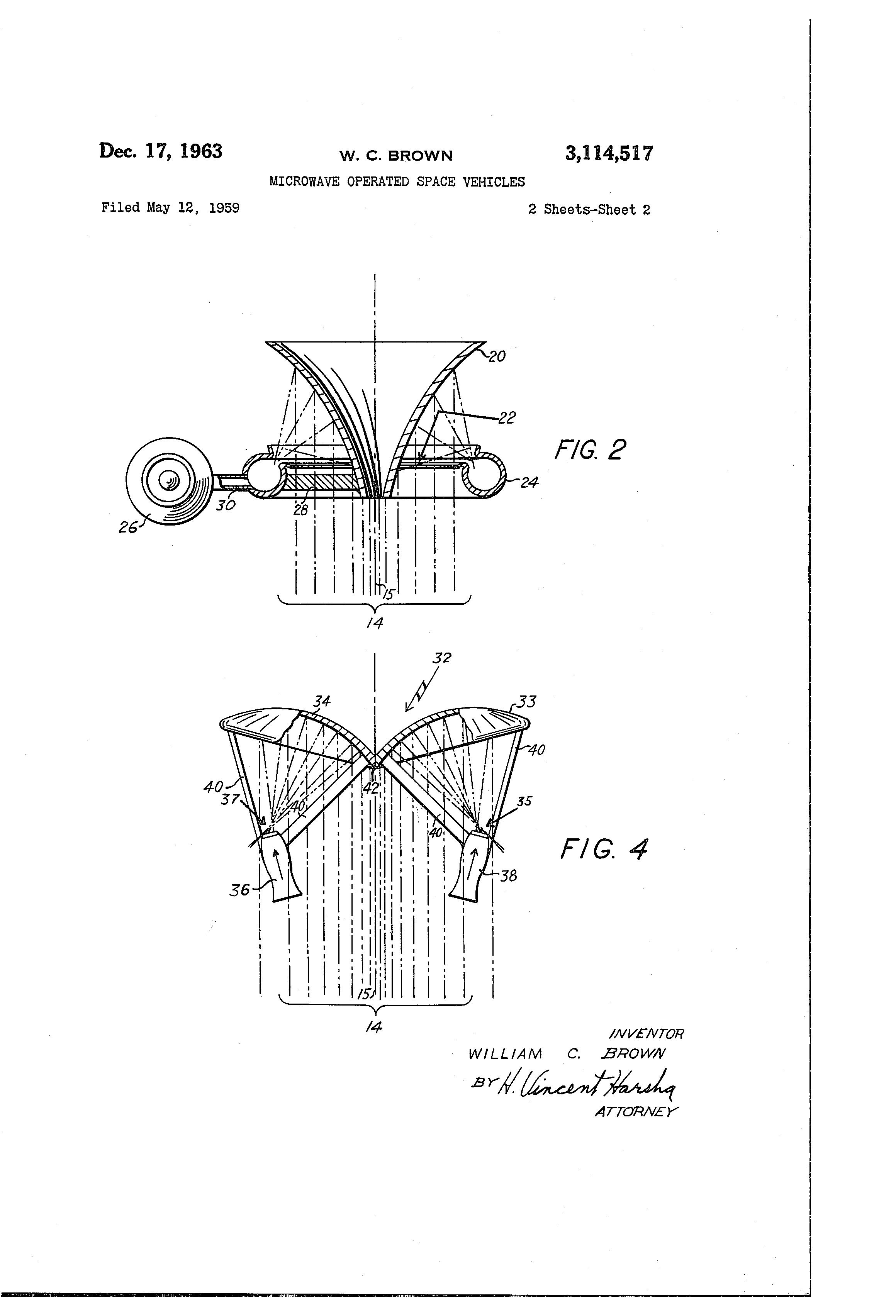 Un'l'ted States Pateiit Office 3,114@517 P a ' , e n i t e d D e c . 1 7 , 1 9 6 3 2 it is -ciaer,-,Ily iiecessary to focus th-. transmitted energy so as'to ach;ev-- a des;rably high power density at a remo@@- -oint o.- area wi,h respect to a given generator or transrr@iter power level. Ii accordance ivith the laws of ooties, 'che sharl--@iess of tli-, beam produced by an anterna as the ralio o4l antenna dimensions to the cf the transm.tt.@,.! energy. Thus, for a giveli or desired power densi@y or beam sharpness, a decrease in the wavele-@i-th of the transmitted en,-rgy permits a co,-rcsi@ondirg decrease in the dimens;ons of the antenna. FroLi the st,.)ndpoint of mechanical convenience, it is -.ene,@-ally desirable to employ small ar@tennas and other com,,@,on--n@s, ar,.d it is.therefore advaiitageous to employ cic-,-gy of very siaort wavelength. I.,i additio@i, the difricul,,ics in relatively Ion.- wave transmiss;on as a resiiil ot na@Lural and man-made interference or noise (whic'- rl noise wouid interfere with tl-ie transmission ol ra-lar or co@- iiiiunications intel',igence via the microwave roi@,er beam) e@o not ocr-i-ir with aiiy appreciable signiflc@a,2!,@c at microwave frequencies. Also, where the space voliic"e is to be operated at an altilude above tlie ionosi@i-iere, Io-@i- wave transmission will generally be reqecled by the re,-lectin.- layers thereof, while niicrowaves pass through stic.,i i,@tyers subscan@-lallyunafirec',ed. in v-'--w of tlae sever,,tl adva@qta,@es stated above, it might apr)- @-,ir cles-irab'@e to employ the shortes, wavelength poss@ble com-,-ilensurate wi-Ilh the power-generatin- cip-ibilit-'@es of the trars-niitter at the wavele.,l@.th chosen. A iower limit is 'iqxed, however, for the wavelength that may bo i-ised -in a practical radiating system in view of t,--c i@ioreas:@n-, ',--sses due to absorpt;on occ,,irring in the ,L@'iuospLere at wavele7i,-ths b--Iow five to ten ceiitimeters. In t'Lle to two centimeter region, there is a peak i@i absc)rptioi by water vapor, and even for dry air the ab@.orzt'@on of el--c,6romagr@et;- energy increases very r@ipidly one or t,,vo centimeters. It may thus be seen t@iat m;crowaves iTi a region having the ai)proxin-iate bounds of two and th;rty centimeters are rea-dily adaptable to coaven,'@ent radiation of energy to a remote point w;th s:rall transm@'@ss:.on lo3s, w@.th th@- preferred waveler@gt'@-s being of the order of five or ten centim,-ters in order to accomplish effic-'@ent i'Ocu,@ing with a transmitti-@ig leiis sys'Lem of rea.-otiabic size wi,hout inflicling an intol--rable power loss by @ibso.,:ption. The '@ey to the prp..ctical utilizat;on of high-power el.-ctroma.-netic beams for remote en-.rgizatio@n of space veatid the like is a device wh;ch will @-enerate large amou--Is of po@ver w: @thin this wavelength re-ion. In a-Jdit,.o@i, maiiy ar)i)licat;o-@is of such highpower beams -rt,,q,,i-ire stich refi-iements as broad electroric bandwidth and low phase d;stortion, placing the additional requireol sophisticated performance on 'che hi.-h-power generator. A eevice which currently sat-sfies ti-,e duel reqi-i-ire@-nents o-f L,:.-h nower oul@put and refined performanc6 is the Amplitron tube, a rela'ively new typp- of crossedfield vacuum tube which may be used as a compact, highly el-Ecient, broadband amplifier caidable of handling hi,-h pea!c and avera.@epowers,-and wh-',Ch generally corilpri@-es a ci@-cular but no-i-reentrant, dispersive network malc!i-d at both cr@ds over the frequency region of interest, a-@id a reen@rant electron beam originating from a co@it;nuous'y-coated (or nearly so) cathode coaxial with t',-le neLwor'@-, with a D.-C. polential being applied between t'Lie calhode and anode, aiil a magnetic field adplied pa,- allel to the axis of the cathode and transverse -to the elec'@ric field between the anode and the cathode. For a more com@ ol--te descri t;o@i of the Amplitron, reference -P @ may be had to my application Serial No. 706,812, filed Jartiiary 2, 1958, for "Low Level Diii,)Iexer System," now United States Letiers Patent No. 2,933,723, which iss@,icd April@ 19, 1960. Amplitrons currently available are 3,114,517 MAICIROVYIAVE OPERA i-z@D SPACE VE, I-HCI-F E4 S Wiliiam C. BrowE, Westen, Yines., as!5@ignor to Raytheon Company, Lemin,-ton, M,@Fs., n corporntion of Delaware FL@ed M@ny 12, l@' S9, Ser. ?-To. 812,710 5 11 Claims. (Cl. 244-1) Th-z's inv.-Pt@'.oTi pcrtair%.s gcnera-"Iy to space vehicles and th,- ll""c, and morp- particiila,-'IY to a novel form of s@jace vel;clo and a system for mainta,'.-P-@'ng such veh-icle in 10 flig',,t or at a des-irtd loca-io-,i in spaced-apart relat"@Onship wilh respect to a mother planet or the like. 'The )rlor art ai--tore-@s many ex,,im-:)Ics of apparl,,tus a-dap'Led 'Lo b-c nrc@,celled :l spaced-a-!3art relatioiis-iiip w'ith the ear@l-, as well as systems for main'taining this r,-Ia15 t-'-o-riship @'n ()T,.@?os;tio-ii to th3 gravitatioilal field thereof. s of th,s typ-. a-ze co-iv,--iit:onal aircra' Exe@up'ary 13vce t (both jet and pro,-,eller dr@ven) and the more modern ti,@i-manned or pi'lotless vehic',es s-,,ich as rocket--oro,- elled -iiissiles. however, the operation of eaeii oi@ t@iese ve- 20 hicles of the prior art necessitales the exi,,--iidi@ure of a ftiol carried by th,- vehicle. Fi:Lrther, w'@iil-- an orbital Ear,lh sat@Dllite reqlir--s no appi'@ed enorgy i-q executin.- a g;v,-.n orbit, eiormotis quantities o,- -iru-,l are coisumed ill iau-ilchi@-,- the sat--il@te in'to o-bit. Also, wh-,re t-ti.- 25 sptell,'@te ve'--icl-- is desig-,ied for ti-,e stibseq@aent correction of or o@her change iTi '@he o@b-@'@a'@ path, a fael supply mi-ist be carried by th@- satell7te in o.-der to provide thc@ desired corrective thrusts. it is t@ilis appirent tha@' in each ol' 'chese pr',@or art ve- @0 h-'.cles a fiicl si-ip,3!y -miis" be carr-@'Cd ther@-by for local constir..- ipt@'@o@i :n order to -@'nitiate, mainlain or aller a g@'@ven -Lq-l i@,h'L pattern, wheth