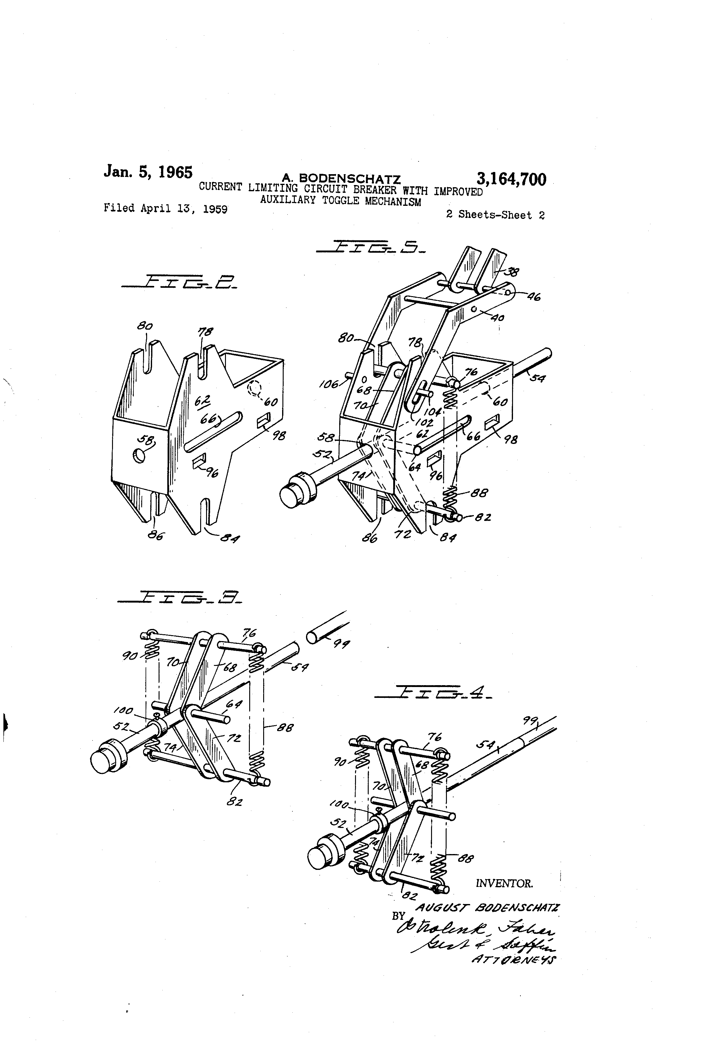 claim: 1. A current limiting circuit brea'@-er; said current l,@miting circuit breaker includ,'@nIg a pair of cooperating contacts movable between an enga.-ed and disengaged position with respect to one another, a main operating mechanismoperatively connected to at least one of said pa,.r of cooperatiiig contacts and an auxiliary operating means operatively connecl,ed iiidependently of said rn@in operating mechanism to sa-ld <)no of said pair of cooperating contacts; said auxiliary operating means being operable responsive to predetermined fault conditions to initiate opening of said pair of cooperating contacts before said main operatidg mechanism operates; biasing means for said one of said pair of cooperating contacts for biasing s,iid pair of cooperating con'@acts into engagement when said cooperating contacts are in their said engaged position; sa;d auxiliary operating means being operatively cop.nected to said b@.asing means; a frame; said frame being connected to said main operating mechailism; said one of said pair of cooperable contacts being carried by said franie; said frame furthcr carrying toggle means@, One portion of said toggle means be;ng connected to said one of said pair of cooperating contacts, another portion of said toggle b@-iiig connected to said frame; said tog-je means biasing sa-id one o'L said pair of cooperating contac',s into engagement with the other of said pair of cooperating coiitacts; said one of said pair of cooperating contacts being movable with respect to said frame to a toggle collapse position to quickly remove said bias of said toggle means. 2. A current I:Imiting circuit breaker; said current limiting circuit breiker including a pair of cooperatin- contacts movable between an engaged and disengaged positioii WiLh r--spect to oiie a,-ioLher, a main operating mecha,nism operatively connected to at least one of said pair of cooperating contacts and an auxiliary operatiiig means operatively connected independently of said niain operating mechanisni to said one of said pair of cooperating contacts; said auxiiiary operating means being operableresponsive to predetermined fault conditions to initiate opening of said pa-ir of cooperating contacts before said main operating mechanism operates; biasing means for said one of said pair of cooperatin.- conta@ts for biasing said pair of cooper,@iting contacts into engagement when said cooperating contacts are in their said engaged position; said auxili,iry operating means being operatively connected to said biasin.- means; a frame; said frame being connected to said main operating mechanism; said one of said pair of cooperable contacts being carried by said frame; said frame further carrying toggle means; one portiori of said toggle means being connected to said one 6f said pair Of 3,164,700. 6 cooperating contacts, another portion of said toggle being, connected to said frame; said toggle means biasing said one of said pair of cooperating contacts into ciigagement Nvith the other of said pair of cooperati c6ntacts; said one of said pair of cooperating contacts being movable with respect to said fra@-ne t , o i toggle colia-,3se position to quickly remov_l sa,.d bias of said to,-gle i-nea@is; said one of said contacts beirg initially moved with respect to stid frame by said auxiliary operating meei-lanism. 10 3. A current limitiiig circuit brealer; said current limitin.a circ,,lit brealcer comp,:ising a relatively stationary contact, a relatively movable contact mova'ole into and out of enga.-emeiit with said relatively stationary contact, a main operating m-,chanism op-ar-@tively coin-,cted to said 1,5 relatively movable contac@t, a inanual op-Irating means operatively con@iect--d to sai@d ma;n operatin.- mechanism for manually operatin,@ se,,id niovable contact, a trid means operatively coiinected to said main op.-ratitig mechanism for automatically opprating said inovable col7i20 tact, a movable cf,,nt,-ct biasitig means, and a-ii arixil-'ary operating rnechanism; said biasin.- ineans being o,-eral ively connected to said wovable contact for biasitig sa@*@d movable contact inlo, en.@a.-emeiTt with said stationaxy oontact when said movable contact is in engagement wich said sta25 tionary contac' ; said auxiliary operating mechan'@sm being op.-ratively conn-,ct-- d to said movable co@itac'@ indeper@dently of said mainoperatin.- niecl-tanism aiid moving said movable contact toward a diseiigaged I)osition independently of s,)id main o-oerating mechanism responsive to 30 predetermined conditions; a frame; said frain-c being coi,nected to said main operating niechanism an@l mov@,ble thertby; said movable contact being cirried by said -'iranie and movable with respect tlierc,,to; sa,.d fran-ie having one portibn of a to.@gle spriiig nicans con-iiected thercto to 35 sei-ve as said biasing means; said r@,iovable contact b,,in,@ connected to anotber portion of said tog.-I-, springs m@.ans; said toggle spring mcans bein.- vii-.n said movable contact is mo-ved toward a dison,-aged positioli by said aiixiliary op-- rating m-,chanism with resp-.-ct' to 40 said frame. 4. A contact pressurp- mea-@is for a i'lrst con!-,ict i-iiovable into and out oi. ciigagemont V@ti-i rcsp-,ct to a sec;orid contact; said contact pressure meqns iiirli-icling a frarile, and a toggle meaqs; said fl.-st contact being carried by 4,5 and being n3ovable @@ith respect to said trame; said fraine beiiig movable betv.,ep--@i a coiit@,ct en,@a,,Cd and ,I coiitact disengaged pc)sition; said tog,-le means haviinc, a first portion connected to said frame and a s@-cond portion connected to said movable conlact; said 'Lo.@Lle nieais r)o biasiiig said movab"e contact into@ Iiigh pressure contact crigagement with said se I cord contact @A,'icn s,,id iarst and second contacts are enr,,aaed; said Triovabl-, coitict movinsaid to.-gle to all overcenter positioii when said movable contact is mov--d to7,vard a disen.-a,@cd position and said 55 frame is maintained