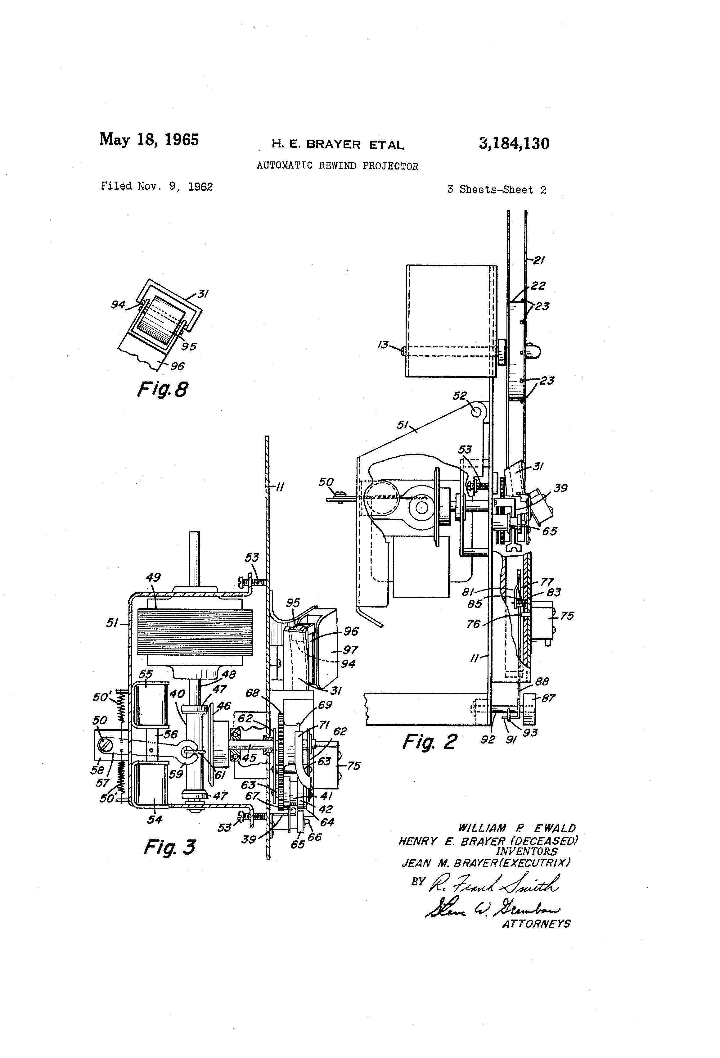 claim: 1. In a n-iotion p,cture projector having a film source and a film take-up means, the conibination comprising: (a) first means for transporting said film from a film source tlirough said projector alon- orie path extending between said i'ilm source and said film take-up iiieans for projectioti; (b) second r@ieans movable from a normal inoperative position to an operative position ilito engagement 10 with said projected film along said one path for transporting same back to s-,i d film source over a di re@it path for rewinding; and (c) control meaiis for said second means and responsive to the absence of film in a portion of said one 15 path spaced from said film source for moving said second means from its inoperative to its operative position. 2. In a motion picture projector having a film source and a film take-up means, the combinatiori comprising: 20 (a) first means for transporting said film from a film source through said projector in one direction and alopg ori-, path extendin.- between said filr@i source and said film tal@e-up means for projection; (b) second means movable from a normal inoper@ative 25 position to an operative position into engagement with said projected fiti-n along sa-d one path for transporting said projected film in the opposite direction and along a different path back to said fflm source for rewinding; aiid 30 (c) control means for said second means and incltidiiig a sensing element responsive to the absence of film in a portion of said one path spaced from said film source for moving said second means from its inoperative to its operative @osition. 5 3. The invention accordin-. to claim 2 wherein said second mear@s comprises a rotatable dr ve roller; a support for said drive roller movable between said operative and inoperative positions for mov:ng said drive roller respectively iqto and out of driving enga-ement with said 40 film; drive rrean@ iiiovable in a first direction for driving said drive roller in on,- direction of rotation, and in a second dii-ection for drivin-, said drive roller in the opposite direction of rotati6n; and means interconnecting said support and dr@iving means for moving said support into either of said operative and inoperative positions in 45 -sponse to movement of said drive means in either of said first and second directions respectively. 4. The invention according to claim 3 wherein said driving means comprises a rotatable disk, and said interconnecting means comprises a ,riction member secured 50 to said support and in frictional engagement with said disk. 5@ The inventioli accordin.- to claim 4 wherein said rictiori member comi)rises a leaf spring haviiig one end sectired to said support, and a friction material secured 55 to the otp-er end of said sprin.- and urged by said spring into engagement with the periphery of said disk. 6. The inveiition accordin.- to claim 2 wherein said cor@trol means comprises a iirst switch connected to said sensin.- clerfient which is movable into and out of said 60 ope path, and a latch for said sensing element movable betvfeen latched and tinlatched positions, and adapted in its latched position to releasably hold said sensing element out of said one path and to ha@re a portion of said latr-h extend into s,,iid one path, said latch bein.- released 65 to release s,-,id seiisiiig element when the film transported alon., said one path strikes said latch portion and moves it out of said one path, said latch por'ion further adadted in its unlatched position to move into said one path and block it off after the trailing end of said film passes said 70 latch portion. 7. The invention accordin- to clairn 6 wherein said coiitrol @-neans furtlier includes a second s,witch electrically connected to said rirst switch and liaving an actuating elerrert movable froin a normal first position to a second 75 position by a portion of '@he film in said dif.Lerent path as 7 ten,.ion is applied tti,-reto during the rewit-idi-ii- operation for operatin-, said control means to move said second means to its inoperative position. S. In a motion picture projector, the coinbiliation comprisi-.g: (a) means for transporting a film rom a film sotirce throti.@ii said projector in one direction and alon.- one path for projection; (b) rewind means movable from an inoperative position to an operative position into en,@agement with said film for transportin.- said projected film in the opposite direction and along a diff,-rent path back to said film source i'Or rewindin.-; (c) a reversible drive means connected to said rewind means to move the same into its operative positioll, when driven in one direction, and to move said rewind means into its inoperative positioi when driven in the opposite direction; (d) shiftable control means movabl-@ betwe-.n two positions for selecting the direction of drive of said drivo means; (e) and means for shifting said control m-.ans between said two posit-'@ons, and includin.- a movable film sensing member responsiv-, to the presence of film in said o-@ie path for holdin- said control means in one of said two positions, a-@id responsive to the absence of film in said one pqth for sbifting said control means to the other of said two positions. 9. The invention according to cla,m 8 wherein said r--wind means comi)rises a support, a drive member carri,-d by said support and movable into a@-id out of driving enga.-ement with said film, and a friction member secured to said support and having a portion thereof in frictional engagement with said drive n-icans. 10. The invention accordi-ng to claim 9 wherein said support is pivotal, said drive member is a roller, and said friction member has one end secured to said s,,ippor, and its other end in fr@'@ctional enga.-ement with said drive means. 1 1. The inventioii according to claim IO wherein said drive means comprises a rotatable disk, aiid said friction inember is a leaf spring hav;-@ig one end secured to said support, and a fr,@ction mate;i