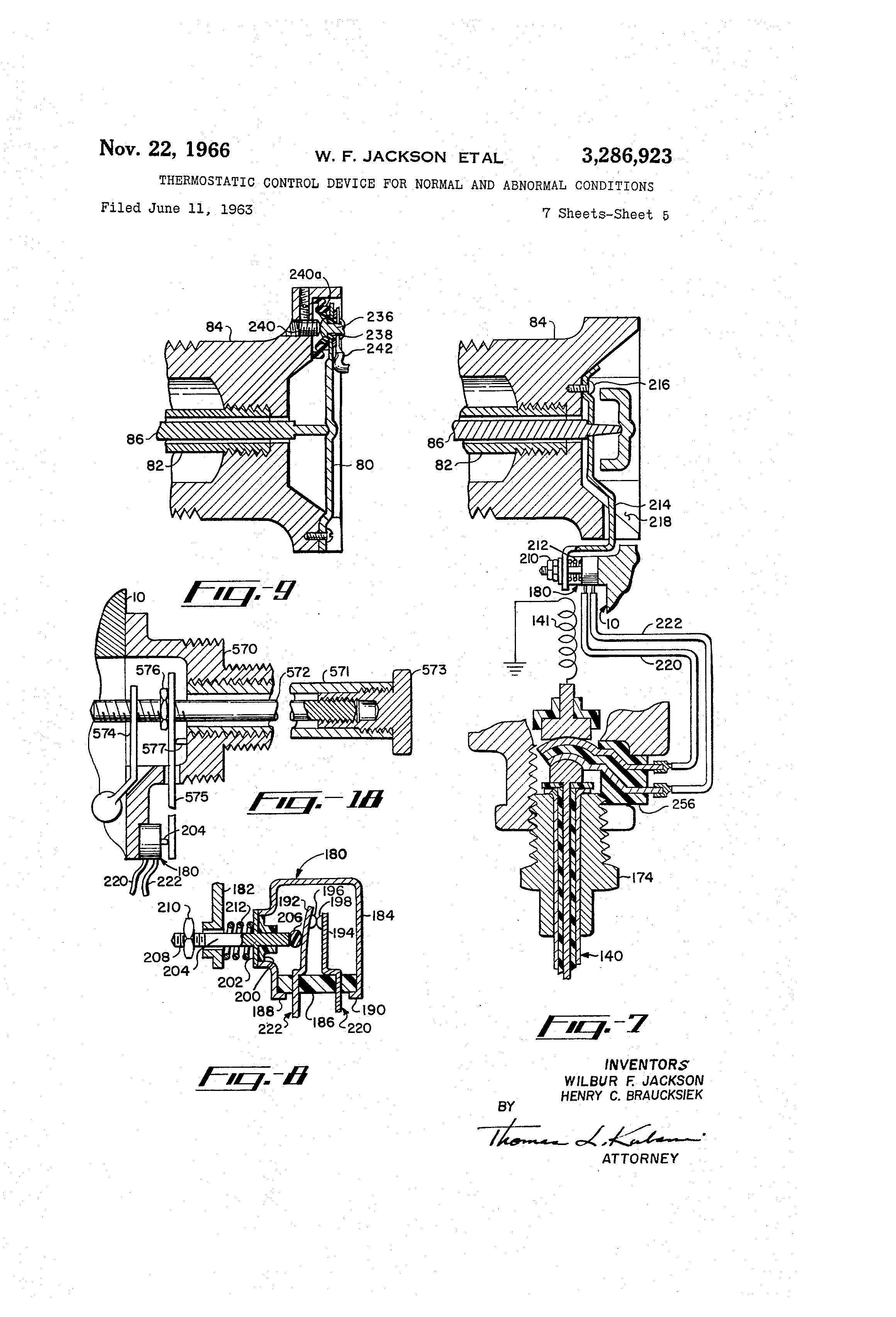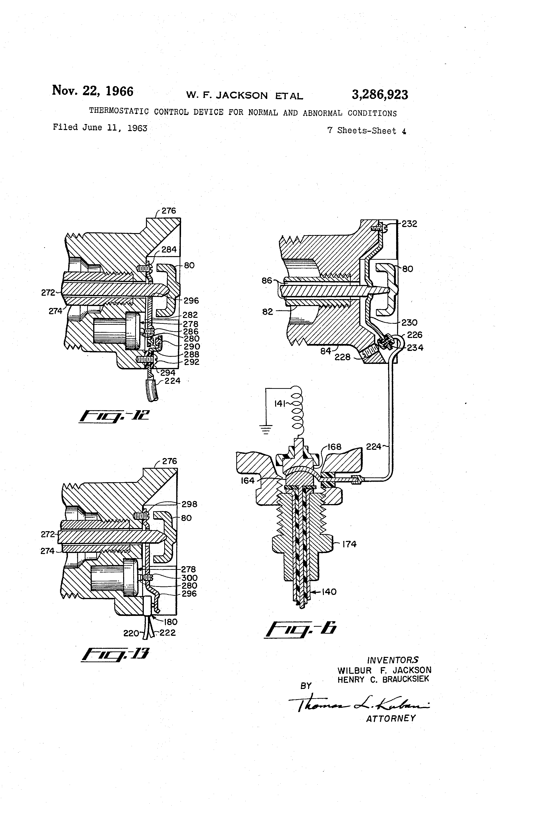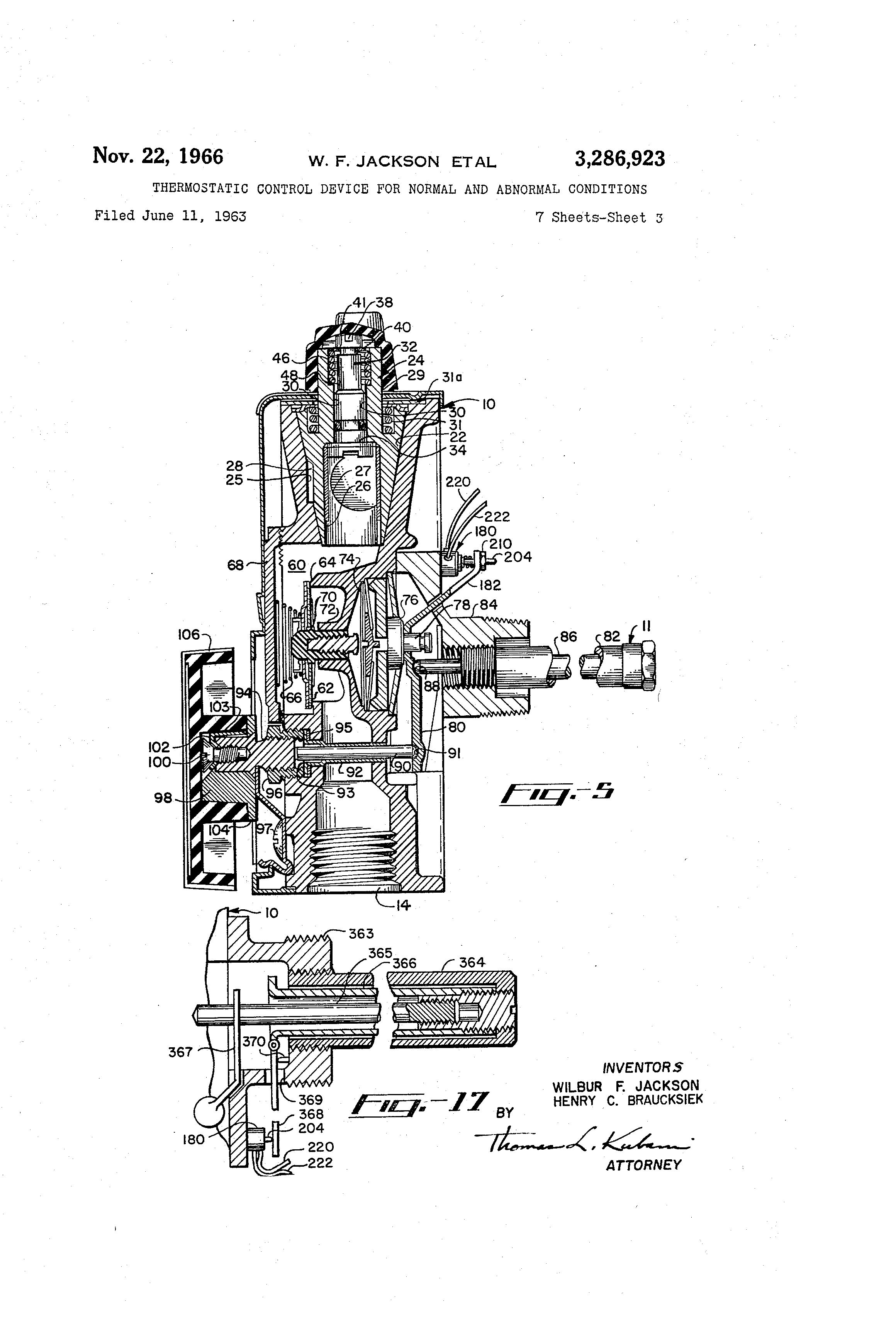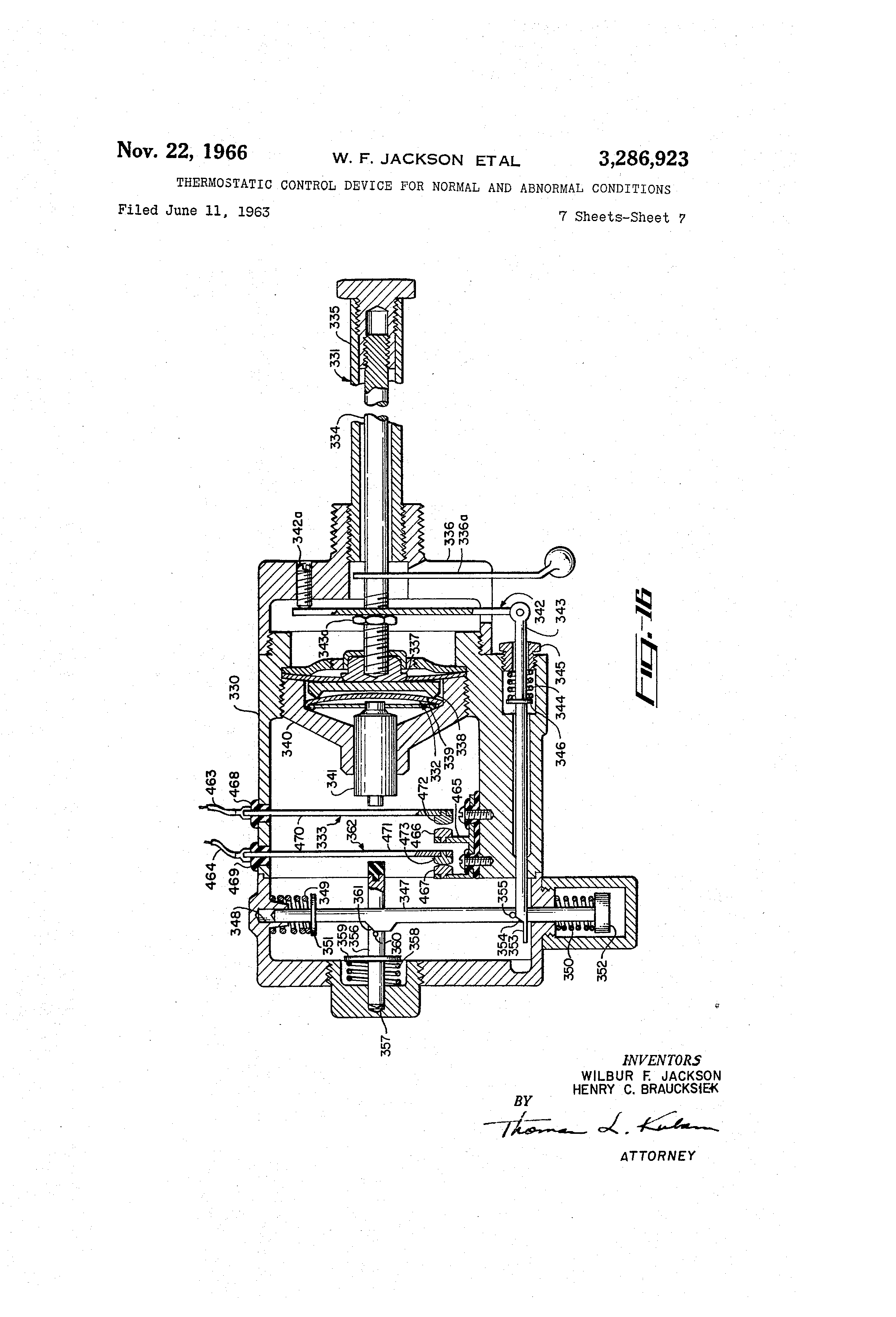 Another embodiment of the present invention is illustrated in FIGURE 14 wherein a bulb 302, capillary tube 303 and bellows 304 is used as a temperature sensor for changing the position of a valve 306 within a thermostatic control 308 best used for such things as space heatin.- apparatus. This control is illustrated and described in the patent to Jackson et al. 2,975,974 and will not be explained in full for that reason. Temperature variation sensed by the bulb 302, will chanae the volume of a charged fluid within the system and correspondin.-ly expand or contract the bellows 304 moanted within the control. Expansion of the bellows 304 tends to rotate the housing 310 counterclockwise about rib 312 which allows the valve 306 to be closed by a spring 3114. An arm 315 is fixedly attached to the housing 310 and is biased by a coil spring 322 against the rear of the bellows 304 and extends downwardly and terminating in a double faced contact 316. A pair of grounding contacts 317, 318 are each mounted in the housing 310 by a pair of insulating bushin-s 319, 320; respectively, and are connected to a single insulated lead 224 leading to an electromagnetic device similar to that shown in FIGURE 6. In this manner, as the temperature sensed by the bulb 302 reaches an abnormally hi,@h level, the bellows 304 will expand causing contact 316 to engage contact 318 to ground out the electroma,-netic device sho-,vn in FIGURE 6. In the event the bulb 302, the capillary tube 303, or the bellows 304 is punctured and the fluid therein is released, the bellows 304 would normally compress under the force of spring 322 actin.against it and contact 316 would en,.age contact 317 which would also short-out the electromagnetic device of FIGURE 6 to shut down the device under this kind of a failure. FIGURE 15 illustrates a control quite similar to that illustrated in FIGURE 14 and includes a similar bulb 302 and bellows 304 ;arrangement has one end; an arm 3@13 is fixedly attached to the housing 3110 and another end with a pair of buttons 324, 325 mounted on opposite sides thereof. A pair,of normally closed switches I$Db, see F'IGURE 8, are placed in spaced relation to iopposite sides of the arm 323 and are connected in series by lead 326. A pair of insulating leads 220, 222, one from each of the switches 180b, are connected to an electromagnetic device as illustrated in FIGURE 7. The switches 180b are of a normally closed variety and therefore under the conditions illustrated in FIGURE 15, th-.re would be electrical continuity between the two insulated leads 220, 222. Thus under an extren-lely hi@h temperature condition, the bellows 304 would expand, until protuberance 325 enga.aed its switch 180b to open the same and break the continuity between the two leads 220 and 222. This -opening of the circuit would cause the electromagentic device as illustrated in FIGURE 7 to dis@ngage to shut down the entire system. T-his operation is very similar to the opening switch irustrated in the embodiment in FIIGURE 7. AJternatively, if the bulb 302, capillary tube 303, -or lbelloivs 304 were perforated, the fluid would escape allowing the bellows 304 to collapse under the influence of spring 322 ' and protuberance 324 on the arm 323 would en.aage its switch 180b thereby openin@g the circuit and causin.- the electroma,-netic device in FIGURE 7 to open and shut down the control. With reference to FIGURES 14 and 15, it is readily apparent that the position of the arm might be placed on any part of the bellows either directly or indirectly in contact with it, and still serve t-he purpose of the present invention and altematively, the position of th,- contacts or the switches might be varied without departin,- from the scope of the present invention. Referrin@ now to FIGURE 16, the control device comprises a casing 330, temperature sensor 331, and operating element 332 attached thereto for operatin.- a control device,or switch 333. This control device may be used for any number of appliances which are electrically heated 3,286,923 12 and require the heat to be regulated by a temperature sensor. The temperature sensor may be any known ty@pe of sensor which produces some movement with temperature variations. In this embodiment, a rod 334 iS Totatably mounted ivithin the tube 335 that is fixedly attached to an end cap. Through expansion of the tube 335 sensing chang--s in ambient temperature, the rod 334 having a different coefficient of expansion will axially move to operate the sw'@tch 333. An operating arm 336a extends 10 through an opening 336 in the casin- 330 and is fixedly attached to the rod 334 such that rotation of t-he arm will change the effective len-th of the rod 334 in relation to the tube 335 which thereby changes the temperature setting of the temperature sensor 331 ' 15 The rod 334 enga,-es a button 337 which transmits motion to the thrust element 338 and clicker 339 of the snap acting mechanism that is moi-inted within the spider 340. Axially aligned with the rod 334 is a sbaft 341 i slidably mounted within the spider 340 and - en.-ageable 20 with the swifch 333 such that movement by the rod 334 wiR transmit motion throtigh the thr-ust member 338, clicker 339, ;and shaft 341 such that the switch 333 may be operated. A means for transmitting motion insensitive to the ad25 justment or rotation of the rod 334 includes an arin 342 which is keyed or fixedly mounted to the nut 343a which is rotated upon the threads on the rod 334. It should be recognized that the rotation of the rod 334 by the operating arm 336a will not change the relative position of the 30 r@lotion transniitting means. Arni 342 is pivotally@ mounted on bar 343 that is biased toward the left by a spr'mg 344 acting between the nut.345 and the flange 346.1 Bar 347 is received within t-he passageway 348 in the. casing 330 and has two springs 349v, 350 biasing the bar 35 downwardly. Spring 349 acts between the interior of the. casing 330 and the j'.Ian.-e 351 