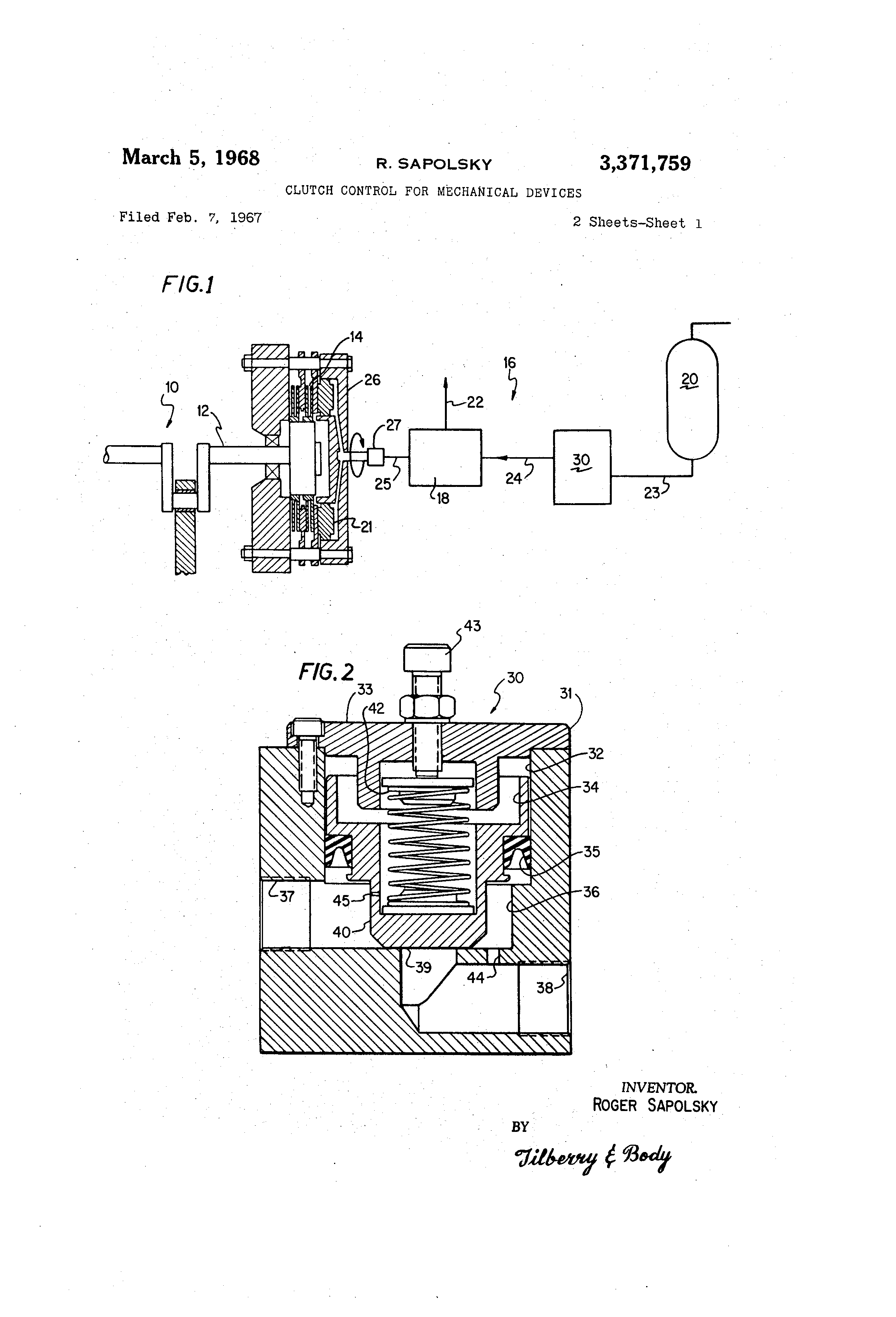 313717 759 3 limiting same, FIGURE 1 schematically shows a mechanical press drive 10 includin- a crank shaft 12 driven by- a pneumatically operated friction disc clutch @q4. Cojinected to the clutch 14 is an clectro-pneumat,'@c control, generally indicated at 16. The control 16 includes a solenoid operated, spring off-set, three-wa),, normally closed gate valve 18 which is connected to a drum switch (not shown) for operation in response to the angular position of the crankshaft 12 in a manr,.cr similar to the press control disclosed iq U.S. Patent No. 2,911,080 issued TTov. 3, 1959. That is, valve IS is normall@ mechanically held closed and separates a pressure ta-@ik 20 from a fluid pressure chamber 21 in the clutch 14, but is solenoid energized by the drum switch to open and connect the tank for pressurizin- tl-@e chamber 21 when driving tile press. When the valve 18 is closed ho@vever a flliid escapement 22 is open N@;hich connects the clutch chamber 21 to atmosphere exhausting the clutch chamber and disen.-aging the clutch drive. It will be at)preciated that a iixed pipe system 23, 24, 25 connects the pressure tank 20 and threeway valve 1-8 to the rotatable clutch housing 26. A revolving joint 27 of known desi-n connects the clutch cbamber 21 with the fixed pipe system 23, 24, 25 of the control 16, Heavy press parts such as the press slide and flywheel have an enormous inertia when they rest. If full line pressure is admitted into the clutch chamber 21 all at once, the shock in overcomin@ the inertia of tb-- movable press parts and the conscquent clutch wear is s-,vere. To alleviate this problem, prior press torque control mcclianisms included a line restriction between the pressure tank and the three-way gate valve. However this has the disadvantage of retarding the build up of torque too much which finds the press load requirements bein- reached before the full tonnage capacity of the press is available. In accordance with the present invention, instead of a line restriction, the novel torque co@-itrol 16 includes a pressure modulating valve 30 between the pressure tank 20 and three-way gate valve 18. Referring now to FIGURE 2, the pressure modulating valve 30 is desi_aned to acconiplish the two principal tasks of the torque control nientioned before which are: (1) to permit the build up of pressure in the clutch gradually at first and, (2) at a predelermi,ied back pressure, apply full line pressure to the clutch to achieve maximum torque. The valve copsists essentially of a housing 31 having acylindrical inner chamber 32 which is closed at one end by a cover 33 and at the other end by a movable wall 34 scalably enga@ing walls of chamber 32 by means of radial seal 35. Aiiother chamber 36 of somewliat smaller diameter than chamber 32 exists in the lower part of housing 31 and opens laterally on one side to form aq outlet 37 iiltended to be joined with the inlet of the three-way gate valve IS by way of fixed piping 24 and on the opposite side opening lateraII3, to form an inlet 38 intended to be joined with the compressed air tank 20 by way of pipin@ 23. The inlet 38 terminated centrally of the housing an'd coaxially with respect to cylindrical chambers 32, 36 to form a seat 39. The movable wall 34 is provided with an extension which forms a clack valve 40 adapted to close on the seat 39 at the same time cuttin- off direct communication of compressed air from tanl@ 20 to the inlet of the threeway gate valve 18. A coil spring 42, the tension of which can be adjusted by screw 43, biases the movable wall 34 and consequently clack valve 40 to the valve closin@ position on seat 39. A throttlihg orifice 44 connects th-, inlet 38 with cbamber 36 bypassin- the main fluid flow passage thrbu,@h the seat 39. A calibrated opening 45 of s omewhat'smaller diameter than throttling orifice 44 is located in the extension forming clack valve 40, the purpose of which is to connect chamber 32 with chamber 36 for reasons to be explained bereinafter. When the press is idle, the three-way g,,ite valve 18 is de-energized which means it is in the normally closed position separatiilg pressure tank 20 from clutch 14 and 4 connecting clutcli ciiamber 21 to the escapement 22. Under these copditions thechambers 32,.36.of the pressure modulating valv-, 30 are at equilibrium which means that the pressure in chamber 32 is subsantially equal to the pressure in chamber 36 under which conditidns the coil sprin- 42 is effective to bias the movable wall 34 and clack valve 40 lo the scaling position on seat 39 as illustrated in FIGURE 2. The @hambers 32, 36 are filled with air at maximum pressure or the prevailing p@essure of tank 20. 1.0 Upon criergizing the solenoid of the thrce-way gate vq'@ve 18, the escapement 22 is closed and the pressure line 23, 24, 25 from tank 20 to the cluteb chamber 21 is opened to fluid flow through the clack valve 40 by way of throttling orifice 44. The pressure inside the housing 31 will drop but the rate of decrease of pressure in chamber 32 will not be as rapid as the rate of decrease in cliamber 36 due to the calibrated orifice 45, thus the clack valve 40 will remain closed and compressed air from tank 20 will pass only through the throttlinorifice 20 44 retarding full cnga.-ing pressure of the clutch 14 so that the press will start running with a reduced acceleration. At a predetermined build-up in driving torque, the pressure in chamber 36 begins to increase due to the 25 -radual increase of pressure in the system. Since the chamber 32 cannot keep pace with the rise in pressure in chamber 36, the latter being in direct communication with the clutch and chamber 32 being restricted due to the small opening 45, a point will be reached when the 10 movable wall 34 will ri e against the forc& of s@rihg 42 tbus allowing the very rapid fillin,@ of the clutch chamber 21 to the pressure level prevailing in the compressed air tank 20. 35 During operation, the pressure in chamber 32 catches up wit