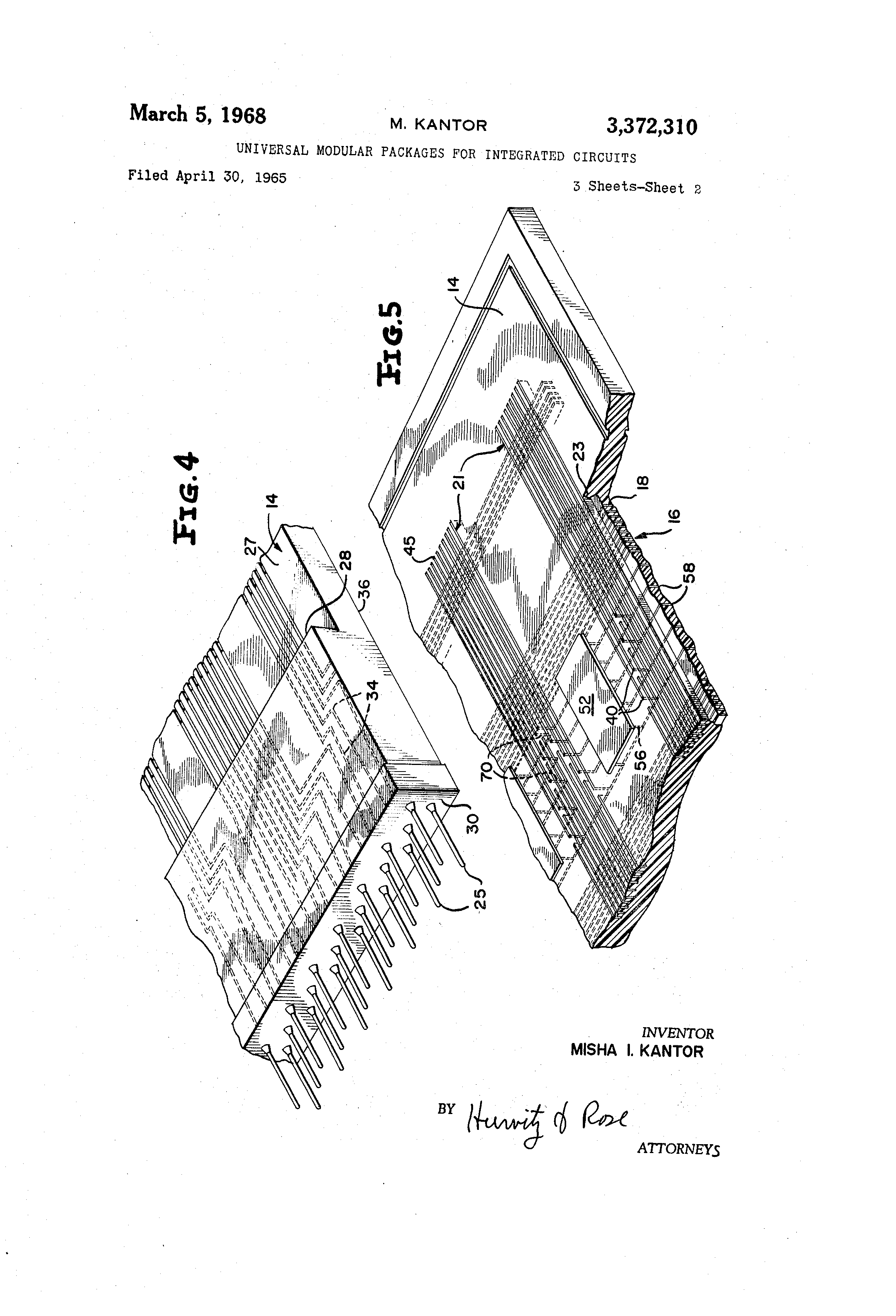 United States Patent Office 393722310 3,372,310 UNIVERSAL MODULAR PACKAGES FOR INTEGRATED CIRCUITS Misha Kantor, Orlando, Fla., a-esignor to Radiation 5 Incorporated, Melbourne, Fla., a corporation of Florida Filed Apr. 30, 1965, Ser. No. 452,184 5 Claims. (Cl. 317-101) 1,9 The present invention relates generally to the field of microelectronics, that is, to the p.,cduction of microminiaturized electronic structures, and more particularly to modular packages of integraled circuits arranged in planar or multiplanar array to form electronic subsysteras or 15 systems, and to processes for mantifacturi@-ig the inte.@rated circuit modules. A@nong the several objects of the present inventic>n, the following are of primary importance: (1) To provide planar module,, of integrated physical 20 and electrical strL7cture in environmentally st,-,b-le packages; (2) To provide maximlm,density packa.@in.- of microelectronic cornponents with a high degr,-e of reliability in overall circuit operation; 25 (3) To reduce the cost of manufactise of integrated circuits by e@lectrically interconnecting uncased moliolithic chips, that is, microcleelronic and thin fi@im inte,,@- rated devices, via an intraconnected matrix oi. condlictors applied to the support slibstrate of a universal niodule 30 to which,the chips are integrally bonded; (4) To provide processes for production of pla-@lar modL,Ies @vhich will redlice loss of material or scrap factor to mirimum levels; (5) To provide planar modules v;hiel-i are protected 35 against internal damage from shock and vibration; (6) To provide improved methods and ineans of connectin.@ the circuit chips to the conductive matrix of the module; (7) To redtice the stresses on cornections and inter 40 connections witliin the integrated circuit module by elimination of any necessity of physical support or restraint of the chips by the co@inections; To provide abrasion-resistant and radiation-resistant microelectronic packages; 45 (9) To provide modular packages of plug-in construction wherein the coniiector pins of each package are integral with the matrix of conductors traversing the module substratc; (10) To provide a matrix of conductors within the 60 base substrate wherein the cop@ductors are interconnected via a pattern of conductor-carryin.- through holes. The problems which hav@- been heretofore ericountered in the production of microel-@ctronic circuit striieture are many. Two of the more serious are, first, that techniqiies 55 adapted to the fabrication of conventionally-sized (according to former standards) component packages are unsliit,ible for the production of rnicroelectronic packages. Basically, this problem arises from the vast differences in the suitability of connections between circui" components and 60 conductive leads, and in the matiner and facility of component ipounting in the two types of packages. Secondly, prior art microelectronic structures have been plagiied by far lower eircliit reliability tiian that which has b,--.n achieved using conventionally-size el.-etronic packages. 65 The so-orce of this problem lies in both electrical a@ld physical difficulties stemrnin.- to a great extent from the vast reduction in size of !ih@- former over the latter, although other considerations, such as appropri,,lteness of materials, are also involved. T'no present invention is intended to solve these and other significant p@-oblenis in the field of microelectronics. Patented Mar. 5, 1968 2 Briefly, in accordance with the present invention, a planar integrated circuit module comprises a plurality of microelectronic circuit cbips, a substrate for supportin@a the chips integrally therewith in a predetermined array )iid having pliysical and r,Iectrical properties su-bstantially identical to those of the chip substrate, an intraconnected matrix of co-nductors lacing the substrate, selected ones of tlae leads or lands of the chiprnicrocircuits bein- con0 necled to selected ones of the co,,iductors in the matrix, a plurality ol. connector pias partially mclded in the body of th.- stibstrate and projecting fror@i a surface thereof, the pins being integral witli selected conductors of the matrix respeelively, a spacer layer of substrate rqaterial over 'the support or base and chips, a pair of irsulatively coated retal cover plates between which the substrate, chips and spacer are iiiterposed, means - providing a heTmetic seal of the entire arra-Ti@emeDt of component parts, and @a protective shock and 'vibration resistant band or ftame vvrapped about the ends of the assembly to prevent internal damage to the module. Also, bi-iefly stated, a process for producirg pla-,iar modul--s of the above described typ,- iri accordance with the present invention comprises the steps of molding the substrate with a - predetermined array of connector pins extending partially internally tliereaf, and wilh a pattern of spac,-d grooves along surfaces of the substrate in accordaqcc with the desired matrix pattern of conductors to be deposited therein, providing a plurality of holles through the substrate to connect variotis grooves at crossover points on opposite surfaces, depositing conductive Piaterial in the grooves and holes to provide the desired conductor matrix, surface grinding both sides of the substrate to reinove und,-sired conductive material from areas betwcen the grooves, dipping and glazing the sLbstrate to protect t,ie conductors, positioning ihe microelectronic circliit cbips i.-i place at surf-aoe re.-ions of the substrate between conductors @nd thermally bonding the chips in aii integral r--Iaiionship with the substrate, removing condtictive n-iaterial from the grooves at predetermined poin-ts of the matrix to provide the desired circuit tcrminations after the chips are interconnected via the rnatrix, placing a spacer layer of substrate material over the circuit chips aid applying cover plates to the exterior surfaces of substrate and spacer layer, hermetically sealin th