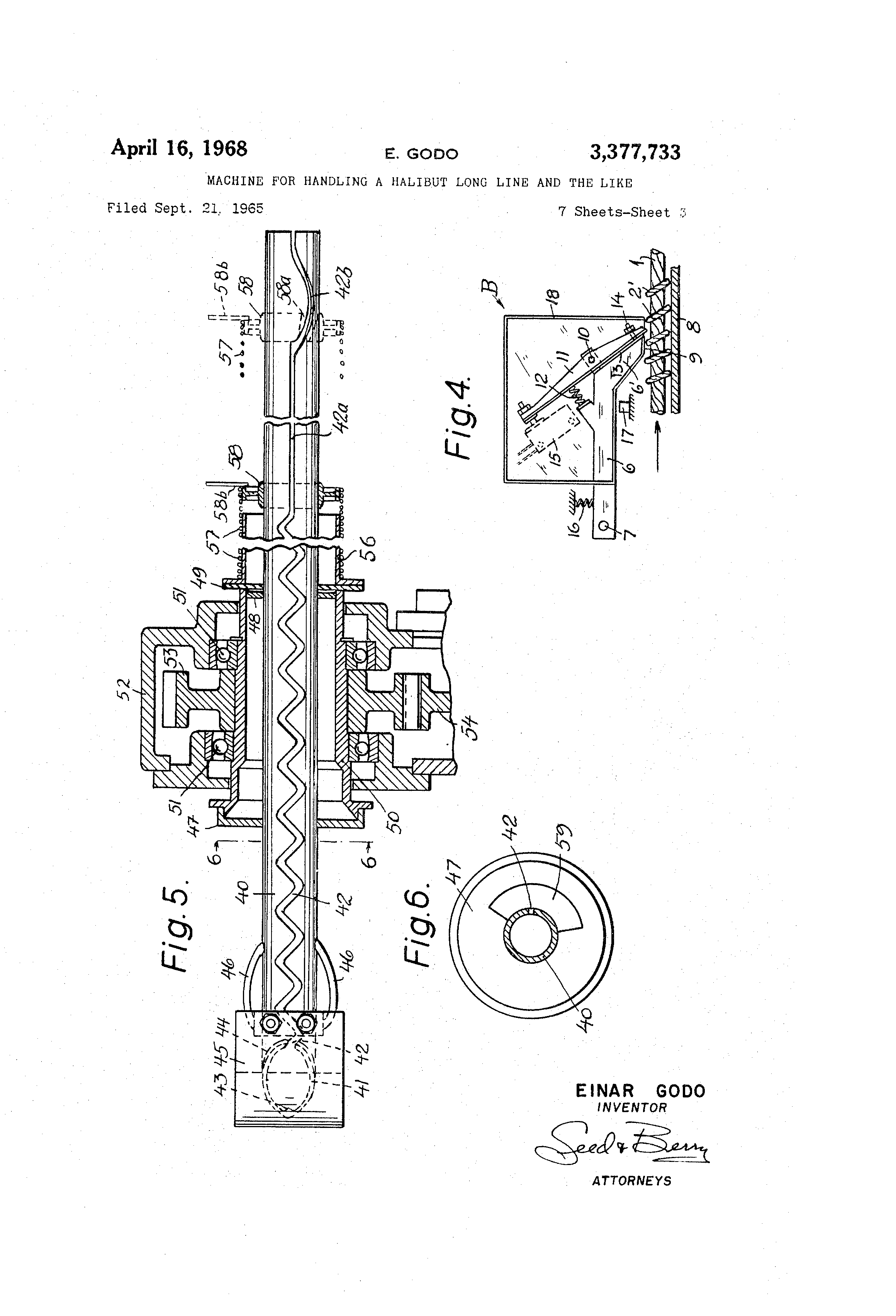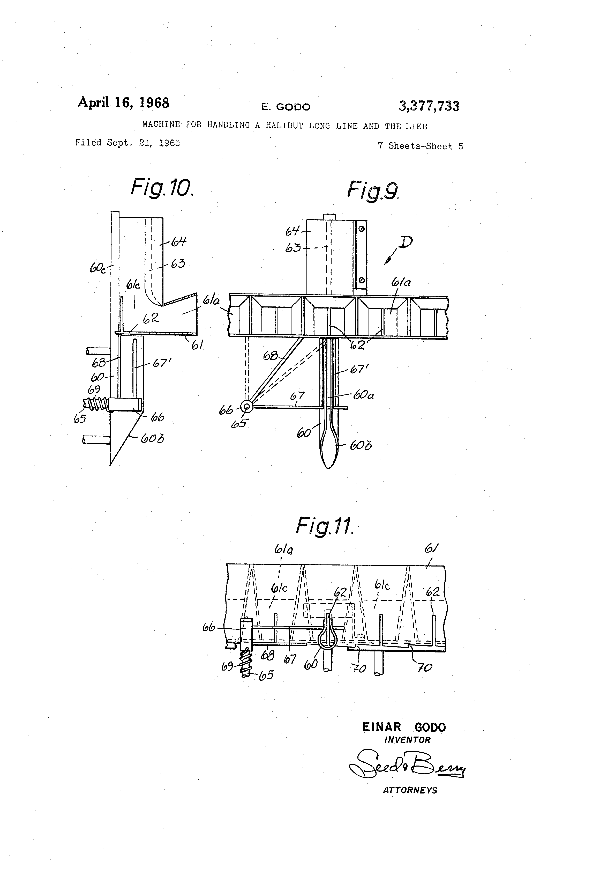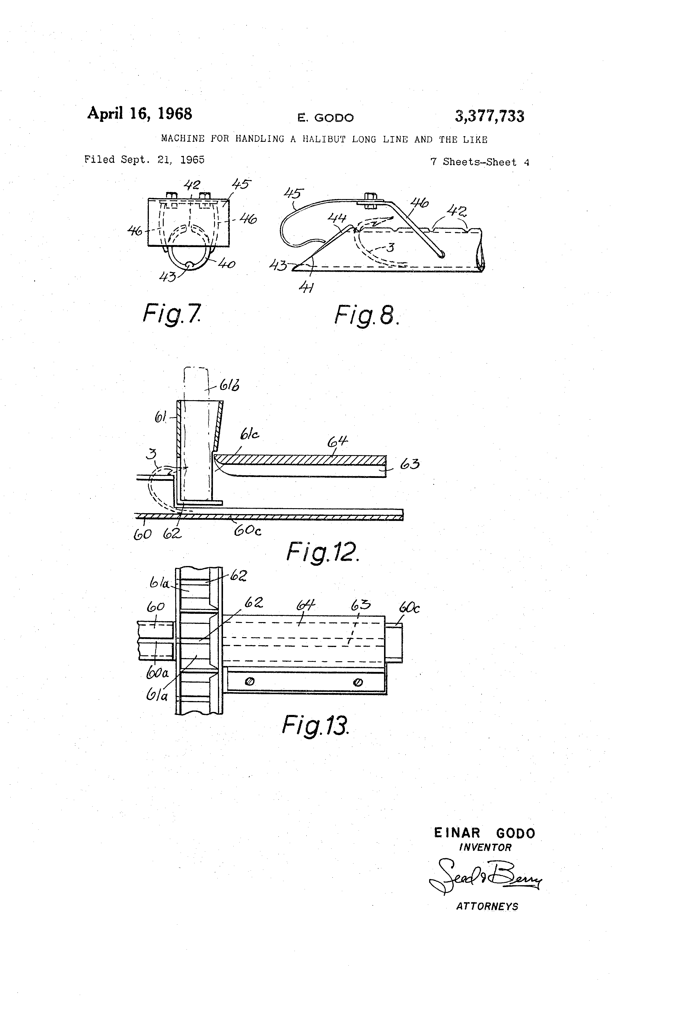 8,c,,77,738 Referriiig to FIGS. 15 throligli 19, the gi-olind line is pressed into the groove of tlie s@eave of the gurdy S by the wheel 76 aild moves from the -roove throu.-h a flexible pipe 77 which has a slot through which the gangion extends. The end of the pipe 77 adjacent the gurdy S is made of rigid material and may extend into the groove of the gi,rdy sheave and is supported by attachme-@it to an arm 78 carried by the gurdy as ilIListrated in FIGS. 15 and 16. The ri.-id end of the pipe 77 thus serves to force the ground line I and gangion 2 out of the groove of the sheave in case they tend to bind. The horizontal arm 78 is fixed to the -urdy and is provided witli a bearin- 79 for rotatably mounting with the vertical shaft 80 which has a sheave 31 fixed to its upper end. The sheave 81 is driven by a belt 82 wbich is iii turn driven by a sheave 83 fixed to the powered sheave 75 of the gurdy. The lower portioii of the shaft 30 is bent at an angle so as to give the ground line the desired coiling diameter. The outer or free end of the flexible pipe 77 is attached to the berit end of the shaft 80 by means of a bearin- 84 such that the pipe's end which is paral'el with the ;haft coils the ground Iiiie 1 onto the deck in a desirable coil. The speed of the ground line relative to the speed of the shaft 80 determines the position and size of the coil. Although it would be possible to dimension the pipe 77 large enough to allow the hook and bait to pass throu@ @h together with the ground line, sLich an irrargeir@ent would be subject to many difficiilties including possib'c loss of bait, snarlin- of hooks and other damage if the ground li-@ie were overly stiff. Accordii,-Iy, the present invention provides aii improved device which moves the -baited hooks from the baiting ma.-azine D through a slotted holder 85 v@,hich runs parallel with the sheave 75. A portion of the holder 85 is removable and is bent downwardly 'Lo the deck. After the reniovable portion is fil'ed with baited hooks for a skate, it is detached and movedto.-etlier with the skate for setting. This keeps the bailed hooks from getting tangled. The holder 85 for movin,@ the baited hool-,s is shown in detail in FIGS. 15 to 19. As illustrated, the holder 85 is parallel with the circumference of the sheave 75 and has a rectaii.-Illar hoilow cross section witli a slot 86 in the outer side wall thereof as illuslrated in FIGS. 18 and 19. The wall 37 of the holder below the slot 86 is bent inwardly such that it makes a curved ed@e 83 on which the baited hook slides and is kept from falling out of the hold@-r. The entrance of the holder 85 is faste-@ied to the blocks 64 behind the baiting rqagazinb D in siich a position that the baited hook 3 comiri@ from the groove 63 in the block enters the holder 85 and slides on the side 87 and is kept from fallin- off by the ed@e 88. This relationship is shown clearly in FIG. 17. To facilitate the hooks entry into the holder 85, the top wall@ of the holder is omitted at the c-itrance as illtistrated in FIGS. 16 and 17 and a @uide plate 89 keeps the liook from falling 01-t the edge 88 as it moves into the holder. The slot 86 is shaped in such a manner that the hook 3 cannot ftll offwhile being dragged alonthe holder. The holder bends downwardly toward th, deck wh@-re it is connected to a removab'e hold--r portion 85a which ends at the deck 90. Along the outer side of the holder 85 and parallel with the s,,ime is a guide rod 91 which serves to motint a slidab'.c pusher meri-iber 92. The pusher wember 92 is connected by a universal joint 93 to the free end of a piston rod 94 of a double actin.- hydraulic cylinder 95, the other end of which may also be universally mounted. The slidable pusher member 92 is formed with an angle-shaped portion 96 which travels a'on.- the outer surface of the underside of the holder 85 as shown in FIG. 19. The end of the guide rod 91 adjace-t the liydraulic cylinder 95 is bent olit from the holder 85 such that the angle portion 96, when the piston rod is in its fully retracted position, allows a baited hook to pass by under tension of the -an.-ion. The mountin.- means for the dif,erent parts described niay b.- of a@iy form and siiape for co,@i10 venience and are not shown here for the sake of simplicity. The baited hooks are dra.-ged by the gangion into the holder 85 and alon.@ the holder uptil they pass by the angle portion 96 of the pusher member 92 which is in its retracted position. At this point, the tension in the gangion ceases as a result of the groun,d line leaving the sheave 75 and bein.- coiled. When the hook passes a point X on the holder 85 it opens a valve by means of 10 a suitable co@itact member (not shown.) to energize the cylinder 95 which moves the an,ale portion 96. The angle portion 96 pushes the hooks 3 with a bait 61b along the holder 85 until it reaches a previously located bait piece where.it actuates a second contact member (not shown) 15 to open a valve for returning the piston to its initial position. The baited hooks are iii this manner moved one by one into the removable holder 85a unt@il it is filled. The removable holder may then be detached and replaced with a new holder. 20 TIle above described mechanism may also be used for coilin.- the -round line and entering t@he hooks on the holder 85a without baiting the hooks after a fishing trip is over. The described method and system of the present inven25 tion makes possible the handling of a ground line in a contintious and completely automatic process. The device will unwind the gangion -Af necessary, bait the hooks and place them in a holder while, at the same time, coilin.- the ground line orito the deck such that it is ready 30 for the next settin,@. It will be readily apparent to those skilled in the art that the present invention provides novel aild useful improvements in methods an,d devices for taking in, cleaniiig and baiting of a strilig of gear of the character d-,scribed. The arrang