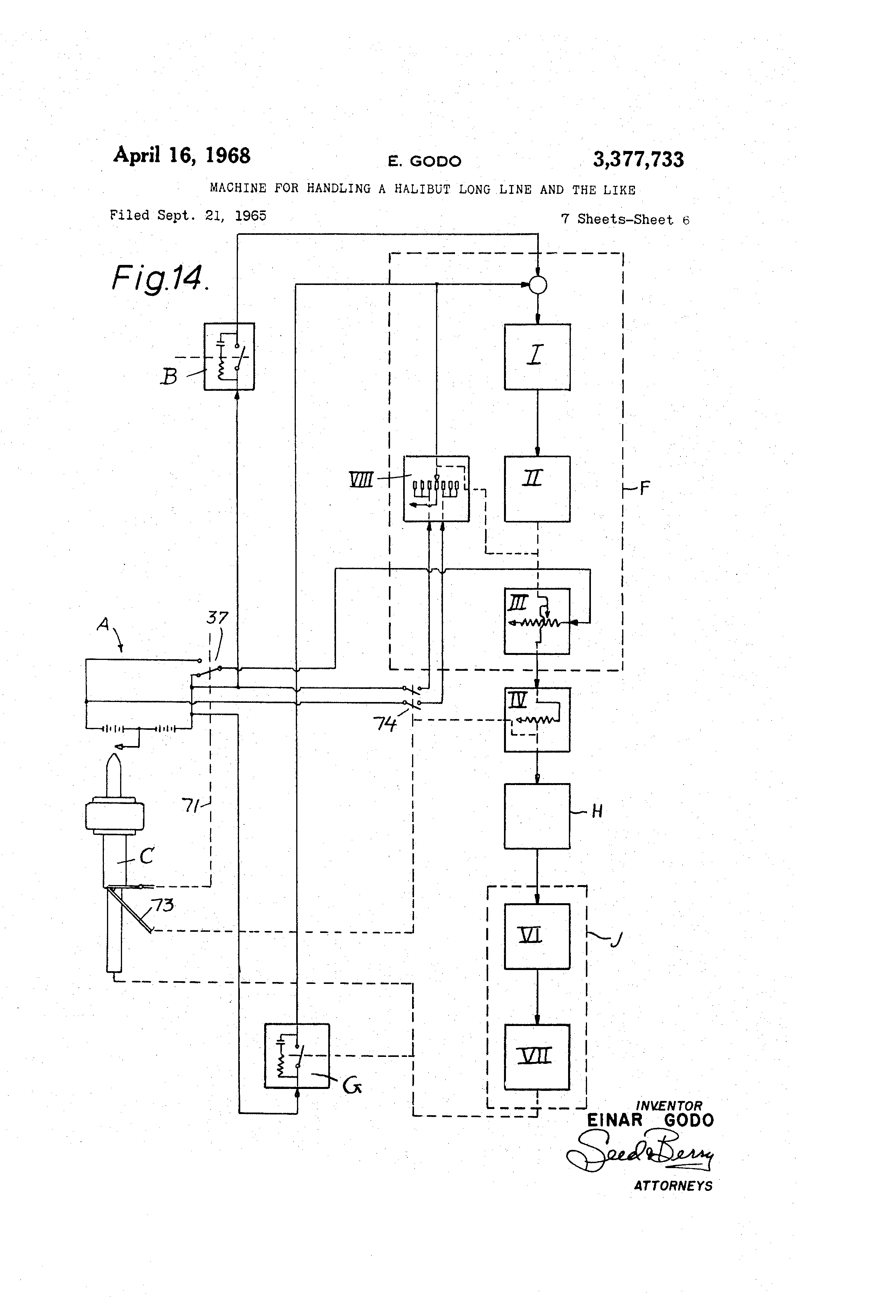 Utlited States Patent Office 3,377,733 3,377,733 MACHINE FOR HANDLING A HALIBUT LONG LINE AND THE LIKE Einar Godo, 17103 NE. 16th Place, Bellevue, Wash. 98004 Filed Sept. 21, 1965, Ser. No. 489,013 12 Claims. (C). 43-4) The present invelition relates generally to a device for bandling long lines commonly used for taking bottom fish such as ha:libut, cod etc., ,vberein a grotind line is provided with spaced gangions which carry the fish hooks. More specifically, the present invention relates to a device for atitomatica:lly unwindin- t@e gangion from the ground line as it is batiled in, baiting the hook and coiling the ground line, gangion and baited hooks so as to be ready for reuse. The type of gear used in -long line bottom fisbing consists of a grourd line havin.- a plurality of gar@gions tied thereto at soaced intervals with each of the gangions beiii@ provided with a fish hook. The length of the gan-ions and their sj)acing on the ground line depends upon the type of fish wbich is to be cail,-ht. As an exaiiiple, in halibut fishing, th-. gan.-ions are placed on the ground line at intervals of from 9 to 13 feet with the gangions bein@- 3 to 4 feet in length and havin.- a diameter of appioximately 1/6 inch. The ground lipes may have a diameter of from 1/4 tO 5/16 inch and have a length of froni 1500 to 1800 feet. Each individual length of ground line is known as a "skate" apd a number of skates, typically 3 to 7, are tied together and called a strin.- of gear. After the skates have been baited and tied to,gether, the string o'll gear is thereafter set in the water. The setting of a strin.a of gear is accomplished by fasteiiing one end to an anchor Nvhich is provided with a btioy line and a buoy. The biioy and buoy line are let out first and then the anchor is thrown overboard fol,lowed by the skates wbich run out through a chute at the rear of the boat, and an attendant fastens a second ai-ichor to the other end of the string of gear. The secord anchor is also provided with a buoy line and a buoy all of which are in turn put into the water. After the string of gear has been on the bottom for a certain lenbth of time, derending upon the particular flsliin- ground, it is taken back aboard the boat and the fish are removed. The gear is taken in by first taking in the btioy and btioy line so as to raise the anchor. The blioy Iiiie is then coiled onto the deck and the skate is hauled in over a roller at the boat railin@g. A man at the roller normally takes the fish off the hooks as the skate is hatiled in and the skate is coiled onto the deck. According to prior art metliods, each skate is then carried by hand to another location on the boat where the hooks are baited and the skate recoiled so as to be ready for resettin,-. Since the gan.-ions become wound around the ground line when the gear is taken in, they must be unwoiind by hand before the hooks are baited and then the skate Tnust be c6iled by band so as to be ready for resetting. As will be appreciated by those familiar with the procedure, the job of taking in the skatcs, coilin- them on deck, removing the turns of .-angion wotind around the ground line, baiting the hooks and making the skate ready for reuse is very time consuming and hard work. In addition, those performing the work are apt to experience damage to the hands becluse of steady contact with the roiighgear. According to the present invent:@on, an automatic device is provided for handling the gear witholt the need for the manual labor reqtiired in prior art. As the skate is being hauled in, the present device provides means for determinin.- the direction and number of turns of the Patented Apr. 16, 1968 2 individtial gangions about the ground line and registering this inforrnation in a control system by storing pulses. The stored pulses in the control systeni are then used to control the unwinding of the gangion in the proper direction and correct ntimber of turns b3i means of a turn remover which rotates around the ground line. After the gangions are unwound, means are provided for auto-niatically baiting the hooks on the gangions from a movable bait ma,- azine. The device then coils the skate onto 10 the'deck or in a tub or the -like with the baited hooks properly oriented so that the skate is ready for resetting. The primary object of the present invention, is therefore, to provide a device for hai-iling in a halibut long line or the like, unwinding individual gangions from the 15 lines, baiting books carried on the gangions and coilin@g the line ready for resettiiig. AP-other object of the present invention is to provide a device of the character described which is completerly automatic in operation with no need for manually haii20 dlin- the -line, gangions and hooks. Another object of the present invention is to provide a device of the charac,er described wherein the direction in - ",hich the gangioii is wound about the line and the number of turns of tie gan-ion are sensed and the in25 formation stored i-ii a-q clectrical control system which controls the operation of a tiirn remover. A ftirther obiect of the present inve@2tion is to provide a device of the character described wherein the turns of the gan-ions @ire removed by rotatin.- the gangion about 30 the -lir@e as the line is hauled in. A flirther object of the present invention is to provide a device of the character described wherein the rnoving hook passes throti,@h a bait magazine and wherein the movement of the hook is used to step the magazine so as 35 to advance the bait into position where it can be picked up by the hook. A still further object of the present invention is to provide a dev:.ce of the character described which coils the line and orients the gangions and baited hooks in a 4( manner to prepare the line for resetting. Other more particular objects and advantages of the invention wiil, with the foregoing, appear and be understood from the following description and claims, the invention consi