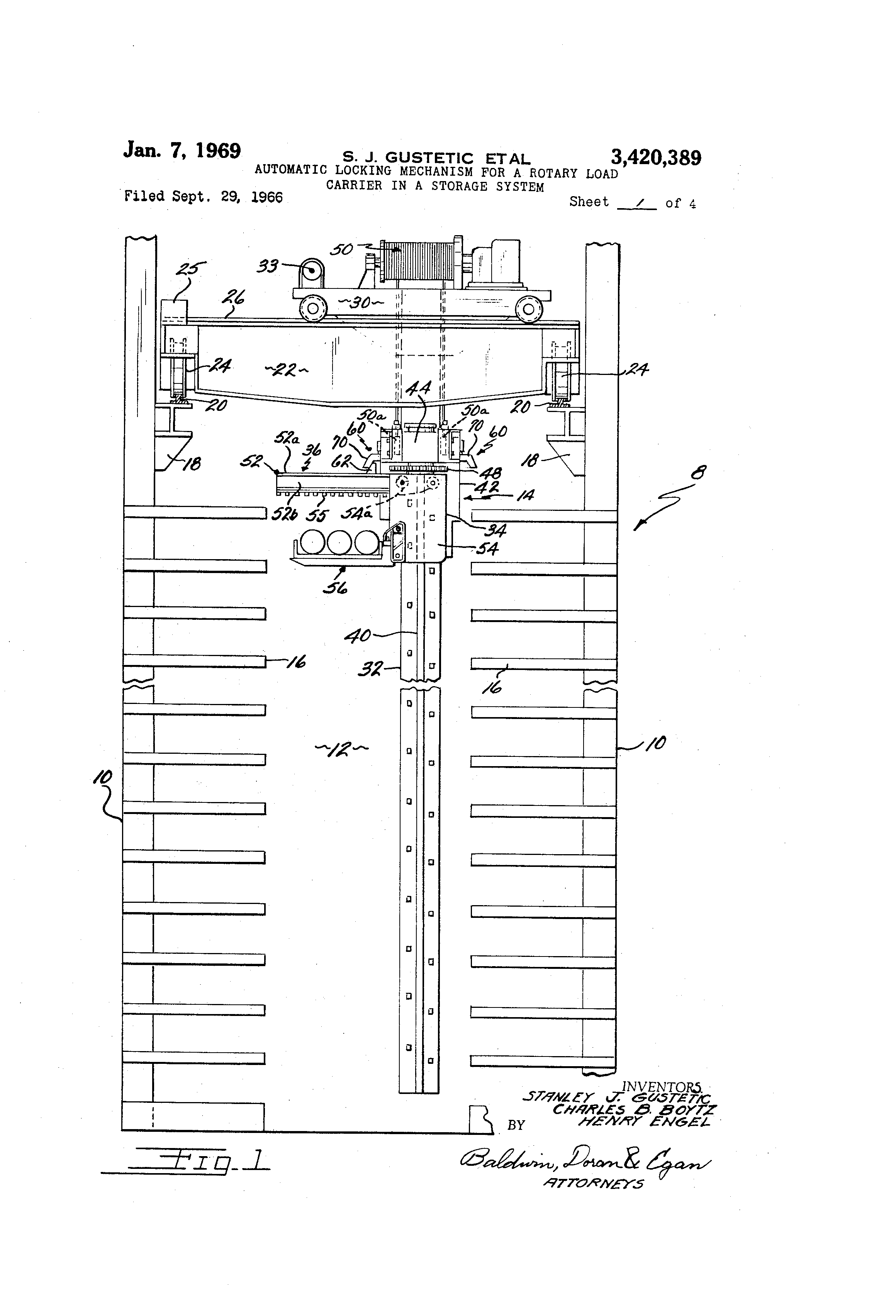 claim: 1. In a load transfer and storage mechanism comprising storage means adapted to receive loads therein, a movable load carrier including a support and an extractor mounted on the support, said load carrier being adapted to m'ove along a travel zone disposed adjacent the storage means for depositing loads into and retrieving loads from said storage means, means rotatably mounting said extractor on said support for rotary movement of said extractor about a generally vertical axis, electric power neans for rotating said extractor to cause rotary movement of the latter with respect to said support and said stora,@e means, power actuated locking means adapted for coaction b-.tween said support and said extractor for locking said extractor in predetermined position with respect to said support and said storage means, said locking means including ffuid power operated motor unit mears for actuation and deactuation of said locking means, control means for said motor unit means and said electrical power means, said control means including fluid pressure switch means and other switch means in circuit with said fluid pressure switch means, said switch means bein.- operative to cause automatic actuation of said motor unit means to move said locking means to locking condition when said extractor is rotated to said predetermined position and operative to automatically actuate said motor unit means to move said locking means to unlocking condition upon initiation of actuation of said electric power means for rotating said extractor from said predetermined position, said electric power means being responsive to unlockiiig of said locking means by said motor unit iiiearis to cause 8 rotary movement of said extractor away from said predetermined position. 2. A load transfer and storage mechanism in accordance with claim I including means for furnishing pressurized fluid to said motor unit means, and said control means including valve means coupled to said pressurized fluid furnishing means and to said pressure switch means for controlling the application of pressurized fluid from said pressurized fltiid furnishing means to said motor unit 10 means and vice versa. 3. A load transfer and stora-e mechanism in accordance with claim I wherein saiwsupport includes a hoist carria,@e movable vertically on generally vertically extending mast structure, said extractor being rotatably mounted 15 on said hoist carriage for movement about said generally vertical axis, said locking means including a bracket, a hook member pivoted to said bracket for movement in a generally vertical plane, said fluid powered motor unit means comprising a reciprocal dotible-acting fluid-pow20 ered motor unit coacting between said bracket and said hook member for pivoting said hook member in said generally vertical plane, and lug means adapted for locking coaction with said hook member when said extractor is in said predetermined position and said hook member is 25 pivoted by said motor unit toward said lug means, to lock said extractor in said predetermined position. 4. A load transfer and stora.-e mechanism in accordance with claim 3 wherein said lug means is mounted on said extractor and includes a generally vertically oriented abut30 ment thereon, said control means including plunger means movably mounted on said hoist carriage adapted for engagement with said abutment on said lug means for actuation of said plun-er means when said extractor is moved to said predetermined position, and said other switch 35 means being mounted on said load carrier and adapted for actuation by said plunger means when said extractor is in said predetermined position, for controlling in conjunction with said pressure switch means the actuation of said electric power means for rotatin.- said extractor. 40 5. A load transfer and storage mechanism in accordance with claim 3 wherein said hook member comprises a generally vertically oriented tapered wedging face sloping downwardly in a direction away from the pivotal mounting of said hook member to said bracket, and said 45 lug means includes a complementary generally vertically oriented tapered wedging fa-,-. adapted for wedging coaction wilh said hook wedging face in the engaged condition of said hook member and said lug means, said lug means being motinted on said extractor and said bracket 50 being mounted on said carriage. 6. A load transfer and storage mechanism in accordance with clain-i 3 wherein said storage means includes laterally spaced storage sections defining said travel zone therebetween, said locking means comprising a pair of 55 hook members each of whicb is pivoted to an opposite side of said hoist carriage for movement in a generally vertical plane and in generally confronting relation to the respective one of said storage sections, said fluidpower motor unit means comprising a pair of reciprocal 60 double-acting fluid-powered motor units, each one of which is coupled to a respective of said hook members, said motor units being coupled in parallel for simultaneous pivotal movement of said hook members, said locking lug means comprising a pair of transversely spaced 65 lugs mounted on said extractor for rotary movement with said extractor, one of said lugs being adapted for locking coaction with a respective one of said hook members when said extractor is di,-,Posed in confronting relation 70 with one of said stora-e sections, and the oth,-r of said lugs being adapted for locking coaction with the other of said hook members upon rotation of said extractor approximately 180 degrees. 7. A load transfer and storage mcclianism in accord75 ance with claim 3 wherein said control means includes 9 electroresponsive means in circuit with said electric power means and said pressure switch means for controlling actuation of said electric power means for rotating said extractor. 8. A load transfer and storage mechanism in accordance with claim 2 wherein said pressurized fluid furnishing means inclu