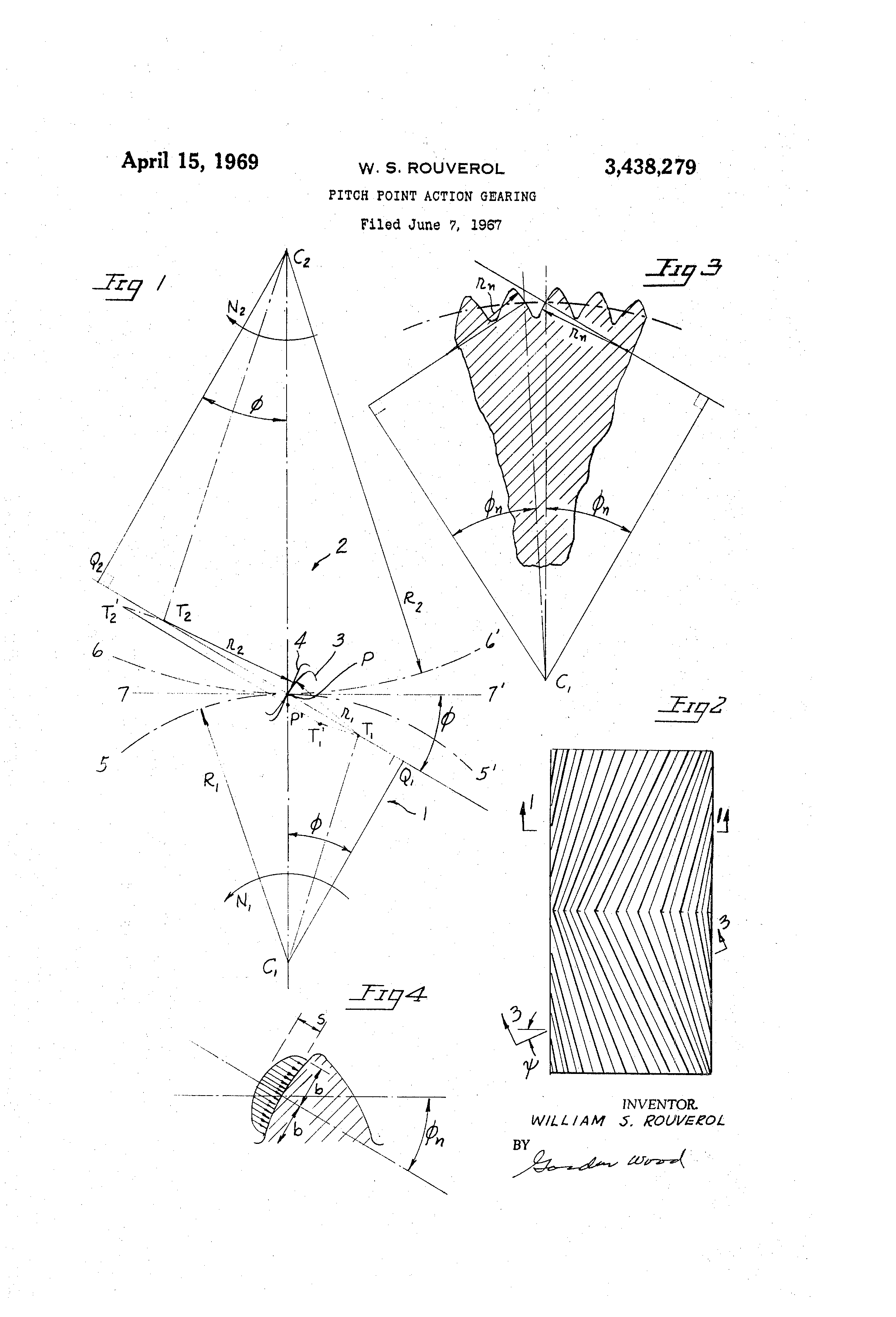 claimsi 60 I claim: 1. In a pair of mating gears, teeth formed to extend across the rims of said gears in a direction slantingly disposed with respect to the pitch line of said pair to produce at least one area 65 8 of contact between said pair for all rotational positions of said pair, said teeth being formed so that the centroid of said area of contact lies substantizilly on said pitch line for all rotational positions of said gears. 2. In a pair of mating gears, teeth formed to extent across the rims of said gears at a sufficient angle with respect to the pitch line of said pair to produce at least two separate areas of contact between said pair, said teeth having in sections perpendicular to said pitch line active profiles of relative radius of curvature at the pitch line less than the product of the pitch radii of said pair times the sine of the pressuret angle divided by the sum of said pitch radii. I . I 3. A pair of mating gears according to claim I or 2 Wherein the pitch and pressure angle of the teeth are such that when the maximum allowable torque is applied to said.,-ears each said area of contact occupies substantially the full height of the tooth face. 4. A pair of mating gears accordin.- to claim I or 2 wherein the centers of curvature of said teeth at said area of contact are substantially removed from said pitch line@ 5. A pair of mating gears accordin.- to claim 1: or 2 wherein the teeth of at least one gear ar@ formed of moldable material. 6. A pair of matin@ gears accordin- to claim I or 2 wherein the active profiles of the teeth in the normal plane are circular arcs. 7. A pair of mating gears according to claim 1 or 2 wherein the active profiles of the teeth in planes normal to the pitch line are circular arcs. 8. A pair of mating gears according to claim I or 2 wherin the active faces of the teeth of at least one gear are of dry bearing material. 9. A pair of mating gears according to claim 11 I wherein said teeth have in sections perpendicular to the elements of the respective pitch surfaces of said gears active profiles which are intersected by said pitch surfaces at the central portions of said profiles, the relative radius of curvature of engaging se.-Ments of said central portions being less than the relative radius of curvature of conjugate profiles, 10. The method of reducing the average sliding velocity of the teeth of mating - ears below the average sliding velocity attainable with conjugate gears of the same pitch line velocity, comprising forming said teeth(a) to extend across the rims of said mating gears in a direction slantingly disposed with respect to the pitch line of said mating gears, (b) with active profilcs which are intersected by the respective pitch surfaces of said matin- gears, and (c) with active pr6files of relative radius of curvature less than the relative radius of curvature of conjugate profiles. References Cited UNITED STATES PATENTS 2,230,418 2/1941 Wildhaber ----------- 74-462 2,686,155 8/1954 Willis et al. DONLEY J. STOCKING, Pi-in7aiy Examiner. LEONARD H. GERIN, Assistant Examiner.