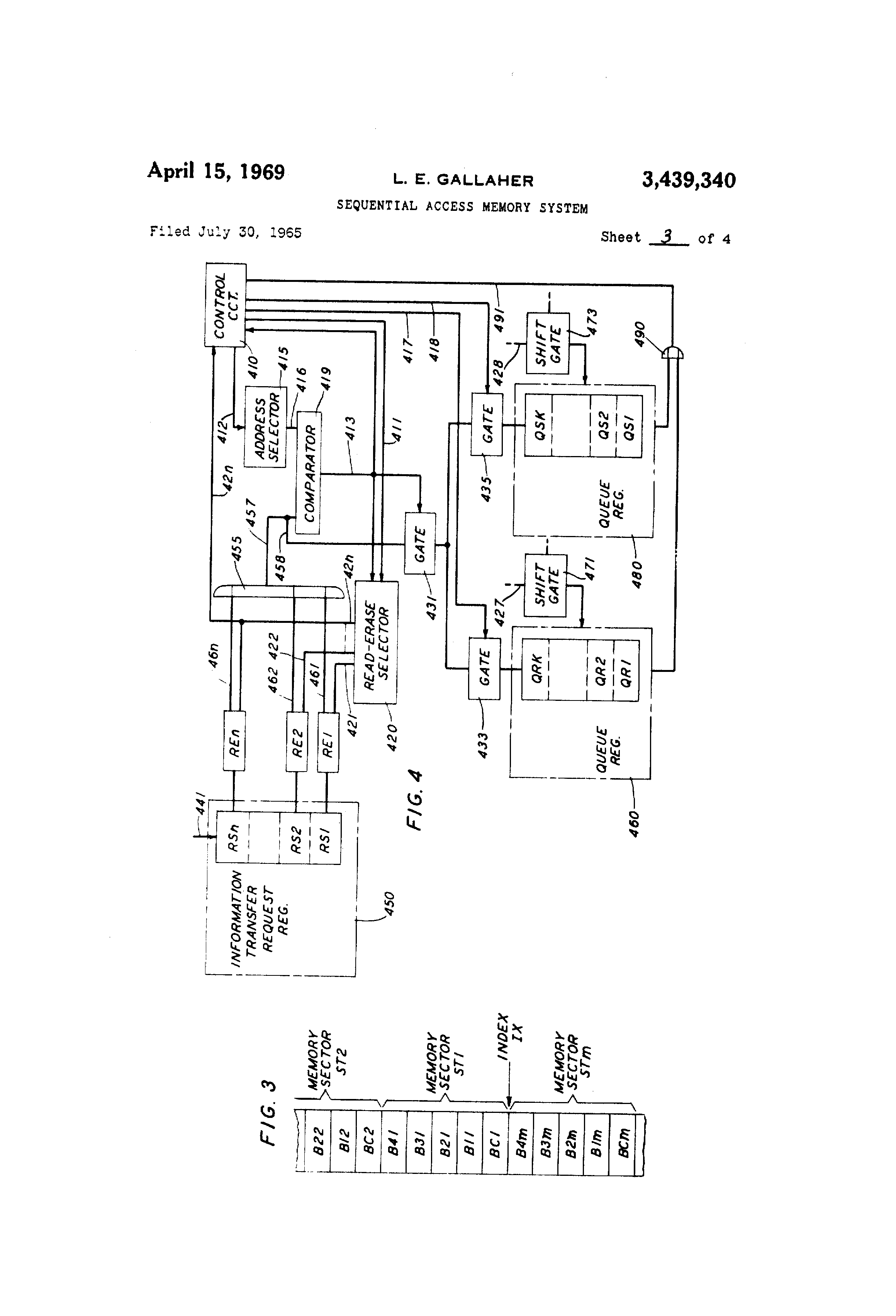 claimed is: 1. In a seqliential access memory sl,stem the combination for increasing the information transfer rate of said memory system comprising, means for receivin@ informition transfer requests, means for re.-istering said requests in the consecutive order in which they are received, a plurality of queue registers for registerina group-s of said information transfer requests, means for r@, -ading said requests individually from said registering means and for placing said individual requests in selected areas of said plurality of queue registers in ordered sequences, said ordered sequences corresponding to the order of sequential access to said memory system, and means for transferring information to and from said memory system in accordance with the information transfer requests registered in a selected one of said plurality of queue registers. 2. In a sequential access memory system the combination for increasing the information transfer rate of said memory system comprising, means for receivin.- and registering individual random address information transfer requests in the consecutive order received, means for 14 ordering said individual randoni address information transfer requests by groups in the serial manner in which access to the addresses in said sequential access memory system occurs, and means for processing each of said ordered groups of information transfer requests in turn during respective periods of said memory system. 3. In a sequential access memory system the combination in accordance with claim 2 wherein said processing means is operative to process an ordered group of said information transfer requests concurrently with the operation of said ordering means in ordering another group of information transfer requests. 4. In a sequential access memory system the combination in accordance with claim 3 wherein said ordering l@5 means comprises at least a first and a second queue register each having a plurality of register stages individually capable of registering a single information transfer reqliest and wherein said processing means comprises means for selectively reading out information transfer @)( requests from said register stages of one of said first and second queue registers in a selected register stage sequence. 5. In a sequential access memory system the combination in accordance with claim 4 wherein said queue 2:-, register stages are individually associated with predeterniined distinct address portions of said sequential access memory system and wherein said ordering means further comprises means for steering each information transfer request into the respective one of said register stages 3( associated with the address portion of said sequential access memory system to which said information transfer request is directed. 6. In a sequential access memory system the combination in accordance with claim 5 further comprising, means responsive to the registration of an information transfer request in a register stage of one of said first and second queue registers for preventing the registration of a subsequent information transfer request in said register stage until all of the information transfer requests 40 in said one queue register are processed. 7. In a sequential access memory system the combination for increasing the information transfer rate of said memory system comprising, means for receiving and re,@istering individual random address information trans4r) fer requests as they are received, means for ordering a first plurality of said registered information transfer requests in the serial sequence in which access to addresses in said memory system occurs, means for processing individual ones of said first plurality of informa50 tion transfer requests in said ordered sequence, rneans for ordcring a second plurality of said registered transfer requests in said sci-ial sequence during said processing of said first plurality of transfer requests, and means including said processing means for pr(>cessing said second 55 plurality of transfer requests in the sequence ordered upon completion of processing of said first plurality of transfer requests. 8. In a sequential access memory system the - combination for increasing the information transfer rate of said Go memory system comprising, means for registering individual random address information transfer requests as they are received, control means, means including said control means for ordering a first group of said registered information transfer requests in an address sequence hav65 ing a predetermined relationship with the organization of addresses in said sequential access memory system, processing means, means including said control mean and said processing means for processing said first group of information transfer requests in the address sequence 70 ordered and concurrently for ordering a second grOLIP Of said re.-istered information transfer requests in an address sequence liaving a predetermined relationship with the organization of addresses in said sequential access memory s@,stem, and means including said processing means 75 for pi-ocessin.- said second gr(ILIP of inform-itiontrinsfer 3,439,340 15 requests in the address sequence ordered upon completion of processing of said first group of information transfer requests. 9. In a sequential access memory system the combination in accordance with claim 8 wherein said ordering 5 means further comprises, means for ordering said first and second groups such that the first information transfer request in the subsequently ordered one of the first and second groups follows the last information transfer request in the preceding ordered one of said groups in the 10 same serial manner as said address organization of said sequential access memory system. 10. In a sequential access memory system the combination for increasing the information transfer rate of said memory system comprising, means for registering said 1,5 transfer requests initially in t