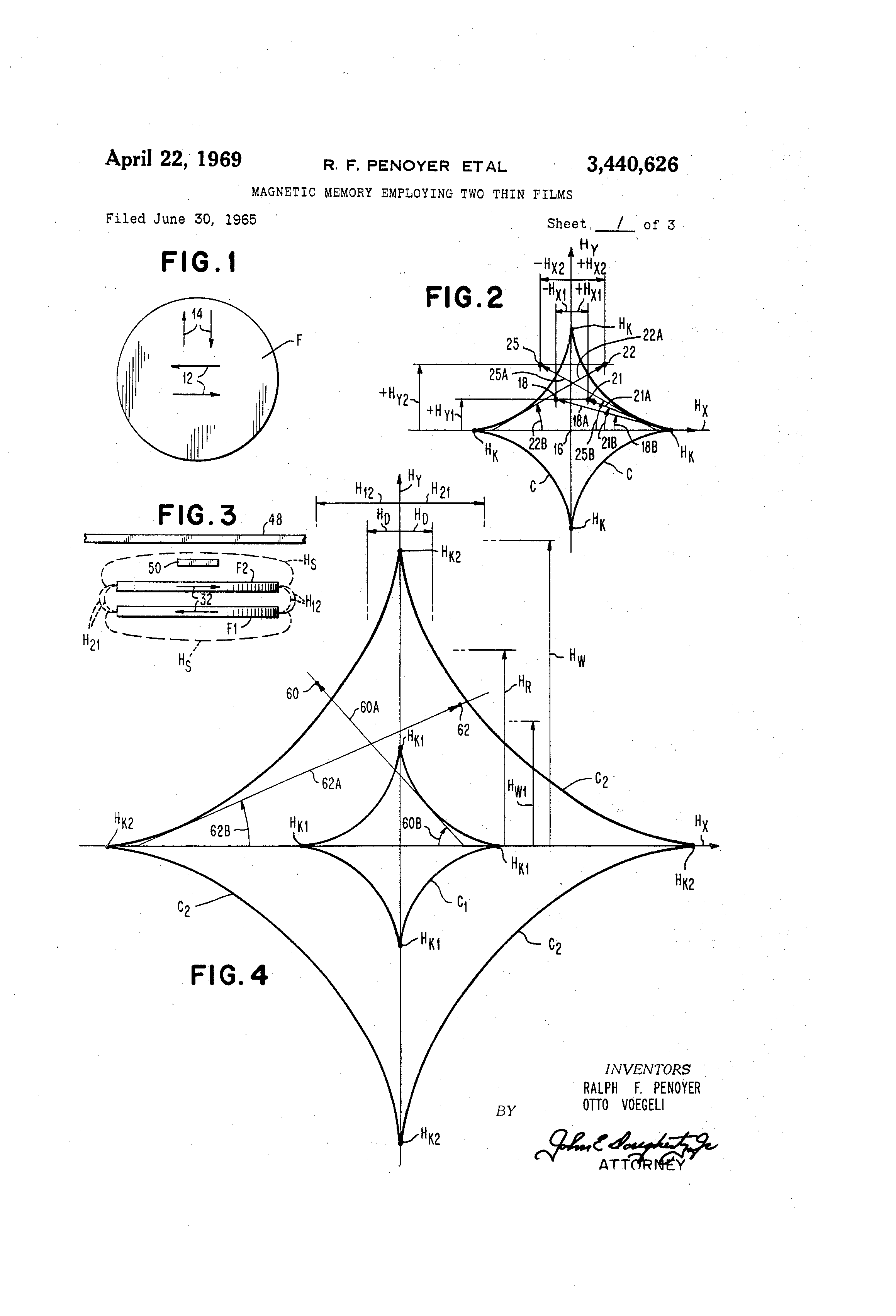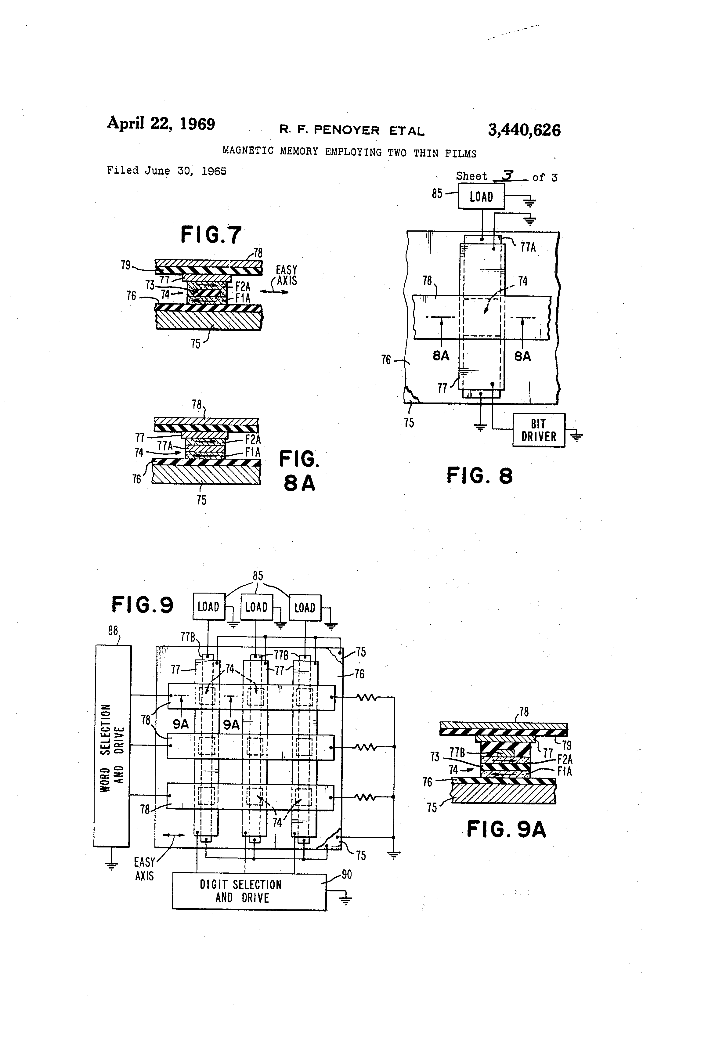 claimed is: 1. A magnetic memory comprising: (a) a coupled film storage element including first and second anisotropic magnetic thin films arranged adjacent each other in spaced parallel planes; 30 (b) said first thin film havin.- a first easy axis and when storin.- information being magnetized with the magnetic mornents therein ali.- ned in one direction parallel to said first easy axis; (c) said second thin film having a second easy axis 35 parallel to said first easy axis and when storing information being magnetized with the magnetic moments therein ali.-ned parallel to said second easy axis in a direction opposite to the direction of magnetization in said first i'ilm; 40 (d) the magnetization in said first thin film in said first direction applyin.- to said adjacent second thin film a magnetic field in said opposite direction along said second easy axis; (e) the magnetization in said second thin film in said second direction applying to said adjacent first thin 45 film a magnetic field in said one direction parallel to said first easy axis; (f) said first thin film having a first uniaxial anisotrodv field: (,-) @'aid se'cond thin film having a second uniaxial 50 anisotropy field greater than said first uniaxial anisotropy field of said first thin film; (h) word conductor means and bit conductor means each arranged adjacent to and entirely external to said coupled film storage element formed by said 55 first and second films; (i) energizing means connected to said word conductor means and said bit conductor means for writing information in said coupled film storage element by energizing said word conductor means and said bit 60 conductor means each of which is entirely external to said coupled film stora.-e element, and for nondestructively interrogating said thin film storage element by energizing only said word conductor means which is entirely extemal to said coupled film stor65 age element; (j) said bit conductor means extending in a direction perpendicular to said first and second easy axes; (k) said word conductor means extending in a direction parallel to said first and second easy axes and 70 when energized to,@ether with said bit conductor means to write information or when energized alone durin.- a riondestructive read operation, applying to both said first and second films a field in a direction 75 perpendicular to the easy axis of the films, 2. The memory of claim 1 includin- output sense means connected to said bit conductor means. 3. The memory of claim I wherein said uniaxial anisotropy field of said second film is at least twice said uniaxial anisotropy field of said first film. 4. The memory of claim I wherein said ma.-netic field ,ipplied perpendicular to said easy axes by said word con ductor means when energized to nondestructively inter3,440,626 12 ropy field for said first film and is less than the tiniaxiil anisotropy field for said second film. References Cited 5 UNITED STATES PATENTS 3,188,613 6/1965 Fedde -------------- 340-174 3,302,190 1/1967 Boylan et al - -------- 340-174 3,252,152 5/1966 Davis et al ----------- 340-174 rogate said storage element exceeds the uniaxial anisot- 10 STANLEY M. URYNOWICZ, Pi-itizai-y Examinei-.