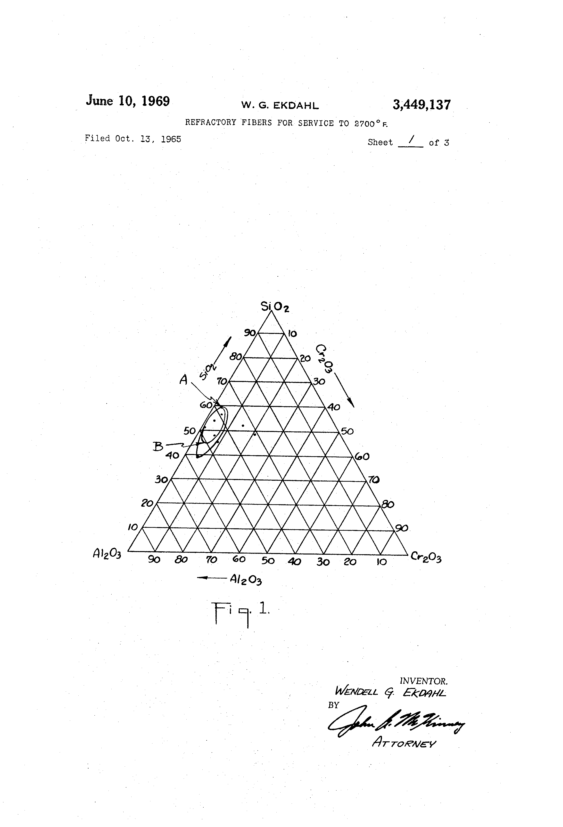 9 bility of a -lass havin.- a composition consisting essentially of alumina, silica and chromic oxide within the relative proportions by weight defined by the area bound by the line A of the triaxial diagram of FIG. 1 of the drawing. 10. The refractory inorganic fiber defined in claim 9 wherein the relative amounts of the alumina-silica content of the composition are proportioned within an alumina to silica ratio of between 0.62 A1203 tO 1 SiO2 and 1.2 A]103 tO I SiO2- 11. Refractory inorganic fibers of improved tbermal stability of a glass having a composition consisting essentially of alurnina, silica and chromic oxide within the relative proportions by weigbt defined by the area bounded by line B of the triaxial diagram of FIG. 1 of 15 106-52 the drawing. 10 12. The refrac tory inorga nic fiber define d by claim 11 where in the relativ e amou nts of the alumin asilica conte nt of the comp osition are propo rtione d within an alumin a to silica ratio of betwe en 0.69 A1203 tO I SiO2 and 0.95 A1203 to I SiO2- References Cited FOREIGN PATENTS 10 495,654 11/1938 Great Britain. JAMES E. POER, Piimai-y Examiner. U . S . C l . X . R . 3)449)137