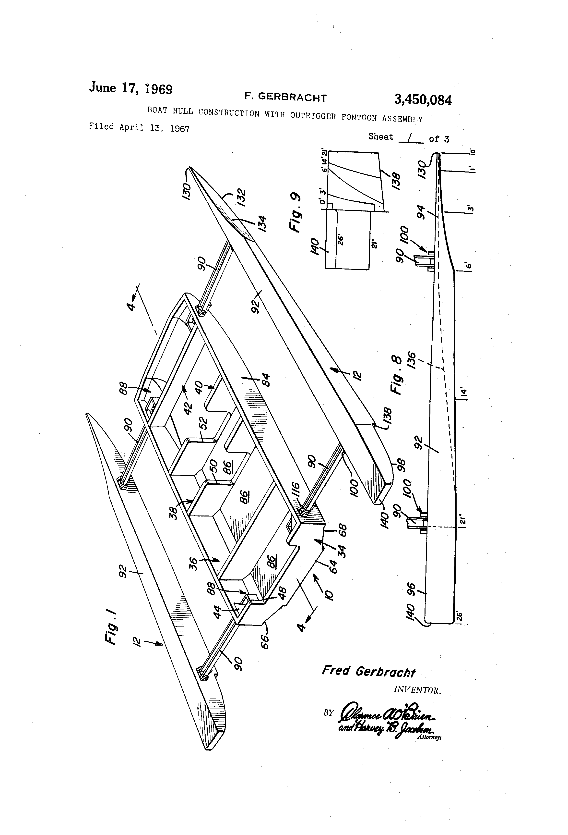 Utuoted States Patent Office 3@450@084 3,450,084 BOAT HULL CONSTRUCTION WITH OUTRIGGER PONTOON ASSEMBLY Fred Gerbracht, 2325 Seidenberg Ave., Key West, Fla. 33040 Filed Apr. 13, 1967, Ser. No. 630,629 Int. Cl. B63b 1/10 U.S. Cl. 114-66.5 7 Claims ABSTRACT OF THE DISCLOSURE A boat construction in the form of a hull coop@-rating with removable outri.-.-er pontoons associated with transverse frame members in the boat hull to provide adequate support for the outri.-,-er pontoons and longitudinal trusses co-joined with the transverse frame members to provide support to an impermeable covering fixedly attached thereto. The hull is substantially parallelopiped in configuration and provided with a pair of parallel sl)aced keels merging into a complexly curved bow. The present invention generally relates to improved and novel structure in boat construction generally in the form of a runabout hull having a novel cooperative relation with removable outrigger pontoons. As is well known, boating for pleasure, fishing, cruising and when in en.-a.-ement in various water sports is becoming inereasin-ly popular. Boats generally are constructed in a manner which renders them hi.-hly efficient for a specialized @purpose while being unacceptable for other purposes. For example, a boat which is adapted especially for fishin@ or skin diving would be relatively inefficient for use for towing water skiers. Attention is directed to mv prior U.S. Patent No. 3,061,845 and other prior art for recitation of the advantages offered by catamaran-type boats. It is therefore, one object of this invention to provide a boat hull construction which may be combined with outrigger pontoons to provide a catamaran-type of boat or employed without the outri,@.'er -pontoons so that the hull may be used for runabout service. The hull is substantially parallelopiped in form thereby eliminatina the single conventional pointed bow that rides high in the air rather than in the water and is primarily for the purpose of maintaining the itraditional image of a boat. With rny construction and with given over-all dirnensions, considerably rnore usable space is available than would be found in a like-size conventional hull bounded by curved surfaces. The specific construction of the boat hull of this invention provides for substantially minimal but tiniform freeboard for a - iven volume which renders it easy and safe for swimmers to enter the water and return to the boat without requiring the use of a boat ladder and also provides for a level decking, which taken with the floor or sole makes the entire area of the boat tiseful, or in other words, approximately doubles the useful area in cornparison to conventional runabout design. Another object of the present invention is to provide a boat hull which is strona but simply built and which depends upon two parallel longitudinal trusses positioned vertically in the sides of the hull so as to resist concentrated and reversing stresses that are created by altematively ho-gin- over a wave and then slammin.- down on the far side thereof and wallowing in the trou,-h and also will resist similar stresses that occur wh-.n launcbing and retrieving the boat hull and trailing it over rough roads. A further object of the present invention is to provide a boat hull construction consistin.- of two parallel longitudinal triisses positioned vertically in the sides of the hull Patented June 17, 1969 2 which are joined to and interconnected by a plurality of transverse frames with the transverse frames being joined by employing longitudinal stringers with the entire hull being covered with an exterior skin to provide a strong, water-tight strlicture built from simply shaped and simply joined pieces, more numerous but shorter spanned then are found in a conventional hull and thus requiring less costly materials and less skilled labor in its manufacture. 10 Still another object of the present invention is to provide a boat hull having a prismatic stern se ction with a narrow horizontal planing surface which is quite efficient for lightly loaded high speed operation with the horizontal planing surface being bounded on both sides by 15 upwardly inclined planes which extend to the chines so that with heavier loading, the hull assumes an increasing V-bottom characteristics, namely, an ability to plow through rough water with a heavy load with quasiplaning dynamics and without excessive pounding. The 20 forward end of the hull is a complexly curved section at least two sharply pointed bows that will cut into low waves and in combination with the outri.-gers will breast a higher wave, to disperse the water, generate spray, utilize some of the spray to decrease skin resistance and reduce 25 the impact of the water against the underbody and insure smoother and faster passage of the hull. Still a further object of the invention is to provide a boat hull having outrigger pontoons thereon including the provision of support arms to position the outrigger 30 pontoons in parallel spaced relationship to the center hull. The support arrns cooperate with transverse frames or trusses to transmit stresses thereto in which the position of the outrigaer pontoons may be adjusted and also oriented in an operative position or folded into a vertically 35 extending position to reduce the over-all width of the boat, The outri.-ger pontoons are specifically shaped and oriented intelation to the center hull to generate dynamic lift and thrust to counteract the plunging and yawing effect produced on the craft by driving a pontoon into 40 a wave. To reduce the sudden increase in dra.- when a pontoon is submerging, the cross-section of the bow portion is made triangtilar with the vertex downward so that buoyant lift increases about twice as fast as frictional drag with the bottom surface widening aft to form a hori45 zontal planing surface that terminates in a step slightly forwardly and above the transom chine of the center hull to make auxil