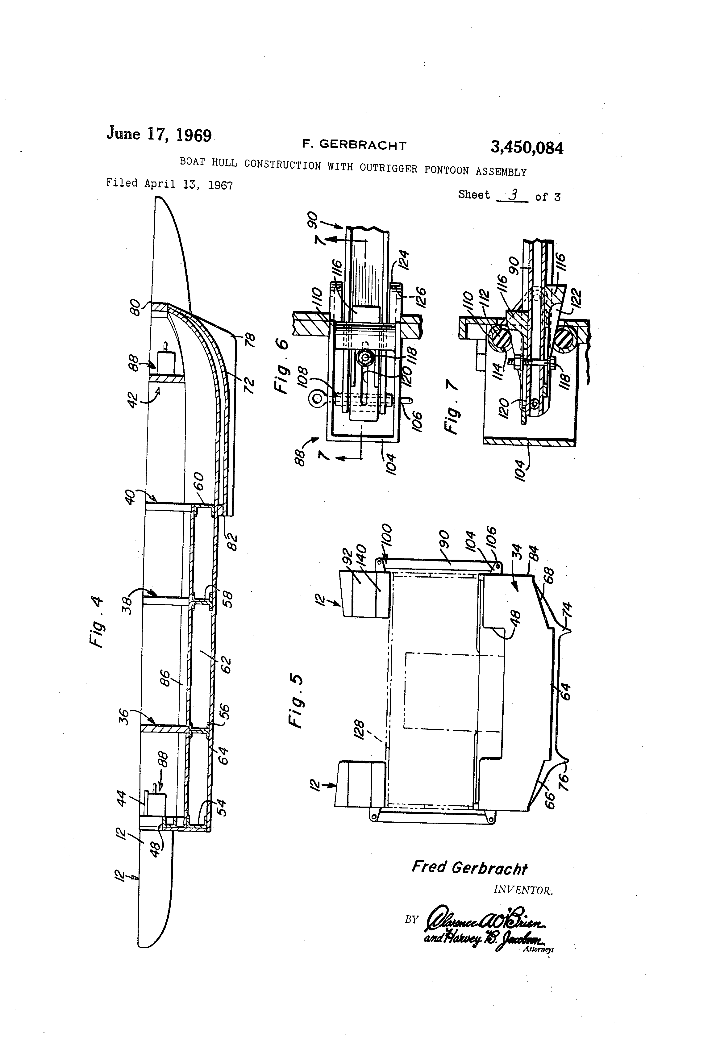 claimed as new is as foilows: 1. A boat hull comprising tnvo longitudinal trusses disposed in parallel spaced relationship with their minor axes vertical, and a plurality of transverse trusses whose minor,axes @are vertical being rigidly joined with the longitudinal trusses, and an impermeable covering fixed to the bow, stern, side and bottom surfaces of the trusses to define a water borne hull thus leaving the top of the hull open throughout its area, said longitudinal trusses having a depth substantioly equal to the depth of the hull throughout their length, at least two of the transverse trusses having a depth substantially equal to the depth of the hull throughout their length, said transverse trusses having the lower chords thereof bridged by a plurality of longitudinal stringers, said covering includin.- planar segments and a complexly curved bow section fixedly positioned bet,@Neen the 4forward ends of the longitudinal trusses and a step extending completely transversely of the hull of the juncture between the bow section and planar segments, said bow section including at least two parallel bows deeper than the planar segments with a concave area between the bows with the concavity diminishing in crosssection aft and terminating @at said step, said bows terminating in forward points disposed below the sur-face of the bow section with the forward edge of each bow extending vertically upwardly to rnerge with the leading edge of the bow section. 2. The structure as defined in claim I together with ,at least one outrigger pontoon disposed in space parallel relation t(> the water borne boat hull, a pair of spaced parallel struts interconnecting the pontoon and the boat hull, and means interconnecting the strut and the boat hull to enable adjustment of the struts in a vertical plane to position the pontoods in a desired position to stabilize the bull and to enable the struts to swing vertioally to an inoperative vertical position for orientation of the pontoons within the confines of the hull and vertically above the side portions thereof. 3. The structure as defined in claim 2 wherein said means connecting the struts to the hull includes resilient means to cushion flexing movement of the struts in relation to the hull. 4. A boat hull comprising two longitudinal trusses disposed in parallel spaced relationship with their minor axes vertical, and -a plurality of transverse trusses whose minor axes are vertical being rigidly joined with the longitudinal trusses, and an impermeable covering fixed to the bow, stern, side and bottom surfaces of the trasses to define a hull, at least one outrigger pontoon disposecl in spaced parallel relation to the boat hull, a pair of struts interconnecting the pontoon and the boat hiill, and means interconnecting the strut and the boat hull to enable adjustment of the struts in a vertical plane to position thi@ 8 pontoons in a desired position and to enable the struts to swing vertically to an inoperative vertical position for orientation of the pontoons within the confines of the hull and vertically above the side portions thereof, said means connecting the struts to the hull including resilient means to cushion flexing movement of the struts in relation to the hull, said means connecting the struts to the hull includin,@ wedge means for adjusting the position of the struts in relation to the hull. 10 5. The structure as defined in claim 4 wherein said str-uts being disposed approximately one-half beam from the hull with the front end of the outrigger being one-half beain -ahead of the hull and the stern end of the outrigger one-half beam - astern of the hull, said means connecting 15 the struts to the hull being disposed adjacent the transverse trusses. 6. The structure ;as defined in claim 4 wherein said outrigger includes an elongated buoyant body having a pointed forward end, the top -and inner surface of said 20 body being substanti@ally planar, the outer surface of said body converging forwardly toward the inner surface, the bottom surface of said body converging forwardly towards the top surface thereof, the rear end of said body being substantially planar and blunt, the forward portion of the 25 outer surface of the body being concave to produce an inward lateral force on the body when entering water to counteract the tendency of the front end of an outrigger to be forced laterally away from a boat hull when enterin.- water. 30 7. The structure as defined in claim 6,wherein the lower surface of the body curves upwardly to define the lower edge of the concave portion of the outer surface of the body, the top surface of said body aligned with the concave portion of the outer surface being wider than the 35 corresponding bottom surface, said bottom surfaceof the body being provided with an upwardly offset step in -adjacent but spaced relation to the blunt rear end thereof to define a planting surface, the bottom surface of the body curving upwardly from the strut to the blunt rear end to 40 provide a lift from an overtaking following sea. References Cited UNITED STATES PATENTS 45 2,392,834 1/1946 Clement ---------------- 9-6 2,855,885 10/1958 Thomas ------------ 114-43 3,051,115 8/1962 Canazzi ---- -------- 114-56 3,075,488 1/1963 NVolfe et al - -------- 114-66.5 3,148,652 9/1964 Canazzi ----------- 114-66.5 50 3,225,729 12/1965 Ewing ------------- 114-66.5 3,316,873 5/1967 Dismukes ----------- 114-61 FOREIGN PATENTS 550,193 12/1957 Canada. 1,025,312 1/1953 France. 55 529,629 11/1940 Great Britain . MILTON BUCHLER, Primary Examiner. RICHARD A. DORNON, Assis4ant Examiner. 60 U.S. Cl. X.R. 9-6; 114-5, 61