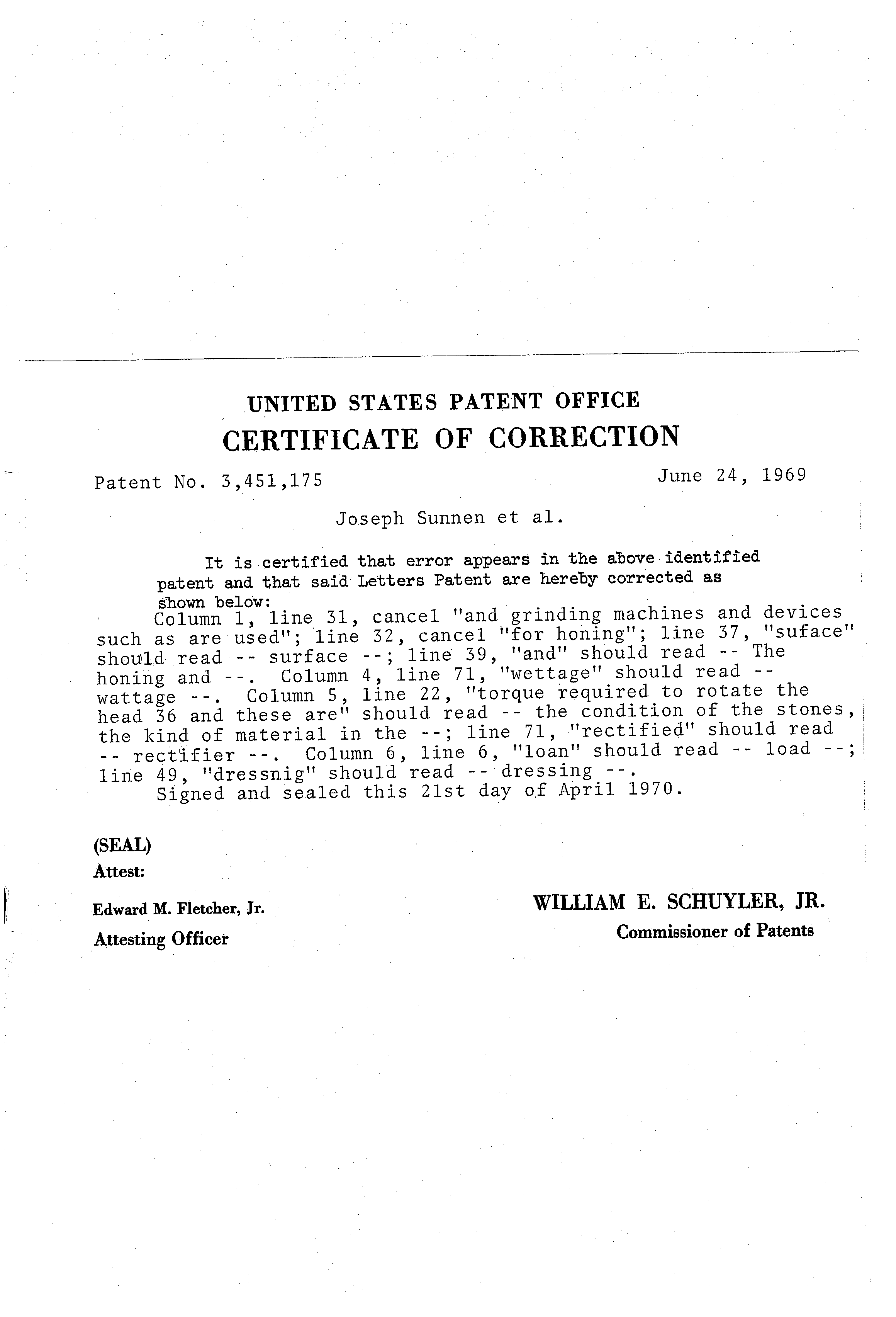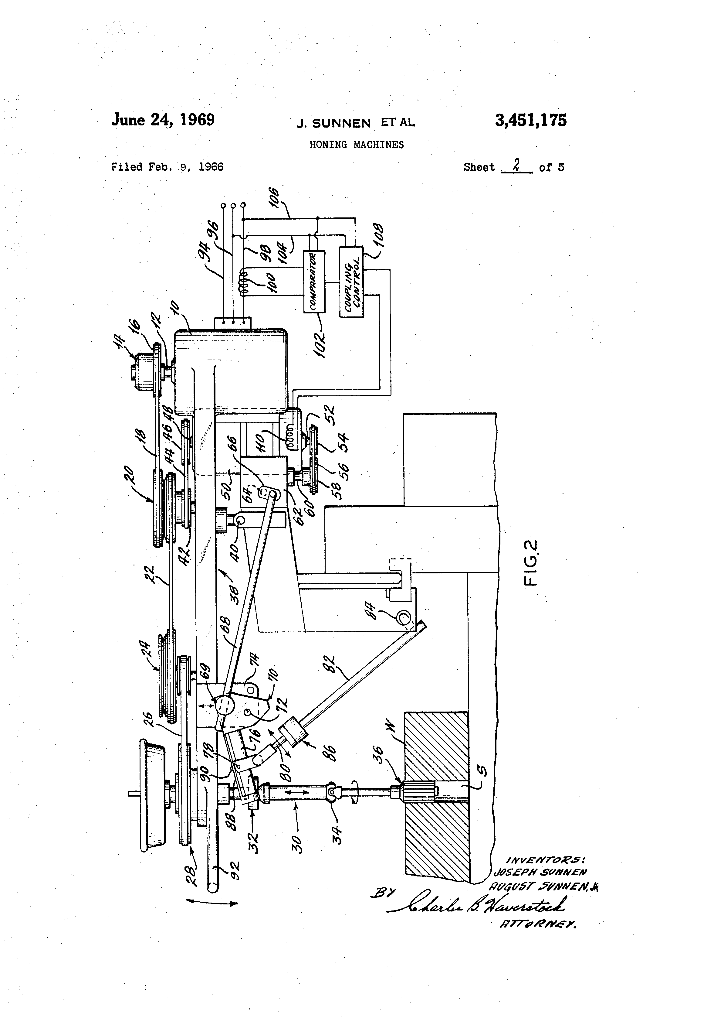0 3 @ 4 5 1 @ 1 7 5 Utlited States Patetit Office Patented June 24, 1969 2 cating motion between the work engaging elements and -the work to cause the work engaging elements to operate longer periods of time on areas of the work where greater torque is sensed. By this means the subject device is able to equalize the cbaracteristics of all portions of the work surface to make the work surface have the same diameter and other @desired characteristics. It is therefore a principal object of the present invention to provide means for producing more nearly perfectly cylindrical surfaces. Another object is to provide improved means for honing and finishing cylindrical surfaces. Another object is to provide means capable of continuously, accurately and instantaneously sensing the load or torque on a work member. Another object is to provide means to modify the motion of a work member relative to a work surface in response to the load on the - working member. Another object is to provide means to equalize the load on a working device in all operating positions thereof. Another @object is to provide means in a honing device for automatically eliminating irregularities in cylindricalsurfaces. Another object is to provide means which will enable even relatively unskilled persons to hone extremely accurate cylindrical surfaces. Another object is to provide relatively simple inexpensive means to improve the operating characteristics and accuracy of honing and like devices. These and -other objects and advantages @of the present invention will become apparent after considering the following detailed idescription of a preferred embodiment of the subject device in conjunction with the accompanying drawings, wherein: FIG. 1 is a block diagram of control means constructed according to the teachings -of the present invention; FIG. 2 is a side elevational view, partly diagrammatic, of a machine constructed according to the present invention; FIGS. 3a, 3b, and 3c are diagrammatic representations illustrating in exaggerated form three different operating conditions encountered by the subject machine; FIG. 4 is an enlarged fragmentary view showing a portion of the operating linkages included in the subject control means; FIG. 5 is a schematic wiring diagram of a typical circuit for the subject device; and F@1G. 6 is a view similar to F-IG. 1 but showing the Clutch means in the rotational instead of in the reciprocating drive of the work engaging means. Referring to the drawings more particularly by reference numbers, number 10 in FIGS. I and 2 refers to a drive motor which has a shaft 12. A clutch assembly 14 including a pulley 16 is mounted on the shaft 12. The pulley 16 is operatively connected by belt IS to another pulley assembly 20. Another belt 22 engages a different groove on the assembly 20 and extends therefrom for engagement with still another pulley assembly 24. In like manner, power is transmitted from the pulley assembly 24 by another belt 26 to a spindle assembly 28. The spindle assembly 28 is connected to the upper end of a rotating drive tube assembly 30 by means of universal connection means 32. The lower end of the tube assembly 30 is connected to another universal conne(;tion 34 which in tum is connected to a honing head assembly 36. Many different forms of honing heads can be used, including, for examples, the heads disclosed in Sunnen Patent No. 3,216,155 and in copending Sunnen application Ser. No. 349,892 now Patent No. 3,378,962, dated Apr. 23, 1968. Expansion of the work engaging elements on the honing head 36 is controlled by feed tip and other means in3,451,175 HONING MACHINES Joseph Sunnen, 400 S. Warson Road, Clayton, Mo. 63105, and August Sunnen, Jr., La,due, Mo.; said August Sunnen, Jr., assignor to said Joseph Sunnen 5 Filed Feb. 9, 1966, Ser. No. 526,223 Int. Cl. B24b 49100, 51100, 7100 U.S. Cf. 51-165 10 Claims 10 ABSTRACT OF THE DISCLOSURE An improvement for use on honing and other devices and machines which have work engaging members which travel rotationally and axially re-lative to a work surface such as a cylindrical work surface to bring the work @ur- 15 face to a desired condition including means to contmu<)usly sense and respond to the energy required to be applied to the work engaging member during operation thereof, and other means operatively connected to the energy sensitive means to vary the amountdf work done 20 on various parts of the work surface by the work engag'ng member in a way that varies with the energy sensedl in order to equalize the energy sensed at all places of the work engaging member on the work surface. 25 This invention relates genera:lly to improvements in machines of a type that employ work engaging members and more particularly to improvements in honing and 30 grindin.- machines and devices such as are used for honing and grinding machines and devices such as are used for honing, finishing and grinding cylindrical surfaces. Many devices are known and available for honing and grinding surfaces which operations are stock removal o9 5 processes in - which a bonded abrasive is rubbed over a sufa ce until the surface has obtained an accurate size and geometry and a smooth and consistent surface finish. and grinding is usually perf<)rmed by an instr-ument havin@ one or more abrasive elements or a combination of 40 abra sive elements and guide members. In the honing of cylin drical surfaces the abrasive elements engage the sufa ce being honed and are moved radially as well as axial ly to continuously bear against the surface and to hon e all portions of the surface substantially the same 45 amo unt. Various means have been develaped to control expa nsion of the abrasive elements during honing and the pres sure applied thereby against the work. In the past, how ever, difficulty has been experienced in correcting surfa ce irregularities such as diameter variations in order 50 to obtain cylindrical accuracy and straightness. The kno wn devices have also