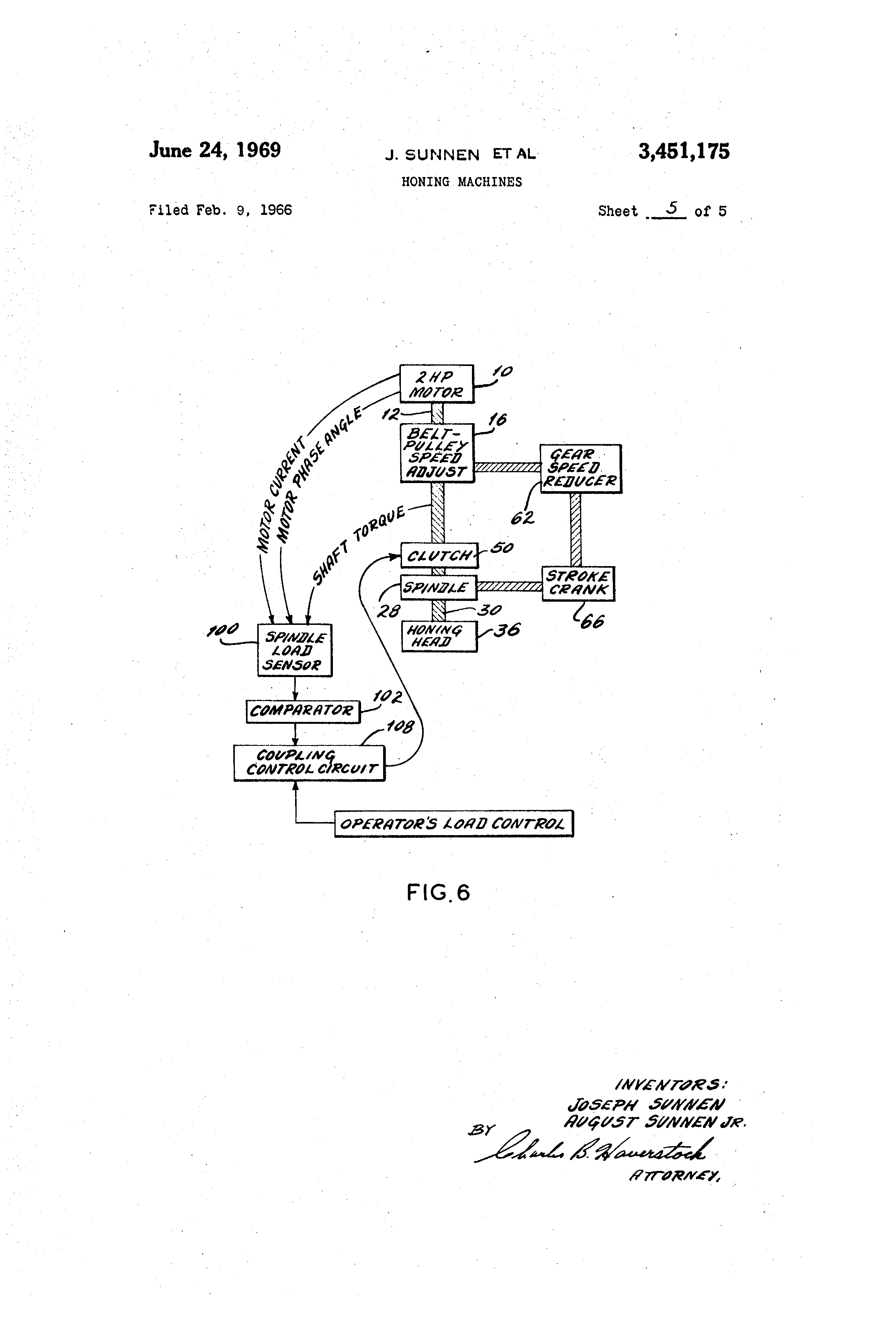 claimed is: 1. In a machine of a type havin.- a tool portion contactin- a cylindrical surface on a work piece comprising means for rotating the tool portion relative to the cylind-rical surface, other means simultaneously moving the tool portion parallel to the axis of the cylindrical surface, means sensitive to the instantaneous torque required to rotate the tool relative to the work piece, and means controlled by the torque sensing means to increase the amount of honing done by the tool on the cylindrical su.rfa,ce in areas of the cylindrical surface where increased torque is sensed. 2. In the macbine defined in claim I said means controlled by the torque sensitive means includes means for reducing the speed of movement of the tool portion parallel to the axis of the cylindrical surface in response to increases in torque sensed by the torque sensing means. 3. In the machine defined in claim 1 said means for movin.- the tOOl POTtion parallel to the axis of the cylindrical surface include means for imparting reciprocating motion to the tool portion relative to the cylindrical work piece surface, said means controlled by the torque sensing means including means to reduce the Tate of the reciprocating motion in response to increased torque. 4. In the machine defined in claim 1 said torque sensitive means include means for sensing the energy required to rotate the tool portion, and means responsive the-reto to vary the speed of rotation of the tool portion. 5. In the machine defined in claim 1 said means controlled by the torque sensitive means include an electroma.-netic coupling device having an idput, an output, and means responsive to the torque sensitive means for )iaryin,@ the electromagnetic cotiplin.- between the input and output. 6. In the machine defined in claim I said means cont-rolled by the torque sensitive means includes an eddy current coupling device havin.- a control winding operatively connected to the torque sensitive means. 7. In a machine of the type having a tool for contacting a cylindrical surface of a work piece includin- means for rotating said tool about the axis of said surface, 3)451)175 8 means for reCiPTOcatin.- said tool along said axis, theimprovement comprising means sensitive to the torque transmitted to said tool for said rotation thereof, and means operatively connecting said torque sensitive means to said reciprocating means including means to reduce the speed Of Teciprocation of said reciprocating means in response to the sensing of inereasin.@ torque by the torque sensitive means. 8. In a machine of the type having a tool for contact10 in.- a cylindrical surface of a work piece including motor means for rotating said tool about the axis of said surface, and other means for Teciprocating said tool along said axis, the improvement comprising means sensitive to the current drawn by the motor means, variable coupling means connected between said motor means to said reciprocating means, and means connecting said current sensitive means to said coupling means to cont-rol the spe.-d of reciprocation of the tool inversely relative to the current drawn by the motor means. 20 9. A honing machine comprising a honing tool for contacting a cylindrical surface of a work piece, motor means ope-ratively connected to the honing tool for rotating the honin.- tool relative to the cylindrical surface, other means for moving the honing tool parallel to the axis of 25 the -cylindrical surface during rotation thereof, said last named means including an electroma-netic coupling device having an input operatively connected to the motor means, and an output ope-ratively connected to the honing tool, and means for controlling the speed ratio between 30 the input and output of the coupling device including a coupling control winding, and means conne,eted to said control windin.- including means sensitive to the current drawn by the motor means. 10. A honing machine for honing cylindrical surfaces on work pieces comprising work engaging means includin,@ at least one honing element engageable with a cylindrical surface to be boned, motor means operatively connected to the work engaging means for rotating said work engaging means during a honing operation, means 40 movably supporting the work engaging means during a honing operation including means for producin.@ relative axial movement between the work engaging means and the cylindrical surface being honed, said movable support means including the motor means and means opera45 tively connecting the motor means and the support means, said last named means including an electromagnetic coupling device having an input operatively connected to the motor means and an output operatively connected to the movable support means, and means for varying the speed ratio between the input and output including means sensi50 tive to the torque required to rotate the work engaging means. References Cited UNITED STATES PATENTS 55 1,717,326 6/1929 Shaw et al - -------- 51-165 X 2 129,049 9/1938 DOTan --------------- 90-21 2:168,596 8/1939 Hall ---------------- 51-111 2,200,573 511940 Connor -------------- 51-34 60 3,030,740 4/1962 Greening ------------- 51-34 LESTER M. SWLNGLE, PI-imary Exanzitier. U.S. Cl. X.R. 65 51-34