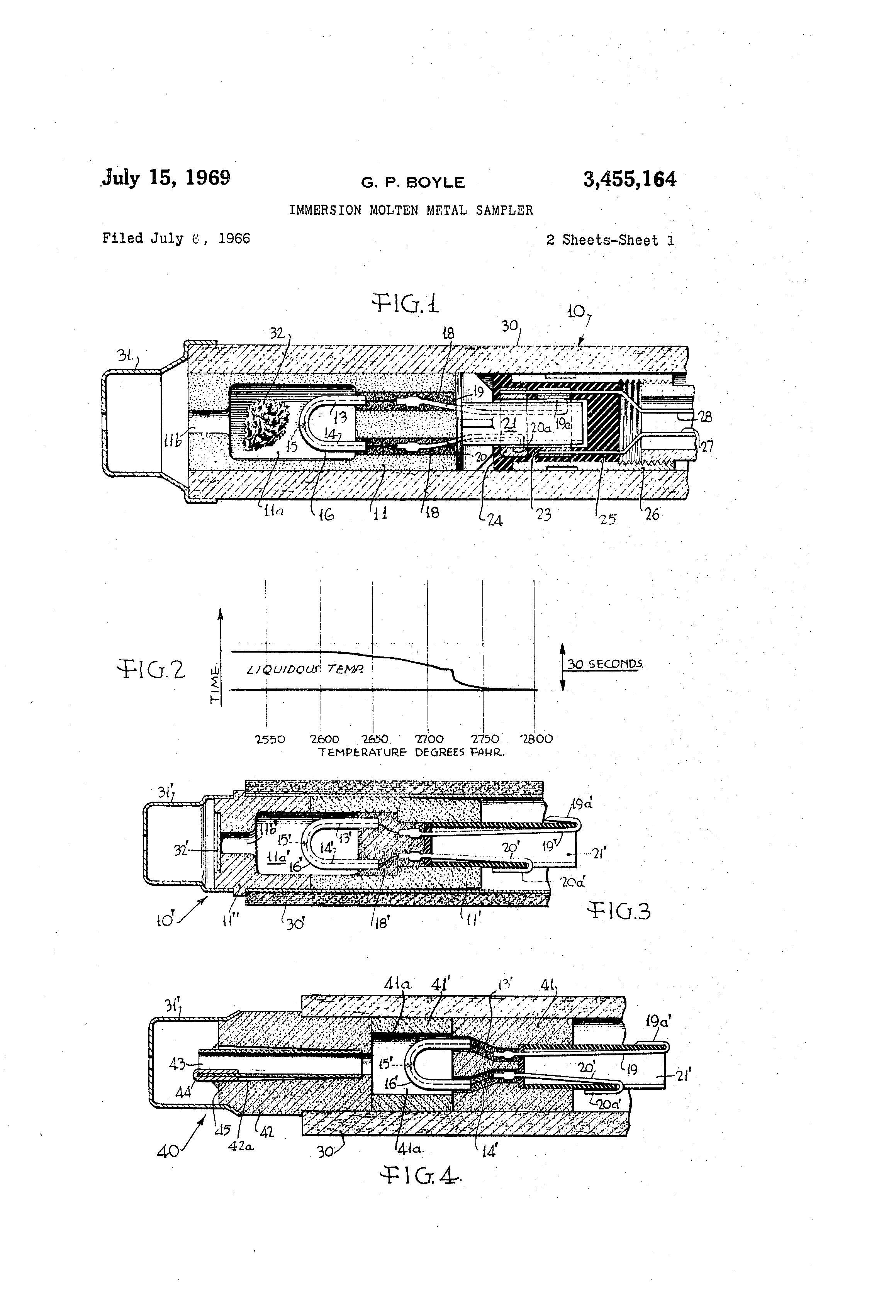 claimed is: 1. An immersion sampler device for taking a sample of a molten matetial at a subsurface level of a bath of molten material comprising: a body having a cavity therein closed at one end and open at the other end to TCecive tbQ sample of molten inatcrial, a flow passage connecting the open end of said cavity with the exterior of said body to permit entry of the sample into said cavity, said flow passage having a cross sectional area substantially smaller than the cross sectional area of said cavity, said body having means for permitting the escape of entrapped air from said cavity tipon entry of the sample, 10 said body having the characteristics of causing the sample to cool to a temperature below the temperature of the molten bath while said ;;body is immersed in the bath, temperature sensing means disposed within said cavity 15 and supported at the closed end of said cavity by said body, and means for connecting said temperature sensing means to a temperature measuring circuit. 2. An immersion sampler device according to claim I 20 including means associated with said cavity for contacting the sample of molten material entering said cavity to deoxidize the sample and thereby minimize voids in the sample within said cavity. 3. An immersion sampler device according to claim 2 25 wherein said deoxidizin- means is disposed within said cavity. 4. An immersion sampler device according to claim 2 wherein said deoxidizing means is disposed at the entrance to said cavity. 30 5. An immersion sampler device according to claim 1 including a fusible cap enclosing the open end of said cavity. 6. An immersion sampler device according to claim 5 wherein said fusible cap is constructed of a material 35 having deoxidizing properties when fused in said bath. 7. An immersion sampler device according to claim I wherein said body comprises a pair of sections having a parting plane extending along the longitudinal axis of said body. 40 8. An immersion sampler device according to claim I wherein said body comprises two sections having a parting plane substantially perpendicular to the longitudinai axis of said body and passing through said cavity. 9. An immersion sampler device according to claim 1 wherein said flow passage is provided with smooth surface 45 liner. 10. An immersion sampler device according to claim I including a second temperature sensing means supported by said body and projecting from said body, and means extending through said body and spaced from said cavity 50 for connecting said second temperature sensing means to a temperature measuring circuit. 11. The method of measuring the liquidus phase change temperature of a sample of molten metal comprising: 55 immersing an open ended cavity to a subsurface level in.a bath of molten metal, causing a sample of the molten metal to flow into the cavity through the open end thereof, deoxidizing the molten metal sample as it enters the 60 cavity and concurrently forcing the air within the cavity through the walls of the cavity thereby permitting the cavity to be filled with deoxidized molten metal, cooling the sample of molten metal within the cavity 65 to solidification temperatures beiow the temperature of the bath while the cavity is immersed therein, and initiating a measure of the liquidus phase change temperature of the sample while the cavity is beneath the surface of the bath. 70 12. A method according to claim 11 including the step of concurrently measuring the temperature of the molten metal bath outside of the cavity. 13. An immersion device according to claim I wherein said body is constructed of a material wliich is gas 75 permeable, 9 14. An immersion sampler device for takin@- a sample of molten material at a subsurface level of a molten bath comprising a body having an open ended cavity therein to receive a sample of molten material, said body beinconstructed of porous material permeable to gas, and a fusible cap enclosin- said open end of said cavity. 15. An immersion sampler device according to claim 14 including temperature sensing means disposed within said cavity and supported by said body. 16. An immer ion sampler device according to claim 15 includin.- a second temperature sensin.a means supported by said body and projectin.- therefrom at said open end of said cavity and within said fusible cap. 17. An immersion sampler device for measuring the temperature of P. sample of molten material at a subsurface level of a molten bath as said sample cools through its phase change comprising: an immersible body having walls defining a cavity to receive and retain a molten sample of material when immersed in a molten bath, said walls providing a heat sink to cool said sample in a manner permitting recording the changing temperature of the cooling sample to produce a ctirve showing a phase change temperature, passa-e through one of said walls for entry of said molten sample into said cavity, said passage havin.a cross sectional area smaller than the cross sectional area of said cavity to prevent loss of said molten sample from said cavity throu-h said passage during cooling thereof, fusible closure for said passage permitting entry of said molten sample into said cavity u-pon destruction of said fusible closure, temperature sensin- means carried by said body and extendin.- to within said cavity for sensing the changing temperature of the molten material within said cavity during coolin.- of said molten sample while said body is immersed in said molten bath, and means to connect said temperature sensing means to the measuring circuit of a temperature recorder. 18. An immersion sampler device according to claim 17 including a second temperature sensin.- means supported by said body and projectin.- outwardly therefrom. 19. An immersion sampler device according to claim 18 3)455)164 @ 10 including a fusible cap enclosing said second temperature sensing means. 20. An immersion sampler device according to claim 18 wherein said fusible