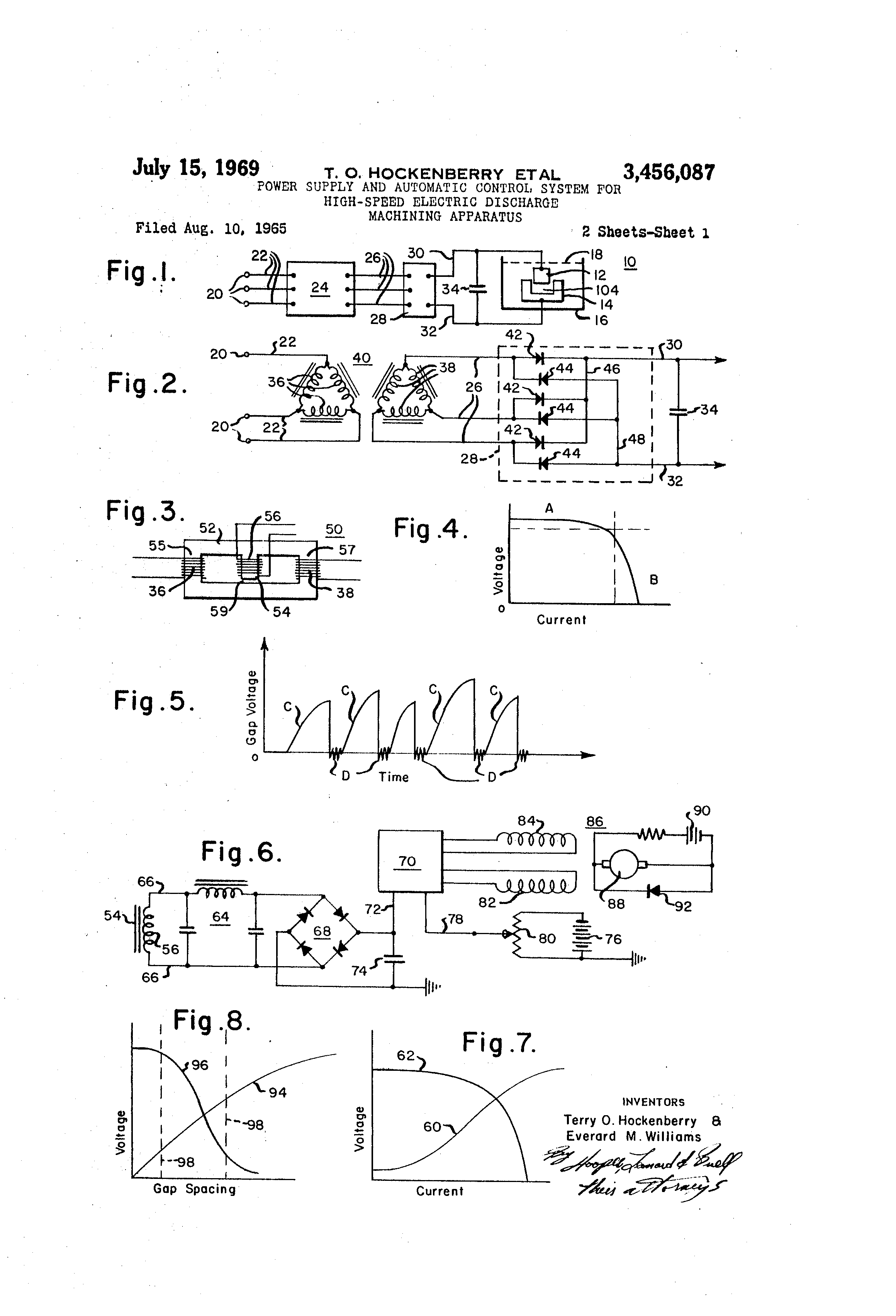 claim: 1. In electric discharge machining apparatus, energy storage means including a capacitor, an electrode tool connected to one terminal thereof and adapted to approach a workpiece connected to the other terminal of the capacitor and forming therewith a discharge circuit for the capacitor, means for mounting the electrode tool fc)r movement toward and away from the workpiece, means for interposin.- a dielectric fluid between the workpiece and the electrode tool, said capacitor being effective when charged to cause an electric discharge through the dielectric fluid between said electrode TODI and workpiece when the gap separatifig them has been reduced to a predetermined value, a rectifying circuit coupled across said capacitor and forrning a charging circuit therefor, transformer means connected through the input of said rectifying circuit, said transformer means having core structure of the leaka,-e leg type, circuit means for connecting said transformer means to a source of fluctuating potential, positioning mechanism mechanically coupled tO said electrode tool for moving said tool toward and away from said workpiece, said mechanism including a reversible drive motor therefor, a control winding on the leakage leg of said transformer core structure, circuit means for connecting said last-mentioned winding to a source of constant potential for producing an output control voltage, and additional circuit means sensitive to the polarity of said output voltage fDr energizing said drive motor to induce corresponding forward and reverse rotations thereof. 2. In electric discharge machining apparatus, energy storage means including a capacitor, an electrode tool connected to one terminal thereof and adapted to approach a workpiece co-nnected to the other terminal of the capacitor and forming therewith a discharge circuit for the capacitor, means for mounting the electrode tool for movement toward and away from the workpiece, ineans forinterposing a dielectric fluid between the workpiece and the electrode tool, said capacitor being effective when charged to cause an electric dischar@e through the dielectric fluid between said electrode tool and workpiece when the gap separating them has been reduced to a predetermined value, a rectifying circuit coupled across said capacitor and -forming a charging circuit therefor, transformer means connected to the input of said rectifying circuit, said transforming means having core structure of the leakage leg type, circuit means for connecting said transformer means to a source of fluctuating potential, positioning mechanism coupled to said electrode tool for moving said tool toward and away from said workpiece, said mechanism including a reversible drive motor therefor, a control winding on the leakage leg of said transformer core structure, said lastmentioned winding being connected in parallel with a low pass filter network to the input of a rectifying circuit, the output of said rectifying circuit being connected in series with a voltage amplifier and in bucking relation to an adjustable source of standard potential, and ener.-izing means fbr said drive motor sensitive to the polarity of the output of said voltage amplifier for producing corresponding forward and reverse rotations of said drive motor. 3. In electric discharge machining apparatus, energy storage capacitance means, an electrode tool connected to one ter@minal thereof and adapted to approach a work10 piece connected to the other terminal of the capacitance means and forming therewith a discharge circuit for the capacitance means, means for mounting the electrode tool for movement toward and away from the workpiece, means for interposing a dielectric fluid between the workpiece and the electrode tool, said capacitance means being effective when charged to cause an electric discharge through the dielectric fluid between said electrode tool and workpiece when the gap separating them has been 10 reduced to a predetermined value, a first rectifying circuit coupled across said capacitaiice means and forming a charging circuit therefor, transformer means connected to the input of said first rectifying circuit, said transforming means having core structure of the leakage leg 15 type, primary and secondary winding means mounted thereon in spaced relation to said leakage leg, circuit means for connecting said primary transformer winding means to a course of fluctuatin@ potential, positioning mechanism coupled to said electrode tool for moving 20 said tool toward and away from said workpiece, said mechanism including a reversible drive motor therefor, a control winding on the leakage leg of said transformer core structure, said last-mentioned winding being connected in parallel with a low pass filter network to the 25 input of a second rectifying circuit, the output of said second rectifying circuit being connected in series with a voltage amplifier and in bucking relation to a source of adjustable standard potential, energizing means for said drive motor sensitive to the polarity of the output 30 of said voltage amplifier for producing corresponding forward and reverse rotations of said motor, said capacitance means including a bank of electrically paralleled capacitors connected respectively in series with contacts of capacitor bank switching means across th-e output ter35 minals of said first rectifying circuit, and said secondary transformer winding means including at least one tapped secondary winding connected in series with a tap switch to the input of said first rectifying circuit. 4. In electric discharge machining apparatus, energy 40 storage means including a capacitor, an electrode tool connected to one terminal thereof and adapted to approach a workpiece connected to the other terminal of the capacitor and forming therewith a discharge circuit for the capacitor, means for -mountin,@ the electrode tool 45 for movement toward and away from the workpiece, means for interposing a dielect