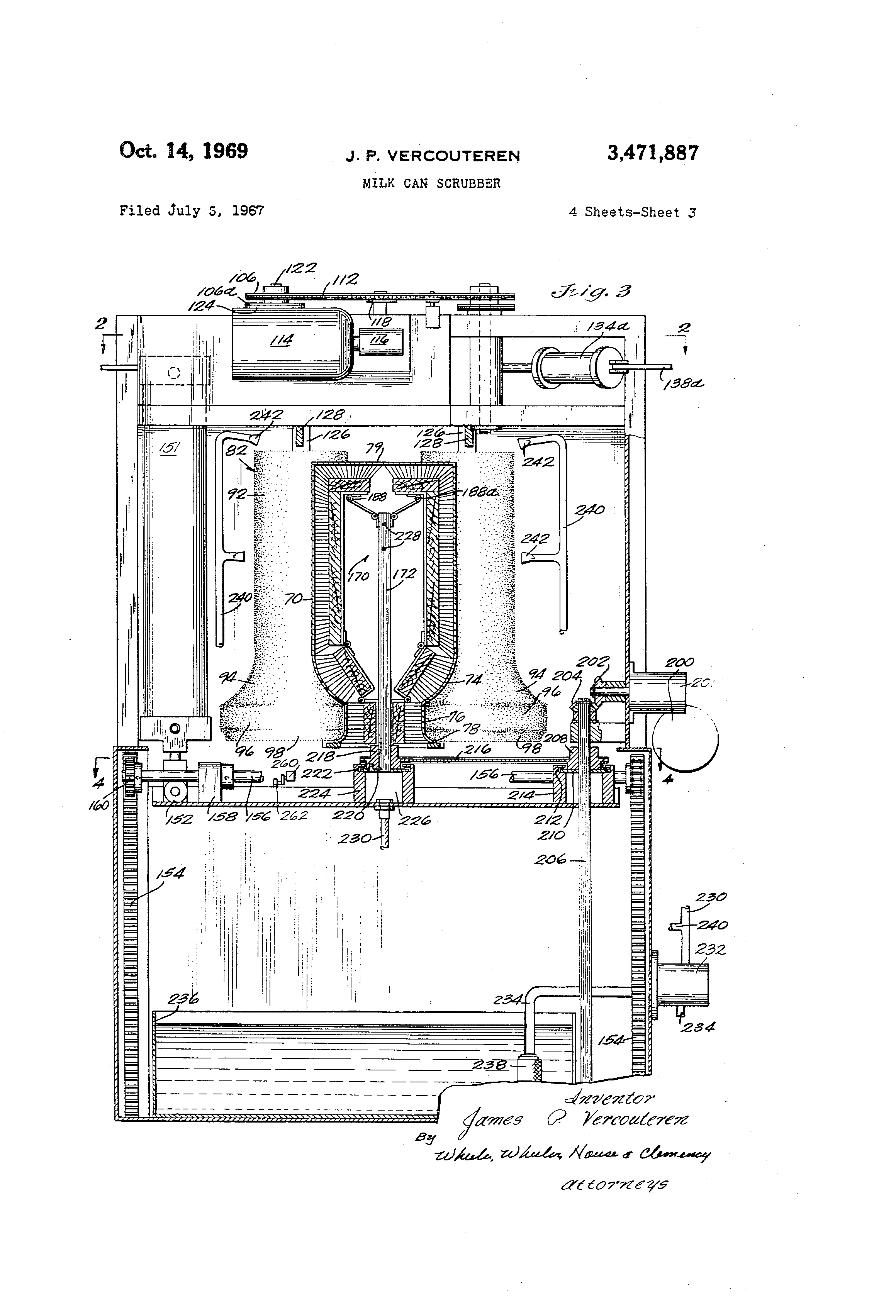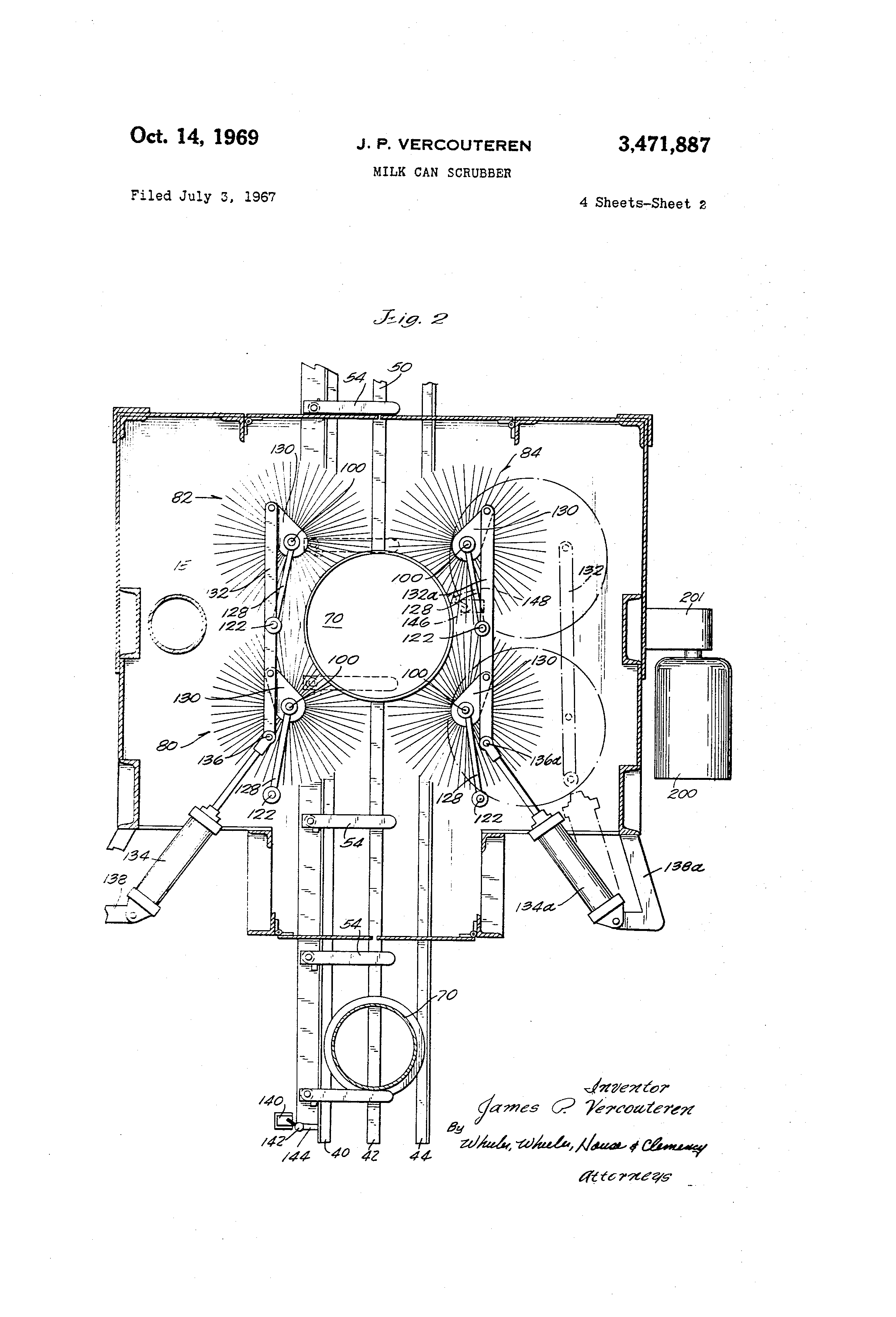 Util'ted States Patetit Office 394719887 3,471,887 MILK CAN SCRUBBER Jar.-.es P. VercoLfieren, 2314 Erie Ave., Sheboy,-@-P, Wis. 53031 F-',ed ly 3, 1967, Ser. No. 651,037 5 I,t. B67c 1108; A47115/00 U.S. Cl. 15 72 10 Cl-,Iims AP,ST-QACT OF THE DISCLOSURE 10 An auto--@nated can scrubbin.- device for milk cans thr-au-h which cans are advanced step by step on a track with each can bein@ simtiltaneoiisly scrubbed outside and inside while being sprayed with a cleanir@@ sol@,ition at otic station along the track. 15 Backgrc,,ind of the invention In the dairy industry milk can sanitation is a scriOLis 20 problem b,-catisc of the speed with which milk is de,-raded when exposed to variotis or.@anisms and the dii',rictilty with which all traces of milk are r@-m-oved frc@.In a milk container in order to prevent the @rowth of the organisms. inere slerilization of a milk can is not suffi- 25 c@ent unless the rpilk residues are compl,-tely removed, alon.- with any traces of rust, in order to provide a hostile environment for micro-or@anisms. So far as I am aware there is no milk can scrubber which has proven satishin@ 3 0 factory for comirercial ,ise which in addition to was the can thorotighly scrubs it with a mechanical brus hin @ aclion cover:n,- the entir-- outside wall, inside wall an@ insid-- botto' m, and which performs this action automatically with a hi-h rate of production. I have perfected s,,ich a device' a-,id in actual tests it bas s@ibs.ati35 tially reduced the rejection of mi, 'k cans as ur@fl-L dLirin2 inspections by the health authorities. Both milk s@ LOne and rust are ren-@oved from the cans by my device, and the cans remain cleaner than cans ha, -idled by pri'or methods even wh-,n they are brou,-ht back to tlae dairy 40 filled at a lat-,r date, due to th@@ thorou,@hiess with which con@aL-iinatio.-i is removed. My devic-. is preferably us-.ri as an addi t,on to a corventional can washin, devic-, and may share a common conveyor with the cE@n washer so that every can com:in,@ to t@ic dairy is ser-Libbed beirre it 45 is washed. Summary of the invention My d@-vice incltides a conventional milk can conveyo@v,,,h,'ch advances cans in an internaittent mot"@on by means of a forwardly movin, can advancing slrolce and a rear- '50 wardly movin,@ stro.-e durin,@ which the cans are stat;onary, the cans passin.- along a rail or rails in an inver',ed pos@ 'tion. A pair of switches are tised to control the timin@ of @he d-,vice, one said switch being aclivated by th'-, conveyor as it reaches a rearward pos;tion in its travel 55 and the o.'her said switch b@-in- at the can scrubbipg station and activated by a can as it reaches the s@,vitch. Upon arrival of a can at th.- can scrubbin.- station a g.- oup oi exterior scrlibbin.- brushes are swun.- ipto can scrlibb@n.- position and are roated at varyin.- speeds while an 60 interior can scrL,,bbin.- brush rises throu.-h the neck of the can apd exuands to scrlib all surfaces of th.- interior in a direction cot,.,@iter to the rollation of the ext-@rior scrlibbin.- brushes. Sprays of cleanin.- solulion are directed at the exterior and interior of the can dliring the scrlibbin,@ operation. Upon arrival of the conveyor at the rearward position ready to advance another can, the exlerior scrabbin.- brushes are iroved to a position free of the conveyor tract and the interior scrub bi-ush is retracted downwardly and collapsed to pass through the neck of the can to a 70 positic>n below th-- conveyor to permit anotlier can to advance to the scrubbin@ station. Patented Oct. 14, 1969 2 Drawin,-s FIG. 1 is a top view of the can scrtibbing device of my invention. FIG. 2 is a cross-sectional view on line 2-2 of FIG. 3, showing th.- linkages which move the outer brushes to and from the scrubbinposition, the scrubbing position bein- shown in full line@s and the retracted position being shown in broken lines at the ri.-ht side of the figure. FIG. 3 is a cross-sectional view on line 3-3 of FIG. 1, showing a can at the scrubbin.- station. FIG. 4 is a fra.-mentary cross-sectional view on line 4-4 of FIG. 3, showin.- the mechanism of the drivin.and elevatin.- carria.-e for the interior scrub brush, but showin.- the carriage in a lower position than that illustrated in FIG. 3. FIG. 5 is a view of the interior scrub brush which is enlay.-ed with respect to the showin- in FIG. 3 and which shows th-@ position of th-. components of the brush when the carria,-e which drives and elevates it is in its lowered position. FIG. 6 is a cross-sectional view on lines 6-6 of FIG. 5 showin@ details of the sl,ructure of the interior scrub brush. ' FIG. 7 is a view on 1,.ne 7-7 of FIG. 5 showing further details of the structiire of the interior scrub brlish. Description As shown in FIG. 1, the milk can scrubber of my invention is enclos--d within a housin@ generally designated as 10. Side frame members 12 and 14, heavy corner members 16 and 18 in the front corn@-rs of housin.- 10 and li-ht rearward corner members 20 and 22 in the rear of the frame support the unit vertically. A center beam 24 and a front beam 26 support major componen's of the scrubbing system f.-om the side and corner frame members. The track for the milk cans consists of a n@,imber of stationary rails 40, 42, and 44 upon which the mouth of the can r--sls as it passes throu,@h the machine. Central rail 42 ends at a latera.1 rail section 46 which underlies t@he traili-ii- ed@e ol. the can mouth when the can is at the scrubbin.- station. A second lateral rail 48 supports the leading ed-c of the can mouth at the scrubbinstation, hile the side margins of the can mouth are slipported w Is 40 and 4,4, the four rails 40, 44, 46 and 48 thus by rai deqnlp,- the scrl-,bbing station and in particular de-fin-'@r@.- a support for the can havin.- a-ii open center for the passa,-e of the brushes which scrub the interior of th@- can. Rail 50 continues th,- cen'Ler rail rearwardly from rail 48. The conveyor -further consists of a longittidinal