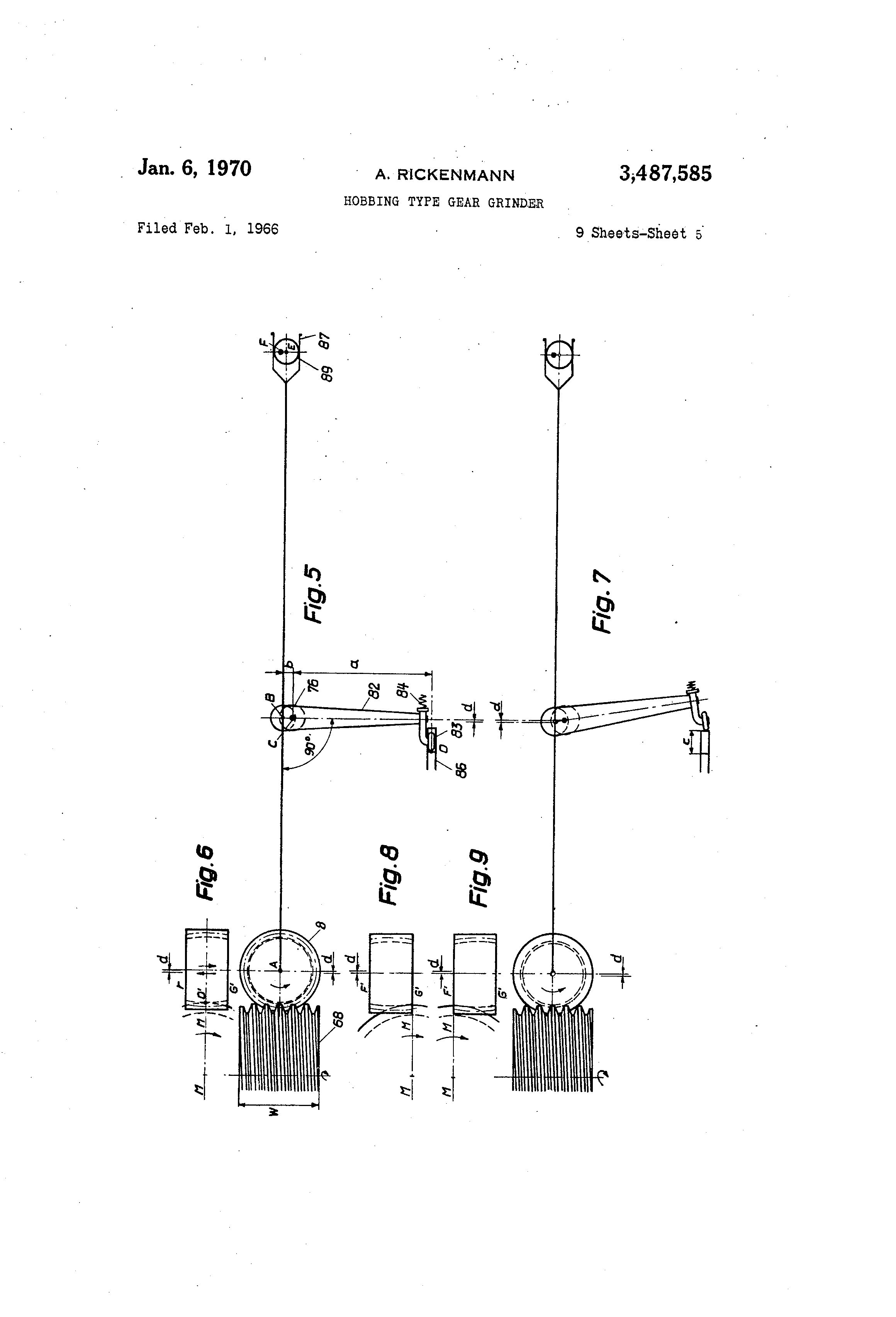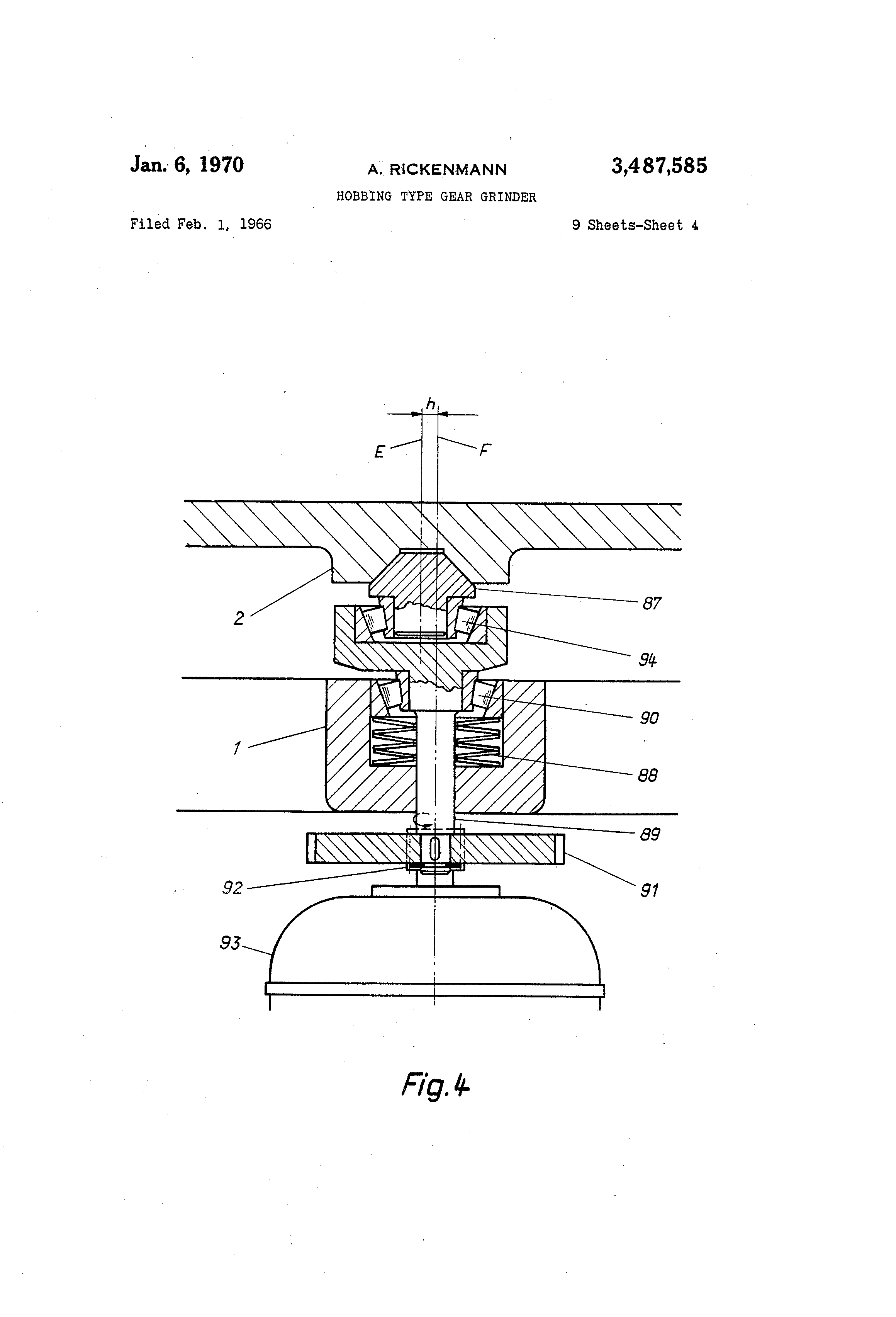 claim: 1. A hobbing type gear grinder, comprising a machine bed, first mounting means on said machine bed for mounting . a hob for rotation about an axis, second mounting means on said bed for mounting a workpiece for rotatio@ about another axis, said first and second motinting means being mounted on said bed for relative movement therebetween, said second nounting means comprising a saddle movable, on said machine bed, a workpiece carria.ae slidably m I ounted on said saddle and supporting the workpiece for rotation about said other axis, drive mea-.is for driving said workpiece carriage relative to said saddle, a templet, means on sa:id workpiece carriage for securing saf@ templet thereto, sensing means being located in 8aid saddle for following the profile of the templet, when said workpiec-. carriage is driven, to produce a pattern of movement, and reaction means on said second molinting means for translating said pattem of movement in@o an additional relative movement between said first and second mounting means for determining the longitudinal profile of teeth produced on said workpiece. 3)487)585 10 2. A hobbing type gear grinder as claimed in claim 1, in which said reaction means is located in said saddle and is connected to said sensing means for imparting positional changes to said saddle relative to said bed in respons@, to the motion of said sensing means to change the distance between the axes of rotation of the hob and the workpiece whereby to determine the longitudinal profile of teeth produced on the workpiece. 3. A hobbing type gear grinder as claimed in claim 2, 10 in which said sensing means comprises a roller, and said reaction means includes a shaft rotatably mounted in said saddle and a pin mounting said shaft eccentrically in said machine bed, said shaft being acted upon by said roller in a sense to rotate said shaft. 15 4. A hobbing type gear grinder as claimed in claim 2, in which said reaction means comprises a shaft rotatably mounted in said saddle, a pin rigidly connected to said shaft eccentrically of the axis of said shaft, such pin being rotatably engaged in a bore in said machine bed, and a 20 lever rigidly attached to said shaft to extend transversely of said shaft, and said sensing means comprises a roller motinted on said lever for sensing the profile of the templet. References Cited 25 UN ITED ST ATES PATENTS 2,59 7,648 5/19 52 Luc as -------------- 51- 100 2,78 6,309 3/19 57 Ric kenmann. 2,83 9,875 6/19 58 Ric kenmann. 2,89 8,707 8/19 59 Ric kenmann. 30 3,07 1,897 1/19 63 Pick ener. 3,25 1,157 5/19 66 Clar k -------------- 51- 100 ROBERT C. RIORDON, Primary Examiner 35 DONALD G. KELLY, Assistant Examiner U.S. Cl. X.R. 51-100