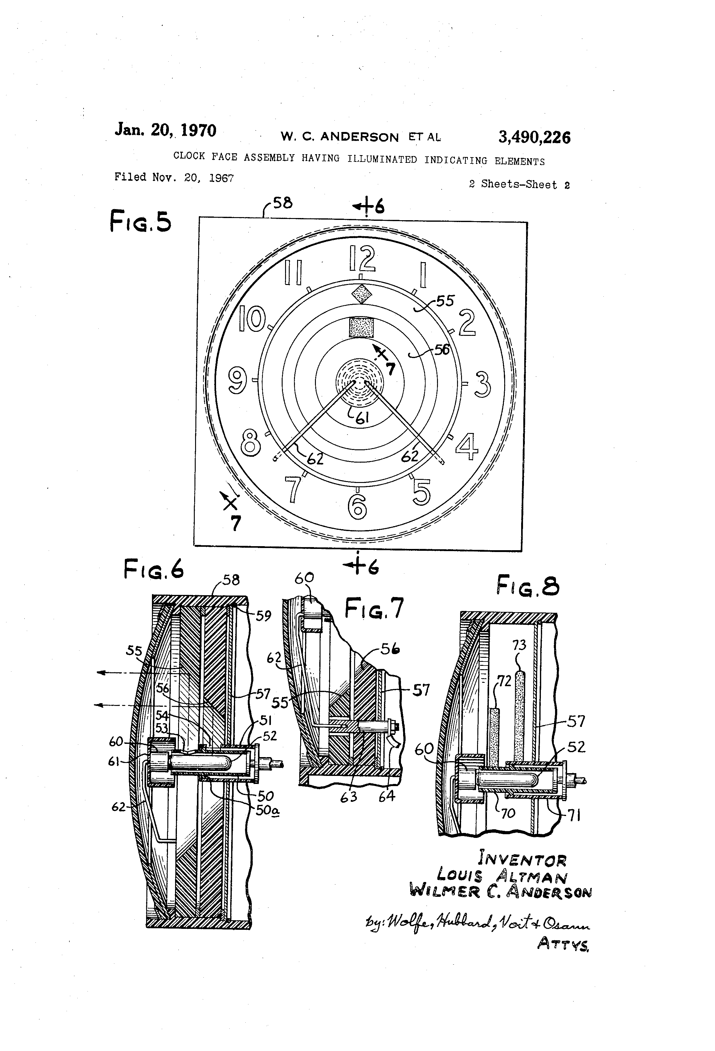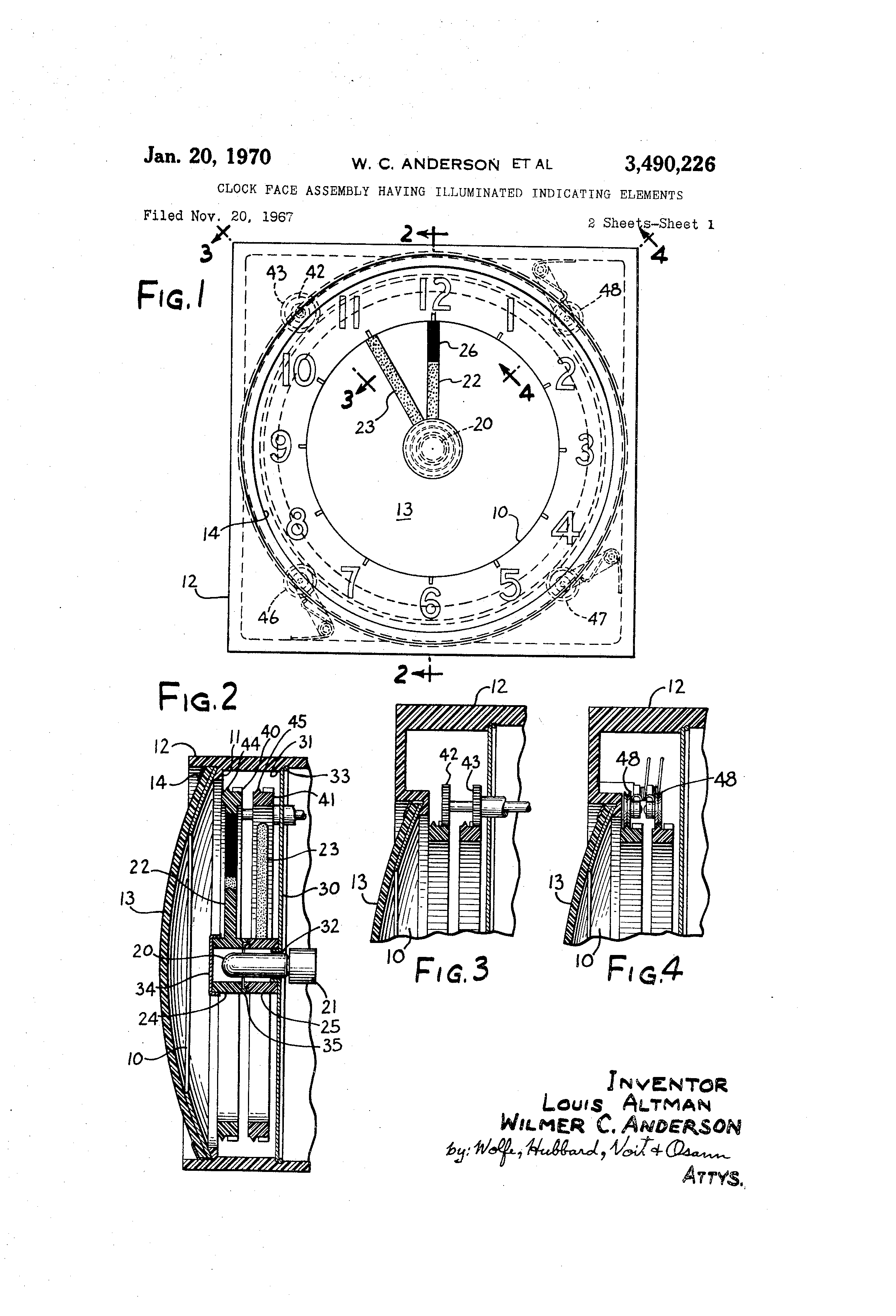 claim: 1. A clock face assembly comprising the combination of a dial plate having time indicia thereon, a stationary light source positioned at the center of said dial plate, a pair of illuminatable clock hands made of a light transmitting material and mounted for angular movement around said light source, the radially inner ends of said clock hands being joined with a pair of sleeves which are mounted for rotation around said stationaiy light 31490,226 6 source, said sleeves being adapted to continuously transmit light directly from said source to the inner ends of said hands and radially through said hands for illuminating the hands, and means operatively connected to the radially outer ends of said hands for driving said clock hands at different controlled angular velocities while continuously maintaining a light transmission path between said radially inner ends of said hands and said light source. 10 2. In a clock, a clock face assembly comprising the combination of a centrally located stationary light source, a pair of ring gears disposed concentrically around said light source and spaced radially therefrom, driving means operatively connected to said ring gears for rotating a 15 first one of the ring gears at the speed of an hour hand and rotating the second ring gear at the speed of a minute hand, and @ a pair of radially extending clock hands made of a light transmitting material, said clock hand,s being secured @tt their outer ends to said ring gears and 20 extending radially inwardly toward said light source so that the light @from said source is transmitted radiall@ through said clock hands to illuminate the same regardless of the circumferential position of the hands relative to said source or to each other. 25 3. A clock face assembly comprising the combination of a clock dial having time indicia thereon, a stationary light source lo.cated at the center of the dial, a pair of annular light ieflecting surfaces surrounding said stationary light source, said surfaces being radially and axially 30 offset from each other, a pair of time indicating elements mounted for angular movement around said light source and adapted to direct light beams onto said reflecting surfaces, and @means for driving said light transmitting elements at different controlled angular velocities corre'-5 sponding to the velocities of hour and minute hands so as to move the light beams around said reflecting surfaces at said velocities to indicate the time. 4. A clock face assembly as defined in claim 3 wherein said time indicating elements comprise a pair of sleeves 40 surrounding said light source and forming light transmitting openings for directing said light beams onto said reffecting surf@ces. References Cited UNITED STATES PATENTS 45 2,009,209 3/1932 Scantlebury ------------ 58-50 2,290,278 7/1942 Failla ---------------- 58-50 50 FO REIGN PATENTS 160, 209 7/19 54 Australia. 627, 246 2/19 36 Germany. 732, 788 9/19 32 France. 55 RICHARD B. WILKINSON, Primary Examiner E. C. SIMMONS, Assistant Examiner U.S. Cl. X.R. 58-23; 240-6.43