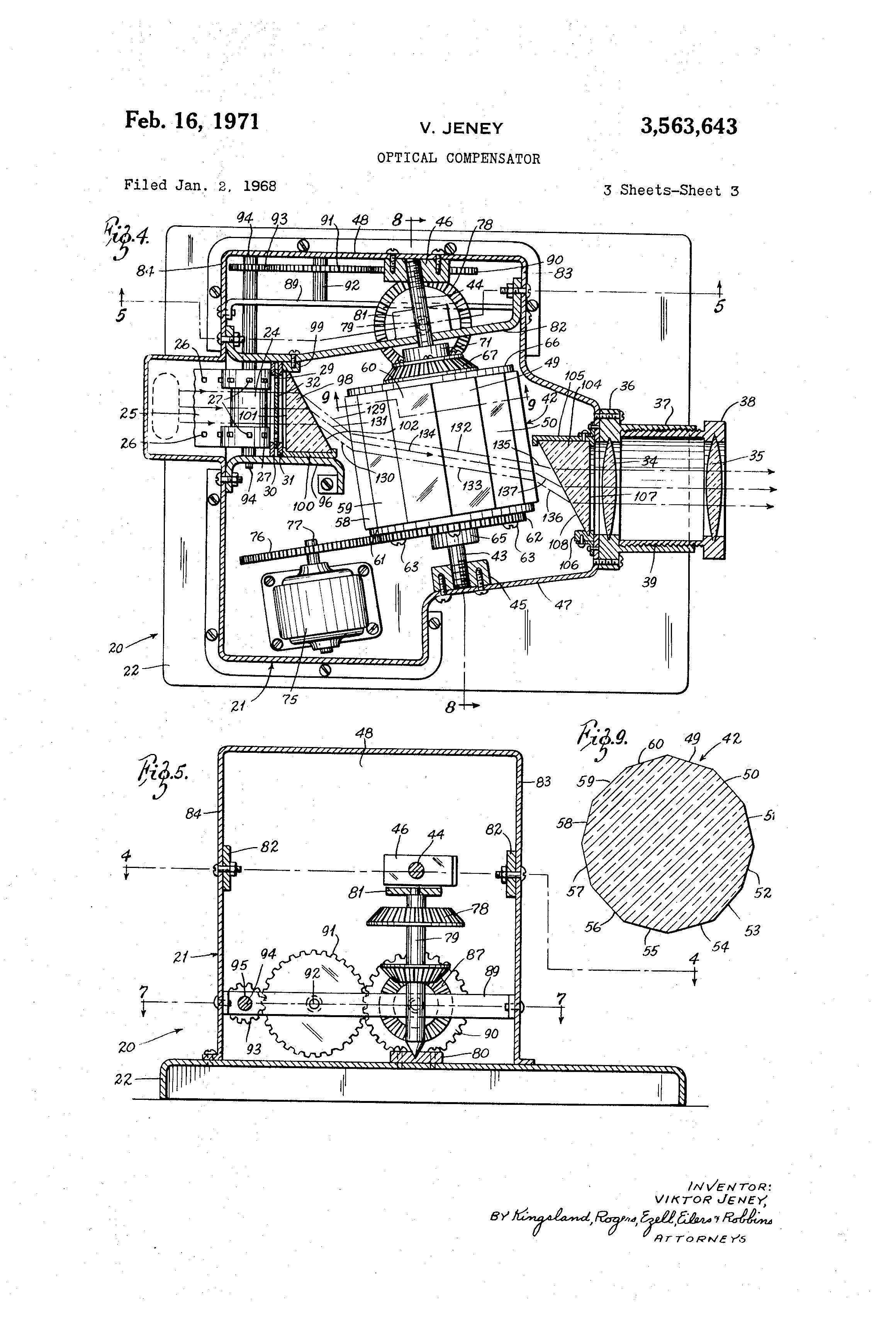 claimed is: 1. An optical compensator comprising a housing, a prism rotatably supported within the housing, the prism 8 having diametrically opposite mutually parallel faces of equal height as measured transverse to the prism axis, a movie film, means to m(>ve the movie film through the housing, the movie film having successive frames each having a height equal to the height of the prism faces, a lens assembly in a side of the housing, the prism being positioned in the path of light rays between the film and the lens assembly, the prism being mounted at an angle to cause the light rays between the film and the prism to 10 intersect the prism faces at an acute angle to the longitudinal axis of the prism. 2. The optical compensator of claim I including identical prisms between the rotatable prism and the film and between the iotatable prism and the lens assembly, the 15 identical prisms having angular faces to direct light rays at an acute angle to the longitudinal axis of the rotatable prism. 3. The optical compensator of claim 2 wherein the longitudinal axis of the rotatable prism is at an acute 20 angle to the plane of that portion of the film which light rays intersect. 4. The optical compensator of claim I wherein the rotatable prism is of equilateral cross-section and has an even number of faces. 25 5. The optical compensator of claim 4 including single drive means f6r rotating the prism and moving the film. 6. The optical compensator of claim 5 including a gear train for causing the linear speed of the faces of the rotatable prism to be equal to the linear speed of the film. 3o 7. The optical compensator of claim I wherein the rotatable prism has a refractive index between 1.49 and 1.65. 8. The optical compensator of claim 2 wherein the rotatable prism and the identical prisms have refractive 35 indices between 1.49 and 1.65. 9. The optical compensator of claiin I wherein the angle of incidence of each of the light rays to the faces of the rotat'a- le prism relative to its longitudinal axis is such that the upper and lowermost incident rays are 40 each refracted to intersect with the opposite corner of the rotatable prism. 10. The optical compensator of claim 9 wherein the rotatable prism is of equilateral cross-section and has an even number of faces, and ineltiding means for rotating 45 the rotatable Drism and moving the film so that the linear speed of the laces of the rotatable prism is equal to the linear speed 6f the film, and so that each of the corners of the rotatable prism are successively aligned with a space between two adjacent picture frames positioned in .50 the path of the light rays as the film moves through the film window. 11. An optical compensator comprising a housing, a multi-faced prism rotatably supported within the housing, means to rotate the prism, a movie film having picture -55 sections or fiames equal in height to the height of the prism faces, means to move the movie film through the housing at a speed equal to the surface speed of the rotating prism, and means inclining the longitudinal axis of the prism to the path of incident light rays to increase the 60 effective diameter of the prism measured in the path of the refracted light rays passing through the prism in correspondence to the refractive index of the prism. References Cited 65 UNITED STATES PATENTS 1,840,799 1/1932 Waddell ----------- 352-113 2,298,045 10/1942 Ehrenhaft ---------- 352-119 2,972,280 2/1961 Kudar ------------ 178-7.6X 70 JOHN M. HORAN, Primary Examiner M. H. HAYES, Assistant Examiner U.S. Cl. X.R. 75 350-6, 285