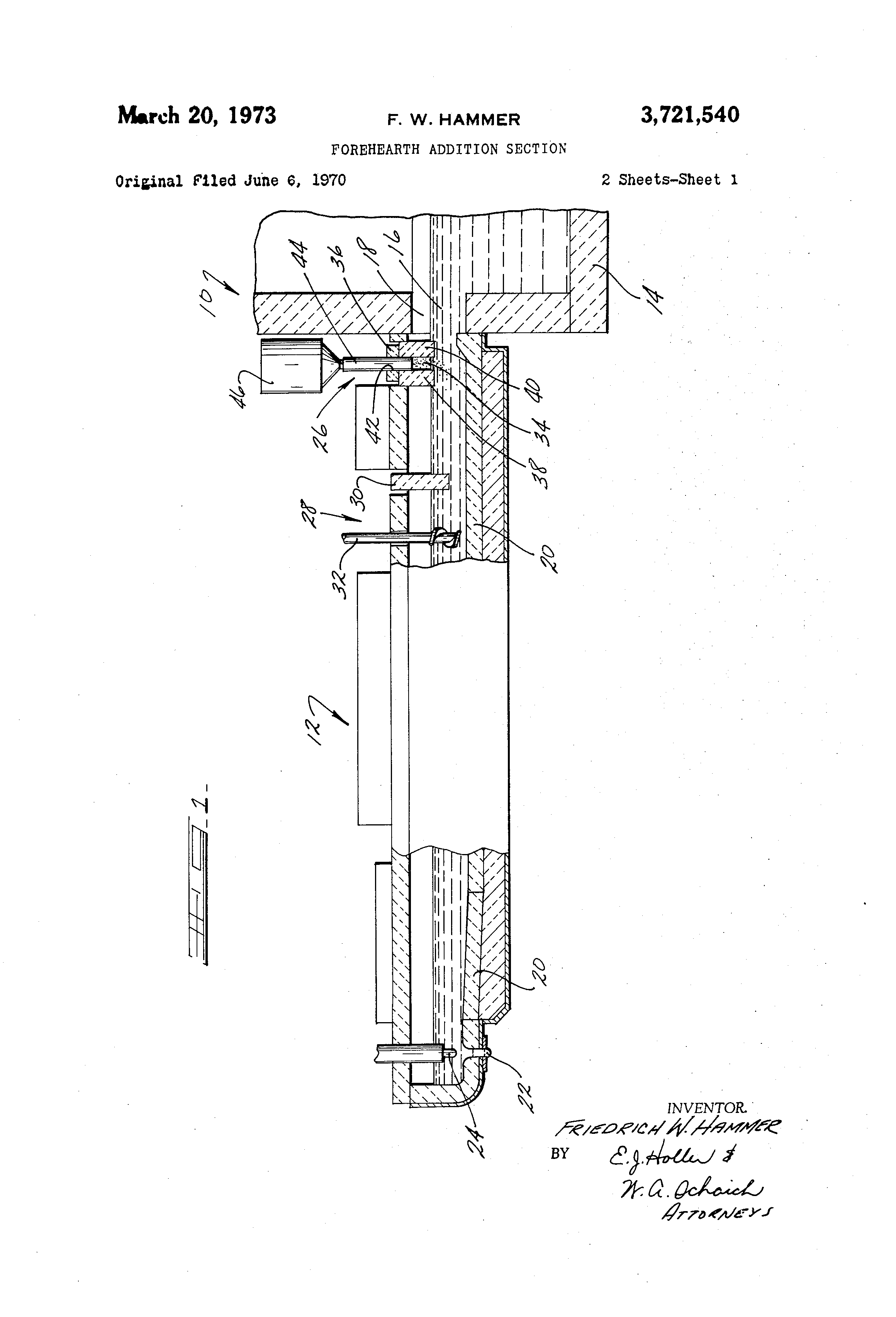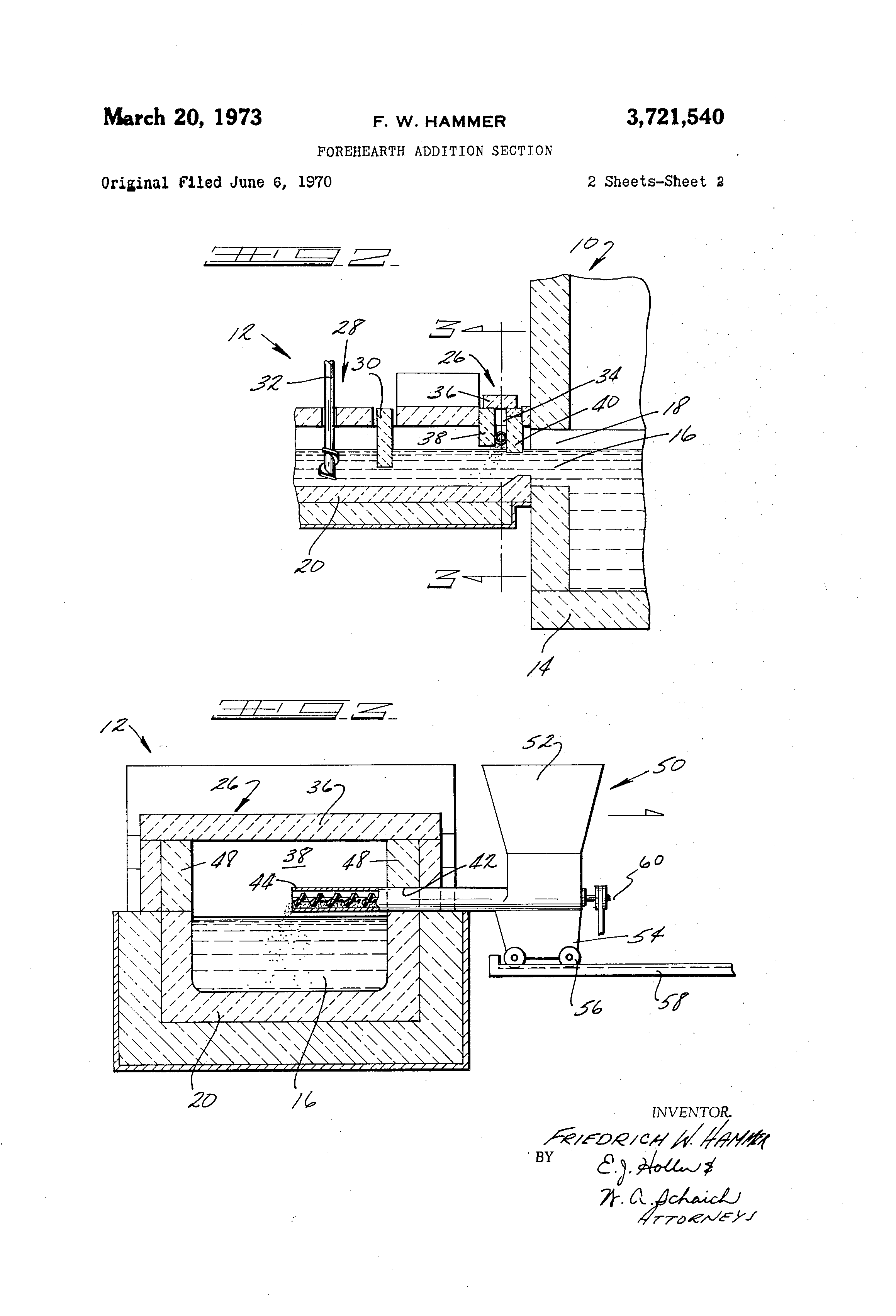 0 3@721@540, United States Patetit Office Patented Mar. 20, 1973 2 able for this purpo se as they are inhere ntly of a smalle r particl e size and, becau se of their higher colorat ion intensi ty, requir e substa ntially less materi al to be added per unit weight of molten base glass. Howe ver, when adding colora nt oxides to the forehe arth accord ing to prior art techni ques, where in the additio n takes place in a zone open to the adjace nt combu stion proces s, dustin g and volatili zation losses are sustain ed which have a signifi cant detrim ental ir@flu ence upon the overal l efficie ncy of the 10 system . This dustin, -, resulti ng from the pneum atic conve yance of the smalle r particl es by the turbul ent vapors of the adjace nt rombu stion proces s, has in additio n to the efficie ncy decre ase, other advers e charac teristic s. First of all, it provid es an opport unity for conta minati ng the 15 virgin glass supply existin g in the furnac e refine r. This is of particu lar import, where in a pluralit y of forehe arths exten d outnva rdly from a single rfffine r and distinct colora nts are separa tely added to the severa l forche arths, as inadve rtent colora nt transfe r to anothe r forehe arth, 20 and/or intermi xing of colora nts, produ ces objecti onable and highly undesi rable results . Secon dly, becau se of the small size of the conve yed particl e, a hygie nically unacc eptabl e worki ng env;ro nment is create d by an atmosp here of dust laden air. 25 S U M M A R Y O F I N V E N T I O N In acco rdan ce with this irve ntion , ther e is prov ided an impr ove ment in the tech niqu es for addi ng solid parti culat e matc rials into the fore hear th sect; on of a con30 tinuou s glass manuf acturln,- system , where by the efficie ncy of the additio n is greatl y iiierea sed, dustin g is preve nted or contro lled and the possibl e conta minati on of glass in the refine r or other forehe arths is virtuall y elim:,n ated. 35 More particu larly, there is provid ed a solid particu late additio n sectio n, forme d in the supers tructur e of a forehe arth, having front and back refract ory blocks sealed at their upper margin s defini ng an isolate d zone over the molten glass into which the additiv es are discha rged, 40 the sectio n also being provid ed with suitabl e particu late feedin g means. BRI EF DES CRI PTI ON OF THE DR AWI NGS The forego ing, and other advant ageou s featur es of 45 this inventi on will becom e appar ent upon refere nce to the drawin gs, of which: FIG. I is a longi tudin al secti onal view of a fore hear th sho win.- an emb odim ent of this inve ntion ; FIG. 2 is a parti al longi tudin al secti on of a fore hear th 50 showi ng an alterna te embod iment of this inventi on; FIG. 3 is a trans vers e secti onal view take n alon g the plan e 3-3 of FIG. 2. DESC RIPTI ON OF PREF ERRE D EMB ODIM ENT( S) t;5 Referr in- to the drawin gs, there is schem atically shown a glass furnac e 10 and a gasfired forehe arth 12 comm unicating with furnace 10. The base glass is melted and refined in the furnace tank 14 and the molten glass 16 flows through the furnace outlet 18 into a forehearth chan60 nel 20. At its forwar d end, forehe arth 12 is provid ed with an outlet 22, or other means for the discha rge of the glass, which may be under the contro l of plung er 24, for delive ry at the point of use. The plung er may be operat ed to contro l the volum e of glass passin g throug h outlet 22 either by adjust ment with respec t to the outlet, or by 65 recipr ocatio n 'there over to discha rge gobs of glass therethrough. Disp osed inter medi ate the fore hear th !orw ard end and the com muni catin g junct ure of furn ace 10 and fore hear th 70 12 is a stirrin g sectio n 28 and a particu late additio n sectio n 26, both being suppo rted by the forehe arth superstructure with the latter positioned upstream of the 3,721,540 FOREHEARTH ADDITION SECTION r,riedrich W. Hammer, Toledo, Ohio, assigacy to Owens-Illinois, Inc. Continuation of abandoned application Ser. No. 643,063, June 22, 1967. This 2pplication Nov. 6, 1970, Ser. No. 87,596 Int. Cl. C03b 5104 U.S. Cl. 65-27 5 CIaims ABSTRACT OF THE DISCLOSURE Introdtiction of solid particulate compounds into a molten base glass by utilizing a forehearth addition section and automatic feeding equipment; the addition section including front and rear refractory blocks definin- an isolated zone into which the compotinds are discharged and thereby providiii@ a more efficient, noncontaminating hygienically accep'table system. CROSS-REFERENCES This application is a continuation application of application Ser. No. 648,063, filed June 22, 1967, now abandoned. BACKGROUND OF INVENTION The present invention -enerally relates to the continuous manufacture of colored vitreous tnaterials, wherein a molten base glass flows from a melting and refinin.a furnace throu-h a forchearth, into which suitable solid Pa.-ticulate colorants are added to the base glass, and thence to the forming equipment or other points of use. More particularly, the invention relates to the forehearth section in which the appropriate colorants are added to the molten base glass. In the manufacture of glass articles, it is old in th,art to alter the composition of a molten base glass by addin.- solid partictilate compounds to a stream of this base glass as it flows throu.-h a forehearth and proceeds to the forming station or other point of use. Typically, a colorant-enriched glass frit or compounds of certain metals, cobalt oxide for example, are added in the forehearth, the purpose of which is to alter the inherent color of the base -lass composition. This invention is of particular utility in those systems wherein solid particulate oxides such as, for example, cobalt oxide, nickel oxide, copper oxide, arsenic oxide, antimony oxide, lead oxide, man-anese oxide, cerium oxide and molybdenum oxide are added to a molten base -,lass while it is flowing through the forehearth sectio