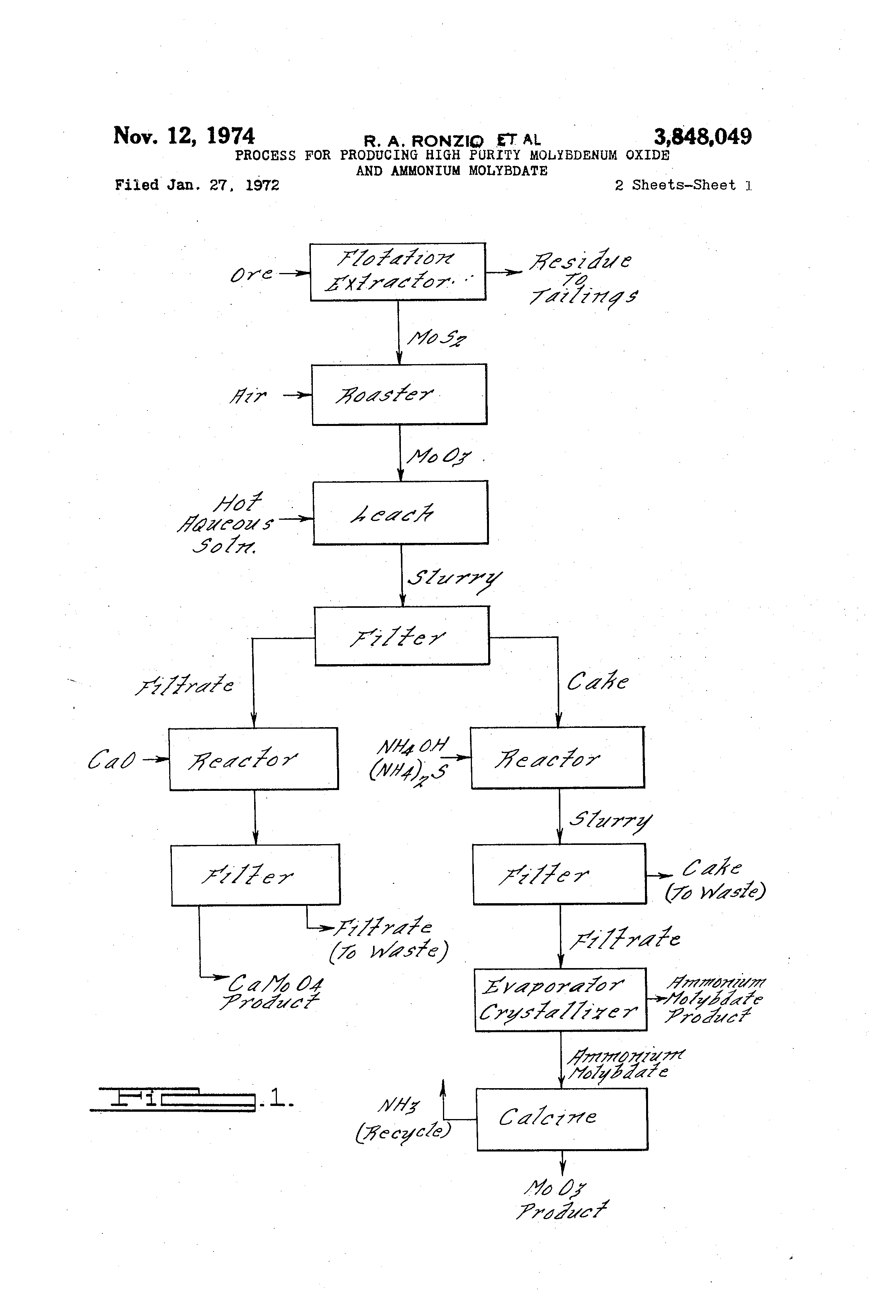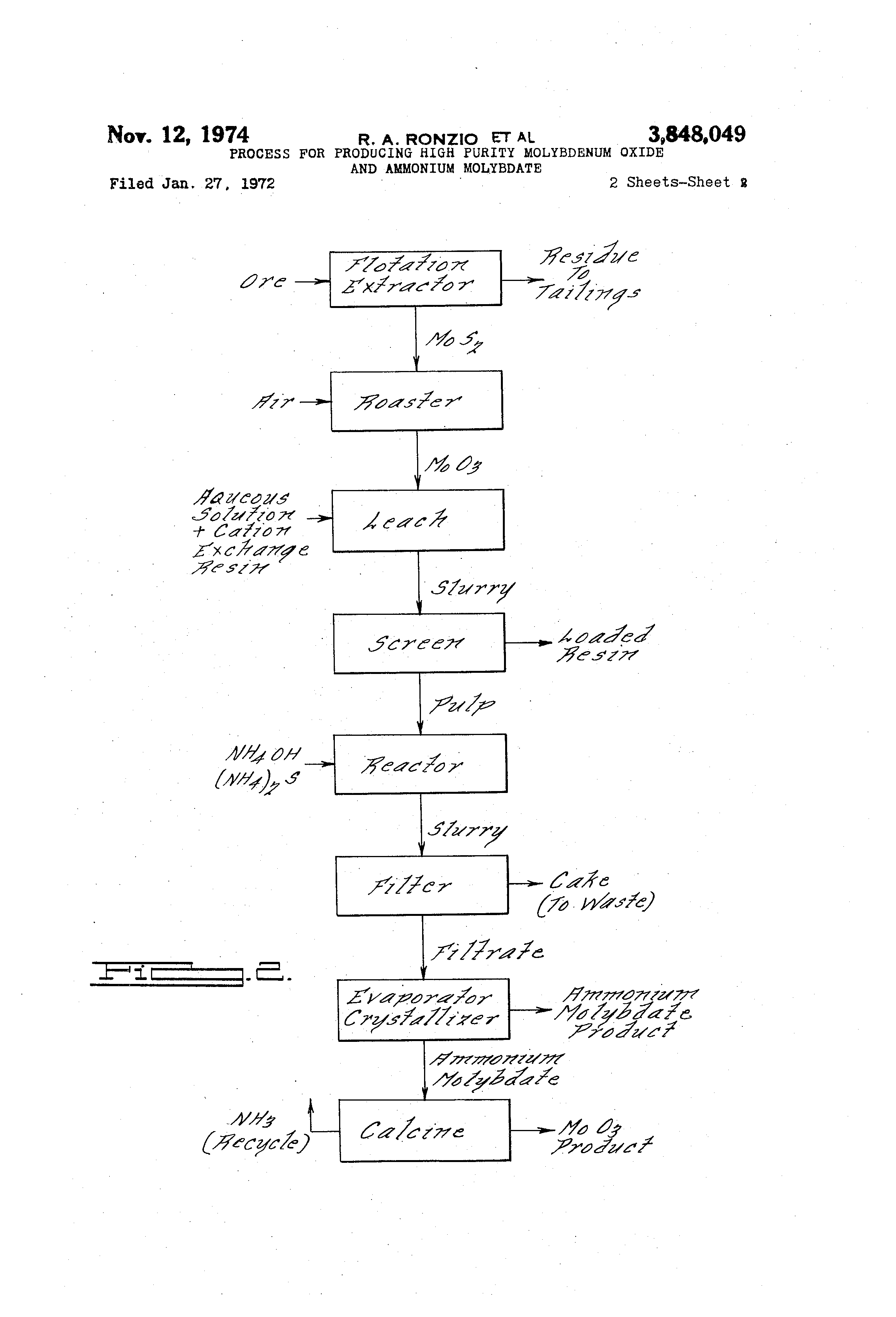 claimed is: 1. A process for producing a high purity molybdenum product which comprises the steps of extracting a molybdenite ore to produce a particulated concentrate having an average particle size of less than about 200 mesh and 40 consisting predominantly of MOS2, oxidizing said concentrate to convert substantially all of the MOS2 to molybdenum oxide, contacting the oxidized said concentrate with an aqueous leach solution at a temperature ranging from about 10' C. up to 100' C. forming a slurry con45 taining up to about 50% solids for a period of time sufficient to extract at least a portion of the contaminating metals including copper, potassium, magnesium, aluminum, sodium and iron from said concentrate, contacting said aqueous leach solution with a cation exchange resin 50 for adsorbing the extracted said contaminating metals from said solution in the form of a loading on said resin, separating the aqueous leached said concentrate from the loaded said resin and said aqueous leach solution, contacting the separated said concentrate with an aqueous am55 modiacal leach solution at a temperature ranging from about 25' C. up to about 100' C. and containing about 5% to about 30% ammonia for a period of time sufficient to convert substantially all of said molybdenum oxide therein to a soluble ammonium molybdate com60 pound, separating the remaining solid residue from said ammoniacal leach solution and thereafter crystallizing said solution and recovering a high purity ammonium molybdate prodilet. 2. The process as defined in claim 1, wherein the con65 facting of the separated said concentrate with said aqueous ammoniacal leach solution to convert substantiary all of said molybdenum oxide therein to a soluble ammonium molybdate compound is carried out in the presence of reactive free oxygen to further oxidize any soluble 70 ferrous ions present to the ferric state and effecting a precipitation of ferric hydroxide which coprecipitates phosphates, arsenates, lead hydroxide and alurninum hydroxide. 3. The process as defined in claim 1, including the 75 further step of calcining said ammoni-Lim molybdate Prorl- 9 uct and recovering a high purity molybdenum oxide product. 4. The process as defined in claim 1, wherein said aqueous leach solution contains from about 1% to about 10% of a mineral acid selected from the group consisting of hydrochloric acid, nitric acid, sulfuric acid and mixtures thereof. S. The process as defined in claim 1, wherein said concentrate contains at least about 85% molybdenum disulfide. 6. The process as defined in claim 1, wherein said aqueous ammoniacal leach concentration is at a temperature ranging from about 25' C. to about 75' C. 7. The process as defined in claim 1, in which the aqueous ammoniacal leaching step of said concentrate is carried out in the presence of sulfide compounds at a concentration greater than a stoichiometric amount of sulfied ion required to effect a precipitation of any contaminating copper, lead and zinc ions in the form of an insoluble sulfide. 8. The process as defined in claim 7, in which the sulfur compound is ammonium sulfide present in a concentration of from about two times to about three times the stoichiometric amount required. 9. The process as defined in claim 1, wherein the solids concentration of said concentrate in said aqueous leach solution ranges from about 33 % to about 40%. 10. The process as defined in claim 1, wherein said aqueous leach solution contains from about 1% to about 31848)049 10 5% nitric acid and is at a temperature of from about 20' C. to about 85' C. 11. The process as defined in claim 1, including the further step of separating the loaded said resin from said aqueous leach solution and eluting the contaminating metals adsorbed thereon to effect a regeneration of said resin and thereafter recycling the regenerated said resin for reuse in the extraction of further contaminating metals from said aqueous leach solution. 10 References Cited UNITED STATES PATENTS 21017,557 10/1935 Winkler et a] - ------- 423- 53 3,458,277 7/1969 Platzke et al - -------- 423- 54 15 1,952,459 3/1934 Pokorny ------------ 423-53 3,674,424 7/1972 Stanley et al - -------- 423- 53 3,739,057 6/1973 Daugherty et al - ------ 423- 56 3694,147 9/1972 Drobnish et al - ------ 423- 53 20 3:714,325 1/;l-q73 Bloom et al - -------- 423- 53 FOREIGN PATENTS 331,472 7/1930 @Great Britian --------- 423-61 HERBERT T. CARTER, Primary Examiner 25 'U.S. Cl. X.R. 423-56, 58, 61, 593, 606, 127, 140, 92, 101, 37