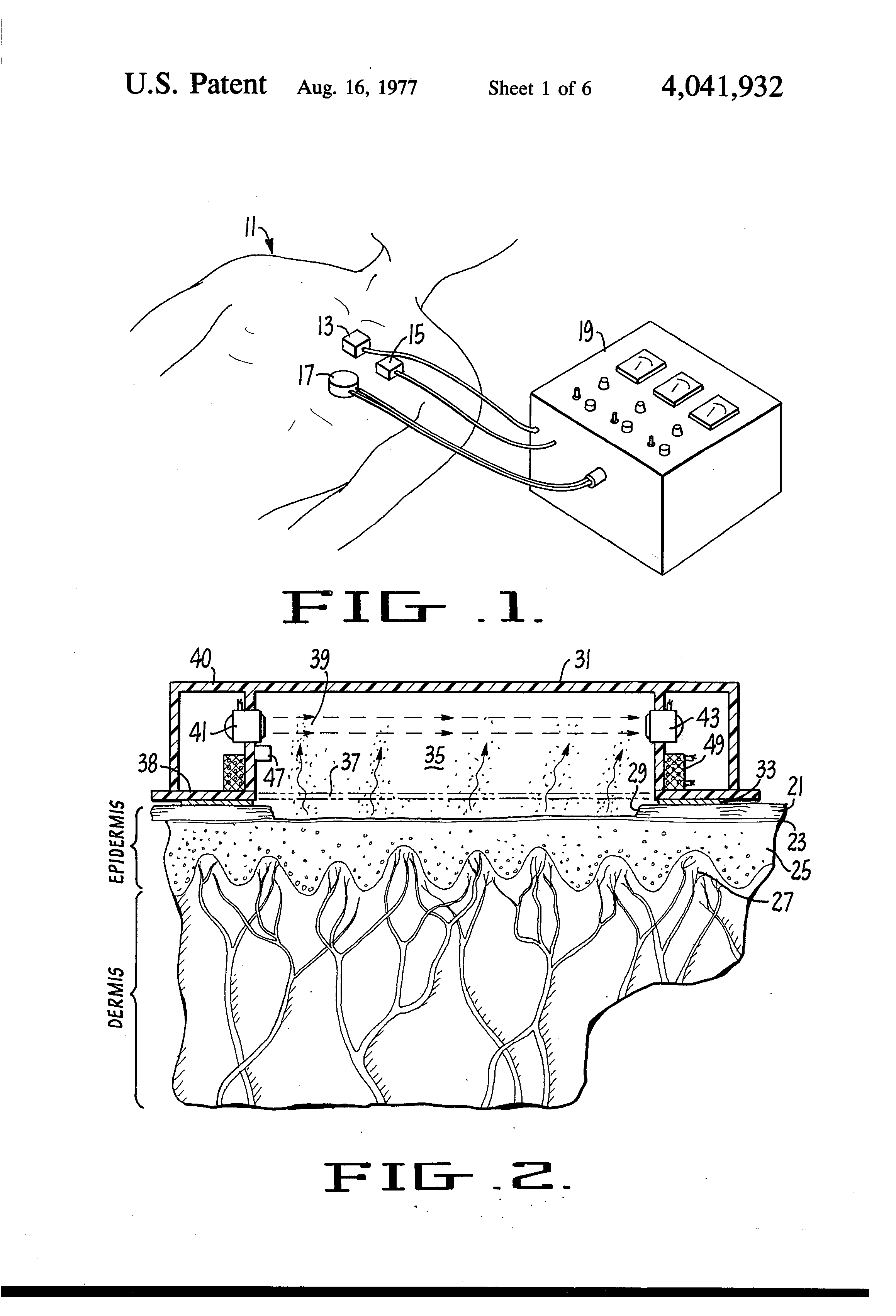 1. A method of monitoring a concentration of a constituent of interest in tissue fluids or blood of a person, comprising the steps of: removing a substantial amount of the person's stratum corneium skin layer over an area, positioning a chamber over said area in a manner to permit gases or fluids escaping from the body through said area to enter the chamber, sealing the chamber to the skin around said removed skin area in a gas and liquid tight manner, thereby to isolate the chamber and the removed skin area from surrounding atmosphere, collecting in the chamber gases or fluids emitted from the removed skin area in the chamber for a time until the transfer of the constituent of interest between the chamber and the body of the person is in equilibrium, passing a beam of electromagnetic energy above the skin through the collected gases or fluids within said chamber, said electromagnetic energy including certain wavelengths that are absorbed an amount proportional to the concentration of said constituent of interest in said chamber, and measuring the energy absorption of said certain wavelengths of said electromagnetic beam passing through said chamber, whereby the absorption level is proportional to the concentration of a constituent of interest in the body of said person. 2. The method according to claim 1 which comprises the additional step of heating said chamber during the measurement to maintain it at a uniform temperature in excess of the temperature of the patient's skin. 3. The method according to claim 1 wherein the fluids within said chamber are maintained within 6 inches of the patient's skin during the step of measuring the energy absorption. 4. The method according to claim 1 wherein the step of passing a beam includes positioning a source of electromagnetic energy in a side wall of said chamber, said source being energized by electrical wires leading to said chamber, and further wherein the step of measuring the energy absorption includes the positioning of an electromagnetic energy detector on a side wall of said chamber opposite the wall of said electromagnetic energy source, the signal of said detector being communicated externally by electrical conductors connected therewith. 5. The method according to claim 1 wherein the step of passing a beam includes generating the electromagnetic energy a distance away from said chamber and communicating it to said chamber by an optical fiber bundle that terminates in one side wall of said chamber, said step of measuring the energy absorption including positioning a detector a distance from said chamber with another optical fiber bundle communicating between said detector and a side wall of said chamber that is opposite the side wall in which the source fiber bundle terminates. 6. The method according to claim 1 wherein the step of positioning a chamber includes positioning an opening of the chamber over the removed skin area in a manner that gases can be transferred between the person and said chamber without any physical barrier whatsoever therebetween. 7. The method according to claim 1 wherein the step of positioning chamber includes orienting an opening of the chamber across said removed skin area and further includes the positioning of a membrane across the chamber opening, said membrane being selective to permit gases of fluids of interest to pass therethrough while excluding particles not of interest. 8. The method according to claim 7 wherein said chamber is filled with a liquid whose light absorbance qualities change in proportion to the amount of a constituent of interest that passes through said membrane into the chamber. 9. The method according to claim 8 wherein said liquid is a phenol red solution, whereby the light transmittance therethrough is proportional to the blood pH of said person. 10. The method according to claim 9 wherein the step of passing the beam includes passing narrow bandwidth ranges of light in each of the blue and green portions of the spectrum through said chamber. 11. The method according to claim 1 wherein said step of passing a beam comprises including radiation wavelengths in the far infrared that are highly absorbed by carbon dioxide, whereby the measured absorption level is proportional to the amount of carbon dioxide in the body of said person. 12. The method according to claim 1 wherein said step of passing a beam comprises the inclusion of certain ultraviolet radiation wavelengths that are highly absorbed by oxygen, whereby said absorption measurement gives a measurement of the concentration of oxygen in the body of said person. 13. The method of monitoring a concentration of a constituent of interest in tissue fluids or blood of a person, comprising the steps of: removing a substantial amount of the person's stratum corneum skin layer over an area, positioning a chamber over said area in a manner to permit gases or fluids escaping from the body through said area to enter the chamber, said positioning step including orienting an opening of the chamber across said removed skin area, and further includes the step of positioning a rigid perforated structure across said opening, whereby the person's skin is prevented from bulging into the chamber during measurement, sealing the chamber to the skin around said removed skin area in a gas and liquid tight manner, thereby to isolate the chamber and the removed skin area from surrounding atmosphere, collecting gases or fluids emitted from the removed skin area in the chamber for a time until the transfer of the constituent of interest between the chamber and the body of the person is in equilibrium, passing a beam of electromagnetic energy through said chamber, said electromagnetic energy including certain wavelengths that are absorbed an amount proportional to the concentration of said constituent of interest in said chamber, and measuring the energy absorption of said certain wavelength of said electromagnetic beam passing through said chamber, wh
