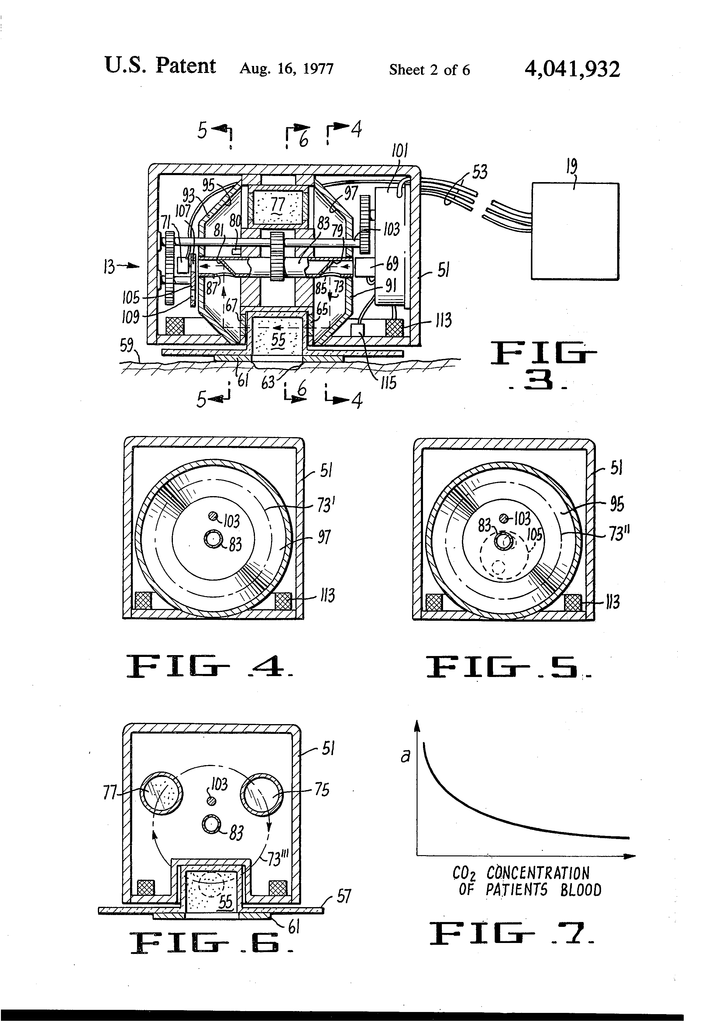 This invention relates generally to a method for monitoring the concentration of certain constituents of interest in the blood of a patient, particularly the blood gases oxygen and carbon dioxide, as well as the concentration of hydrogen ions (pH). It is important in the management of critically ill human patients that it be known how well the patient's life sustaining functions are performing. It has long been a goal to develop a technique for continuously monitoring the major functions of a patient. Some form of monitoring is considered to be essential in many circumstances, such as for a patient who is receiving intensive care or for a patient undergoing serious surgery. One major life sustaining function is pulmonary ventilation; that is, the function performed primarily by the lungs in exchanging carbon dioxide in a patient's blood for fresh oxygen from the air. Another major function is blood circulation of the patient which carries the blood's oxygen and carbon dioxide between the lungs and various portions of the body. A third major function is the patient's metabolism; that is, the ability of body cells and tissues to function. Monitoring of these major life sustaining functions permits corrective action to be taken in time to maintain life should a function be detected to be failing. The corrective action is usually taken almost without regard to the underlying disease which is causing the function to fail. Blood circulation is satisfactorily observed by present techniques and available equipment that monitor blood pressure and pulse rate of a patient. However, satisfactory techniques are not now available for continuously observing the ventilation and metabolism functions. The attempts to satisfactorily monitor these functions date a long way back in the history of medicine. An early technique for monitoring pulmonary ventilation involved monitoring the air expelled from the patient's mouth during breathing for its carbon dioxide and oxygen content to determine if the oxygen/carbon dioxide exchange is being performed satisfactorily by the lungs and other organs. This technique is inadequate since in many critically ill patients large alveolar-arterial gradients develop due to atelectasis, arteriovenous shunting, and deterioration of the mechanical functions of the lungs. It is also awkward since it interferes with the patient's normal breathing. Presently utilized techniques for monitoring the adequacy of pulmonary ventilation only provide for intermittent sampling and measuring of the partial pressure (concentration) of oxygen and carbon dioxide and the concentration of hydrogen ions (pH) in the blood. The level of oxygen measures the probability that a patient's tissues are receiving adequate nutrition. If there is not a sufficient oxygen level in the blood, respiratory therapy with blood transfusions or fluid replacement may be made to temporarily improve tissue oxygenation while the underlying cause for the problem is being diagnosed and treated. The partial pressure or concentration of carbon dioxide in the blood and blood acidity as measured by concentration of hydrogen ions (pH) provides information as to the extent of the metabolic stress under which the patient's tissues are laboring. Unfavorable metabolic conditions as detected by monitoring carbon dioxide and pH can be attacked directly by respiratory therapy and intravenous fluids while the underlying disease causing the imbalance is being diagnosed and treated. Such derangement of major life sustaining functions in a patient are corrected, at least temporarily, independently of the underlying disease which caused the condition. Once corrected, the tissues and the vascular system are better able to resume normal operation that help maintain life. Early detection of changes in blood gas and pH values is essential in order to prevent a cardiovascular catastrophe but no accurate and fast device is commercially available for continuously detecting such blood chemistry changes. Alterations in blood gas tension and pH often precede such function changes as can be detected by other existing techniques such as monitoring arterial and venous pressure, use of an electrocardiogram or electroencephalogram or by observing the outward clinical appearance of the patient. The most straight forward approach to these blood chemistry measurements is to periodically withdraw an arterial blood sample from the patient and then test it to determine the various concentrations. This technique suffers the disadvantage of not continuously providing the desired information, requiring a significant amount of blood to be withdrawn from the critically ill patient over a period of time and further requiring manual implementation. Furthermore, the data obtained represent the blood constituent concentrations only at an instant in time and does not reflect trends. Inaccuracies of such techniques, even with elaborate testing devices, is discussed by Adams et al in Anaestheia, Vol. 22, No. 4, Oct., 1967, pp. 575-597. Serious complications, thrombosis and embolism, may develop in patients during and following arterial puncture or catheterization as reported by Formanek et al in Circulation, XLI, pp, 833-839 (1970). There has been a great deal of effort in the past to develop an accurate, real time technique for monitoring blood gas tension and pH. A substantial amount of work has been performed by others in the direction of developing extracorporeal instruments to which the patient's circulatory system is coupled in order to provide more or less continuous analysis of blood gas tension and pH data. For example, such work has been reported by Walton et al in Biomedical Sciences Instrumentation, Vol. 7, pp. 155-158, and by Clark et al in Computers and Biomedical Research, 4, pp. 262- 274 (1971). Another approach for continuous measurement of these parameters which has received a great deal of attention in the past decade is the temporary implanting in an