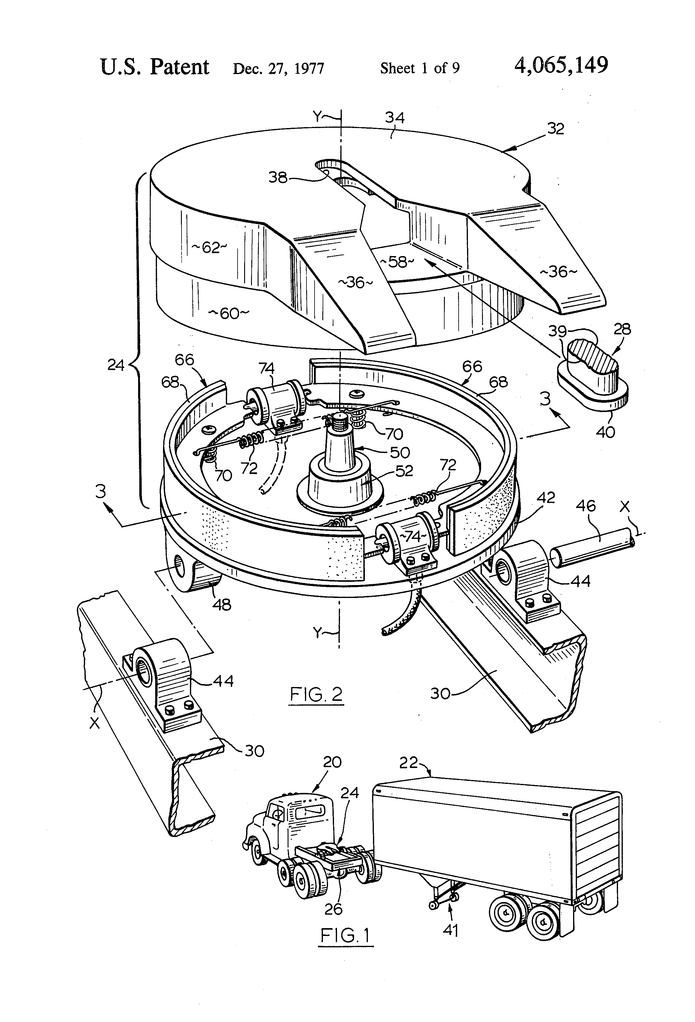 Reference will first be made to FIG. 1 which shows a tractor-trailer including a tractor unit 20 and a trailer 22. A fifth wheel coupling 24 is provided on the frame 26 of the trailer unit. As is conventional, the trailer 22 has at its forward end a depending coupling pin which is releasably connected to the fifth wheel coupling 24 and by which the trailer 22 is connected to the tractor unit 20. The coupling pin is not visible in FIG. 1 but is shown separate from the trailer at 28 in FIG. 2.