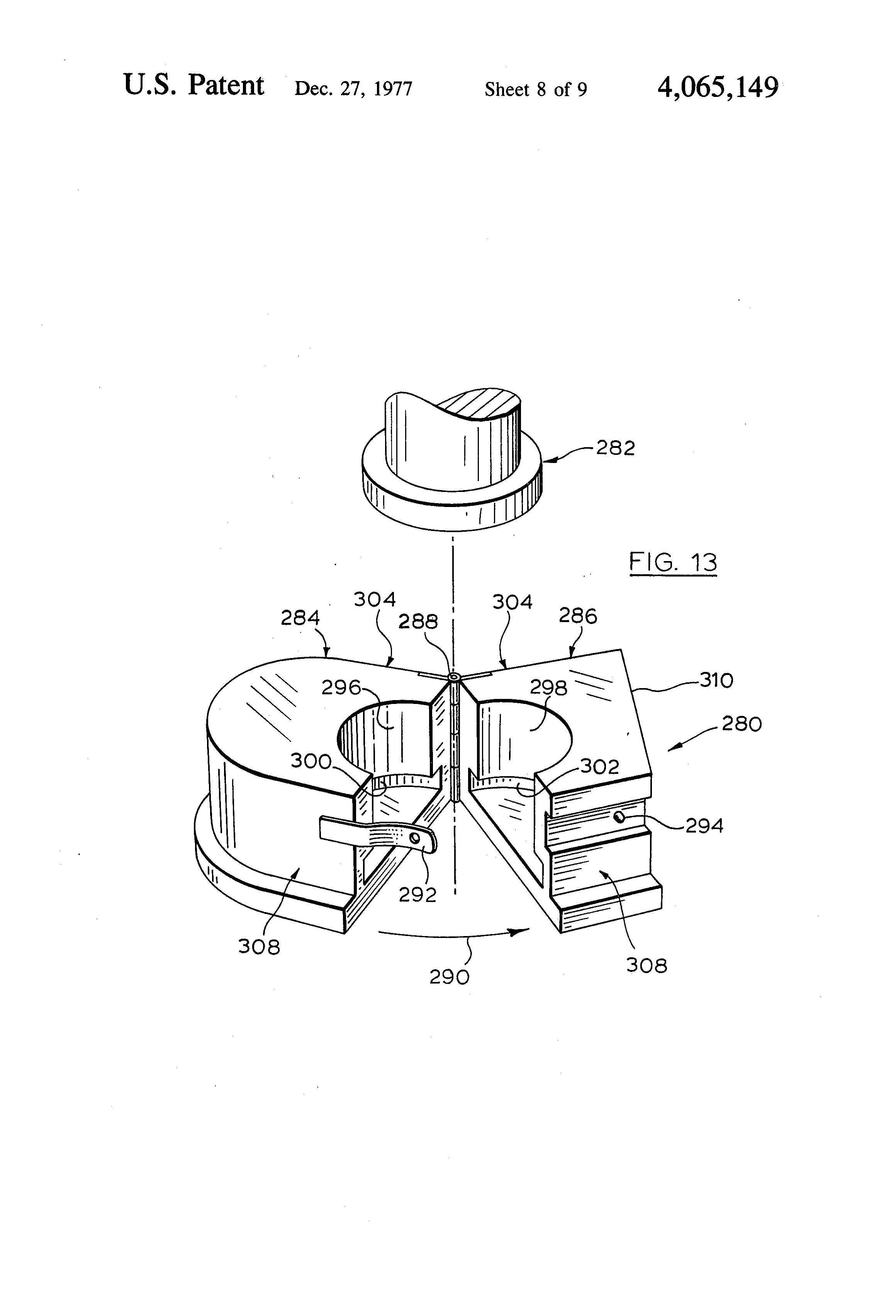 As can be seen from FIG. 13, the block is made in two halves 284, 286 which are coupled together by a hinge 288. The hinge allows the two halves of the coupling block to be moved between open positions such as those shown in the drawing, and positions in which the two halves are closed together as indicated by arrow 290. The halves are retained in the closed position by a spring member 292 on one half which engages over a pin 294 on the other half.
