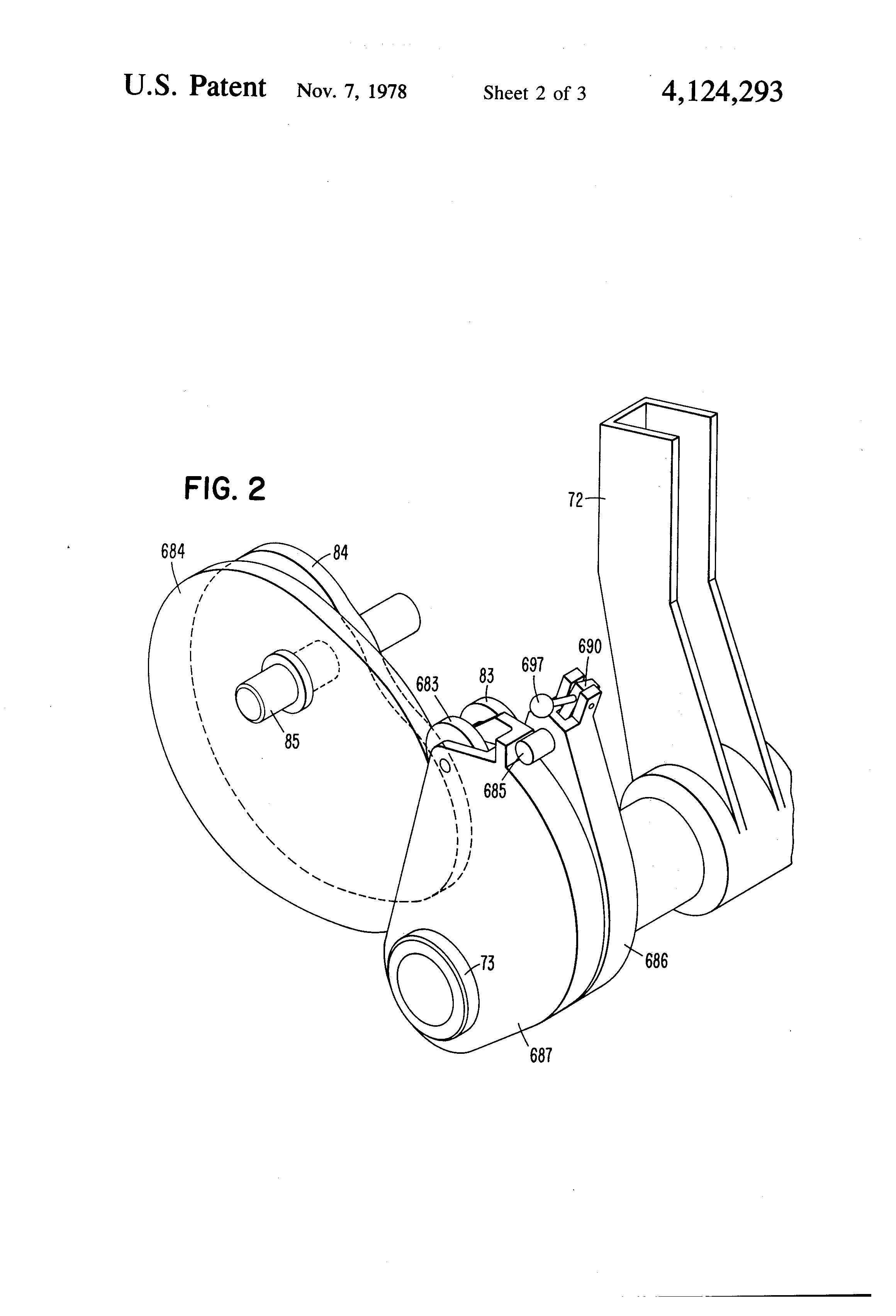 Spring 702 is fastened to the machine frame and provides a bias force to hold arbor 687 and cam follower 683 against the profile of cam 684 when selection pin 685 is not engaged with arbor 687. This is necessary to prevent arbor 687 from falling away from the cam since, as mentioned above, arbor 687 is free to rotate on shaft 73.