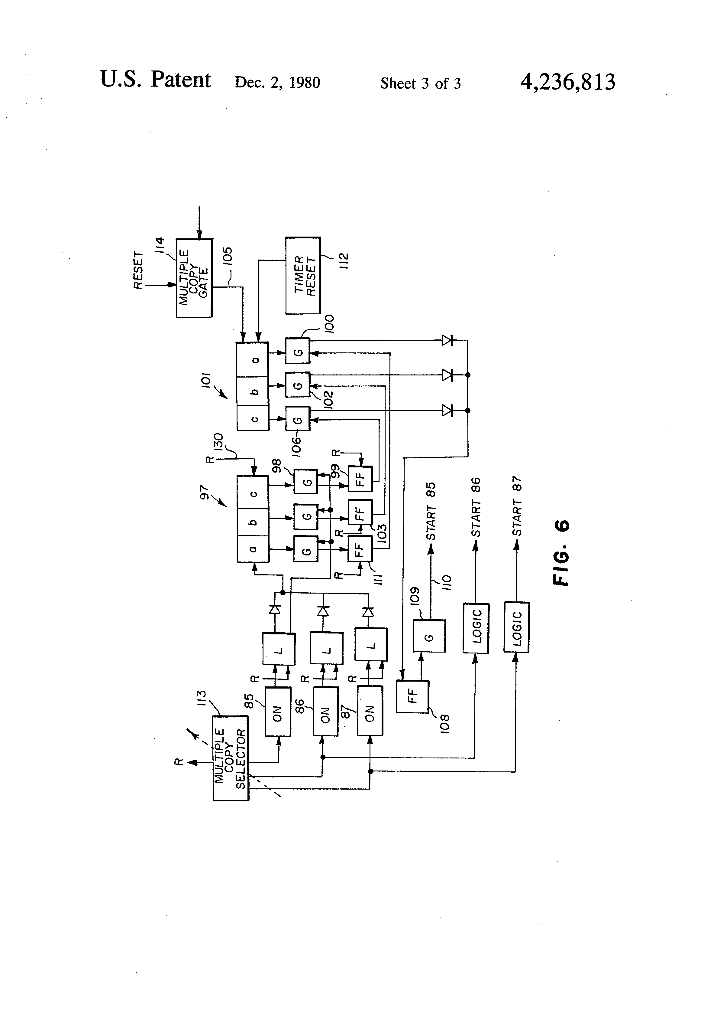 Briefly recapitulating the logic operation discussed above, the memory counter 97 is successively advanced stage-by-stage upon each "on" initiation of any one of the scan station switches 85, 86, or 87 to effectively count the priority position of that station with respect to the other stations that have been initiated earlier. The closure of the "on" switch for any station selects that one of the three gates and latches associated with that station. Thus, for example, if the station is the second to be initiated, it selects the middle "AND" gate and the middle latch, associated with counter stage 97b. The reset counter 101 on the other hand is successively advanced in step-by-step fashion upon completion of each scanning cycle to count the total number of cycles of the machine. Therefore as the machine successively cycles and makes copies, the reset counter 101 ultimately reaches the stage or position that has been "remembered" by the latches set by memory counter 97 whereupon the selected one of its gates 100, or 102, or 106 is energized by both the previously set latch [e.g. 98 or other] and by the stage of reset counter 101 to activate the scan station.