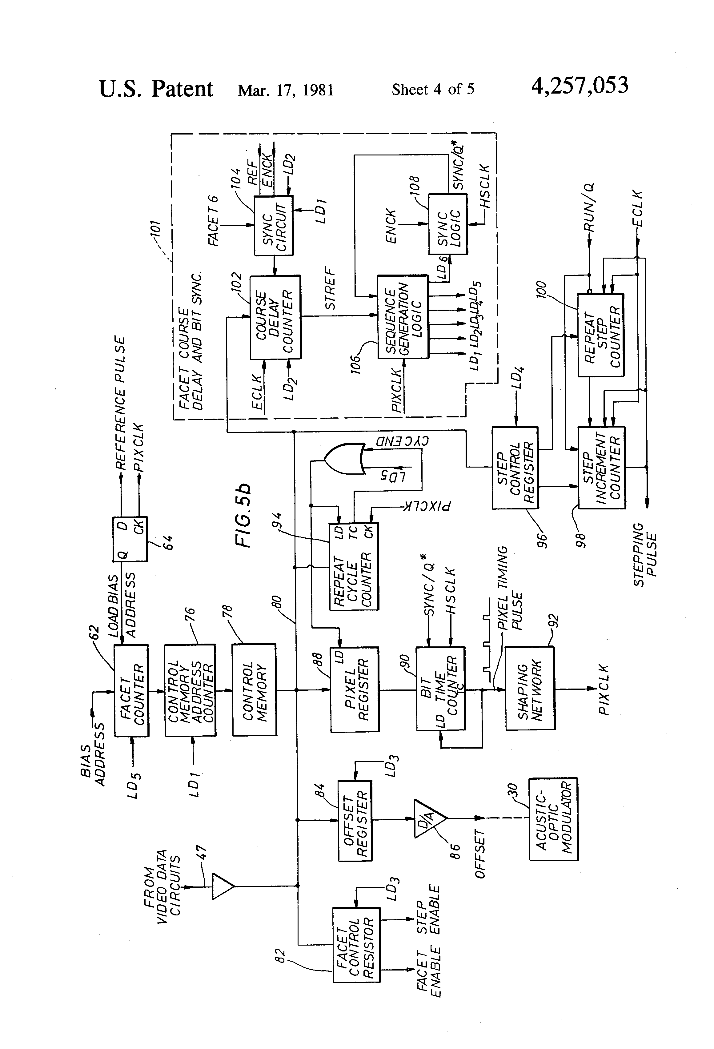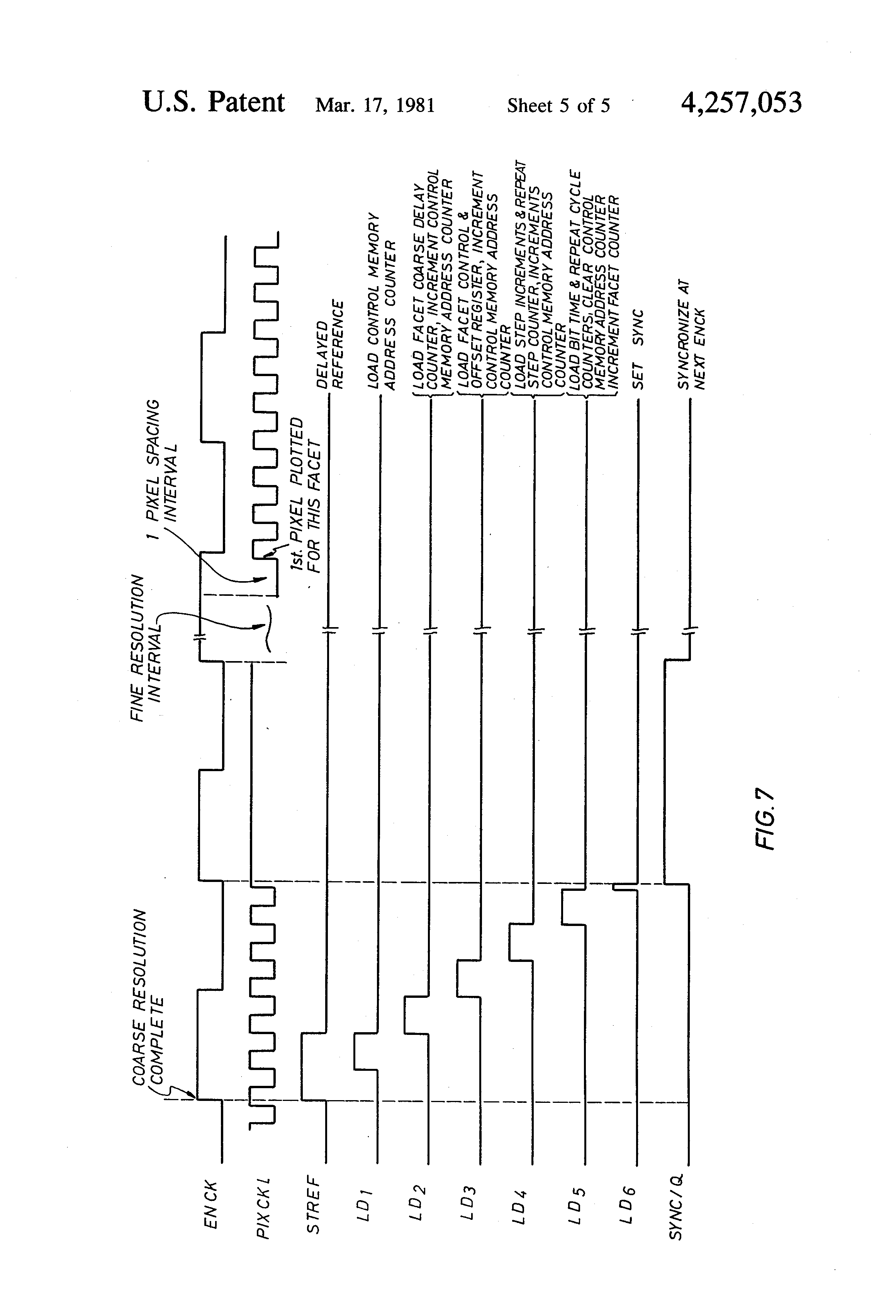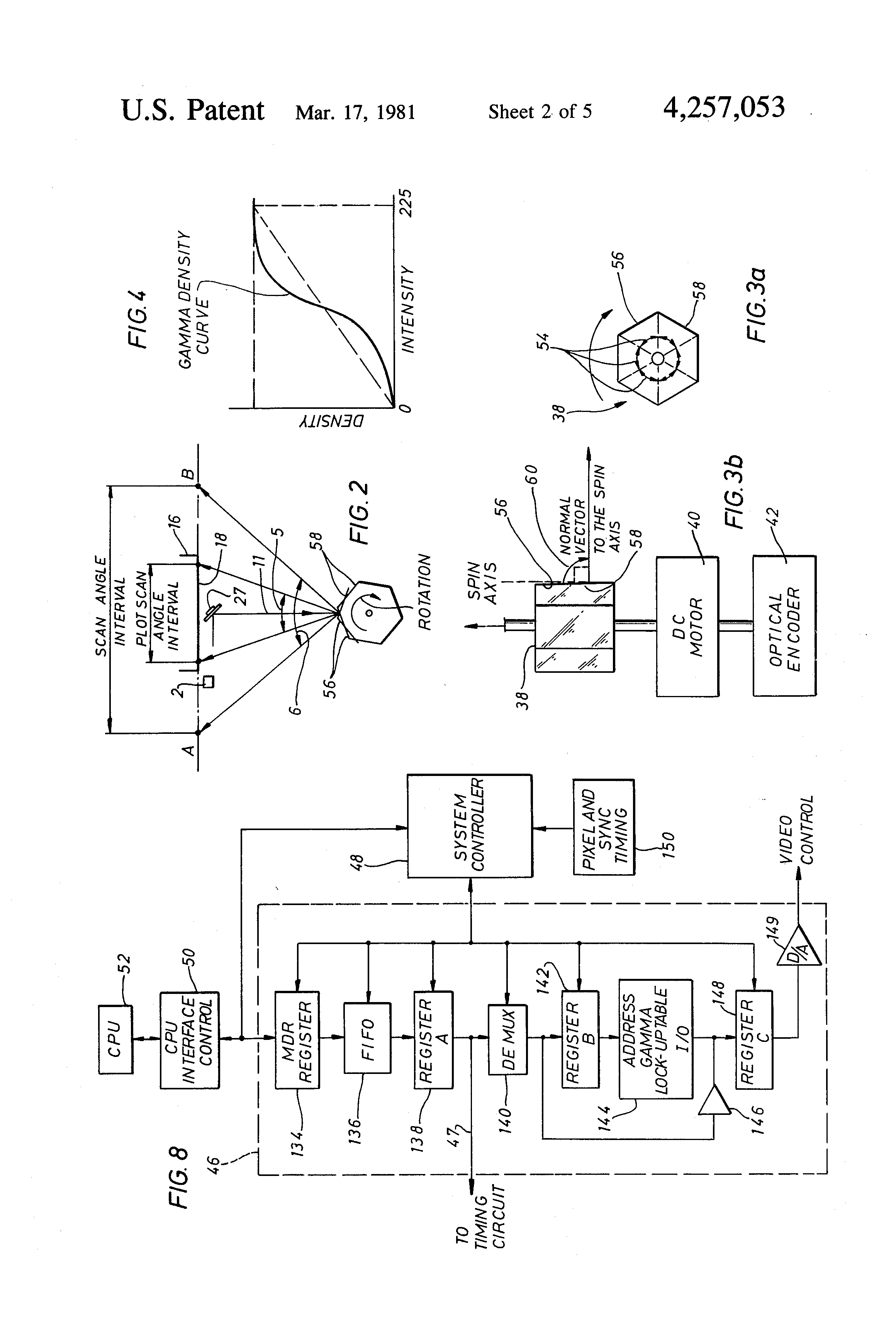For a fuller understanding of the nature and objects of the invention, reference should be had to the following detailed description taken in connection with the accompanying drawings, in which: FIG. 1 is a block diagram of the high-resolution laser plotter; FIG. 2 is an illustration of the relationship between the scan angle interval and the plot scan angle produced by the rotating mirror; FIG. 3(a) is a top view of the multi-facet mirror showing the angle subtended by each facet of the mirror which has tolerances that result in facet-to-facet errors; FIG. 3(b) is a side view of the rotating mirror assembly illustrating the source of the facet-to-axis error; FIG. 4 is a plot of the gamma density curve for the light-sensitive film; FIG. 5(a) is a circuit diagram of the phase-locked loop frequency multiplier; FIG. 5(b) is a block diagram of the timing circuits which produce the spot placement signals including compensation for the mirror errors; FIG. 6 is a circuit diagram of the facet coarse delay and bit sync circuits which locate the start plot position for each facet to a coarse resolution and generate the sequence signals for the timing circuits; FIG. 7 is a timing diagram of the circuits illustrated in FIG. 6; and FIG. 8 is a block diagram of the video data circuits illustrated in FIG. 1. Similar reference characters refer to similar parts throughout the several views of the drawings. It will be helpful in understanding the following discussion to define certain logic terms. Each of the logic signals to which reference is made in the following discussions will have one of two possible logic states, a logic 1 or a logic 0. A logic signal will be designated as a true signal without an astric following the mnenomic. As an example, CLOCK would be a true signal while CLOCK* would be its inverse. Each logic signal, be it the true signal or its inverse, will have an asserted and unasserted state. In the case of CLOCK, a ture signal, the asserted state will be a logic 1 and the unasserted state a logic 0. For CLOCK*, the reverse is true, the asserted state is logic 0 and the unasserted state is logic 1. A signal goes "true" when it switches from the unasserted to the asserted state and vice-versa when it goes "false". Lastly, a flip-flop is in a logic 0 state when the Q output is at a logic 0 and the Q* is at a logic 1. In the logic 1 state the outputs of the flip-flop are in their reverse states. Furthermore, it should be noted that reference to specific component parts of specific manufacture are for the sake of example only and do not constitute limitations on the instant invention. Turning now to the figures and first to FIG. 1, a block diagram of the preferred embodiment of the present invention is illustrated. For this embodiment, a central processing unit (CPU) 52 is used to supply the plot data and the system commands to cause the high-resolution plotter herein described to produce its plots. For the preferred embodiment, a RDS 500 minicomputer manufactured by Ratheon Corporation is used for CPU 52. The CPU interface control circuitry 50, constructed according to standard interface procedures for this model of minicomputer, interfaces the CPU 52 to the internal circuits of the laser plotter. A system controller 48 responds to commands from the CPU 52 to initiate the plotting sequence. During that sequence, plot data from CPU 52 is supplied to the video data circuits 46 which in turn respond to the system controller 48. The video data circuitry 46 produce a video control signal in accordance with the plot data to modulate the laser beam to produce the variable intensity spots on the light-sensitive film. Standard films may be used for the light-sensitive film, such as wet process silver halide Kodak 2497 or its equivalent. However, films such as dry processed heat developed 3M Day Silver or its equivalent may also be used, in which case no chemicals or toners are required. A multi-facet mirror 38, which for the preferred embodiment is a hexagonal or six-sided mirror, is rotated by a DC synchronous motor 40. For the preferred embodiment, the mirror is rotated at approximately 500 revolutions per minute. Attached to the shaft of the rotating mirror 38 is an incremental optical encoder 42 which produces a reference pulse REFERENCE PULSE and the timing signal ENCK that are used by timing circuits 44 to generate both the pixel placement timing pulses and the stepping pulses to the stepping motor 20. Stepping motor 20 is used as the motivating force to rotate platen drum 15. Connected between platen drum 15 and stepping motor 20 is a zero-backlash gear reducer 22 which transforms the incremental steps in rotation of stepping motor 20 into microstep increments in rotation of platen drum 15. In this manner, very small and accurate incremental steps in rotation of platen drum 15 can be produced with present technology stepping motors. For the preferred embodiment, stepping motor 20 is Measur-Matic Electronics Corp. NP74-SSD-4-64. The zero-backlash gear reducer 22 is manufactured by the Illinois Tool Works, Inc., Spiroid Division as an 80:1 zero-backlash gear reducer. The stepping motor 20 in combination with its associated driver produces 12,800 steps per revolution operating at 96 RPM continuous duty. Responsive to that rate, the zero backlash gear reducer 22 produces an output of 1.2 RPM with a positional accuracy of better than 25 arc seconds and a resolution of 10 micro-inches per step increment. The positional accuracy of the output of the gear reducer 22 is related to the plotting accuracy of 500 lines per inch which equals 260 arc seconds of platen drum 15 rotation to achieve 2,000 micro-inches line-to-line spacing. With a line-to-line accuracy of±10% for the preferred embodiment, a±26 arc seconds absolute positional accuracy results. As is readily apparent, the stepping motor 20 and gear reducer 22 cooperate to produce a micro-incremental step in film advancement that is substantial