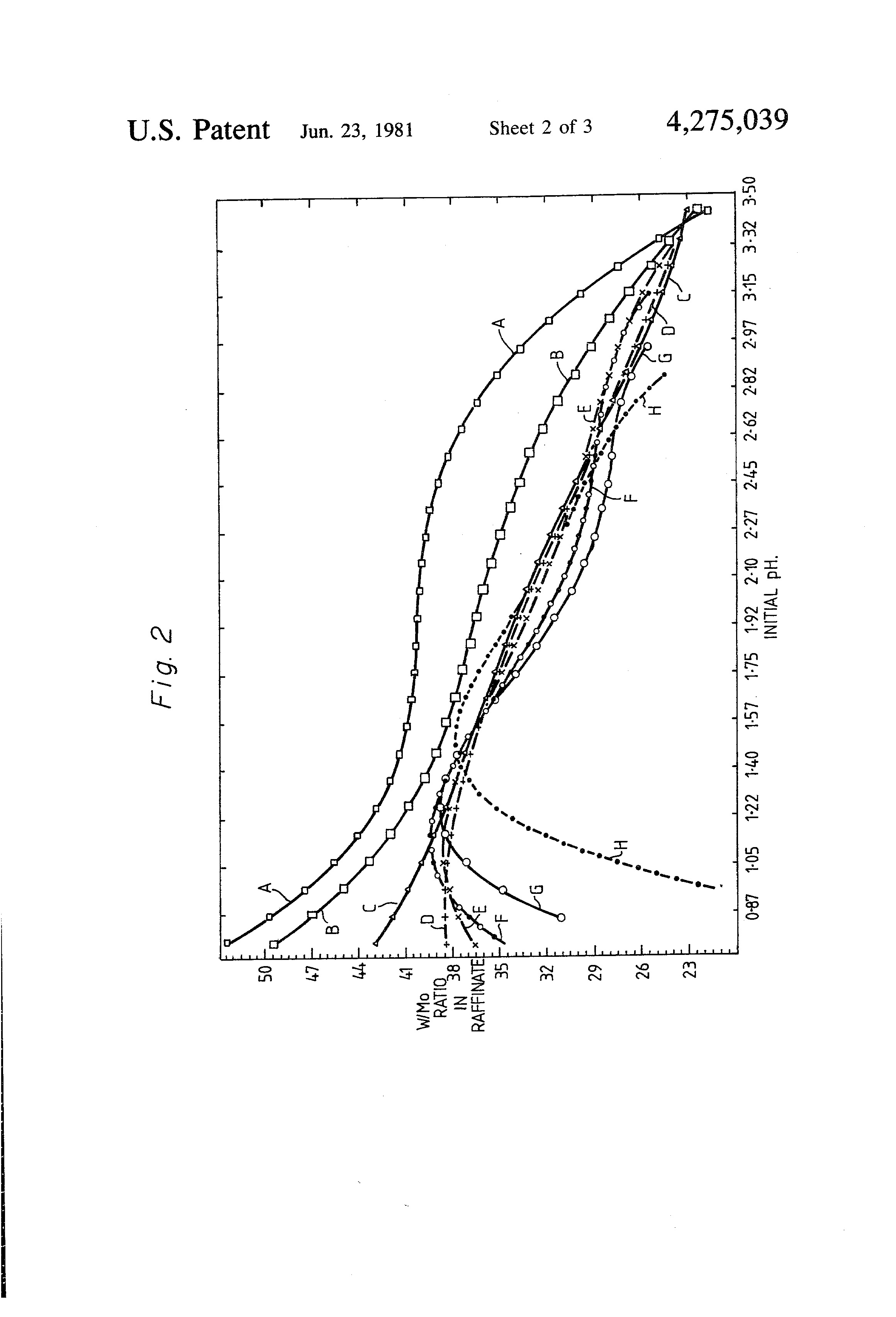 Graphs of ES (Separation coefficient) and the W/Mo weight ratio in respectively the raffinate and the extractant phase at equilibrium against the initial pH of the feed, each at several mole ratios of hydrogen peroxide to total Mo+W at 15° C. have been determined from the results obtained, employing regression analytical techniques and are shown here in respectively FIGS. 1 to 3.