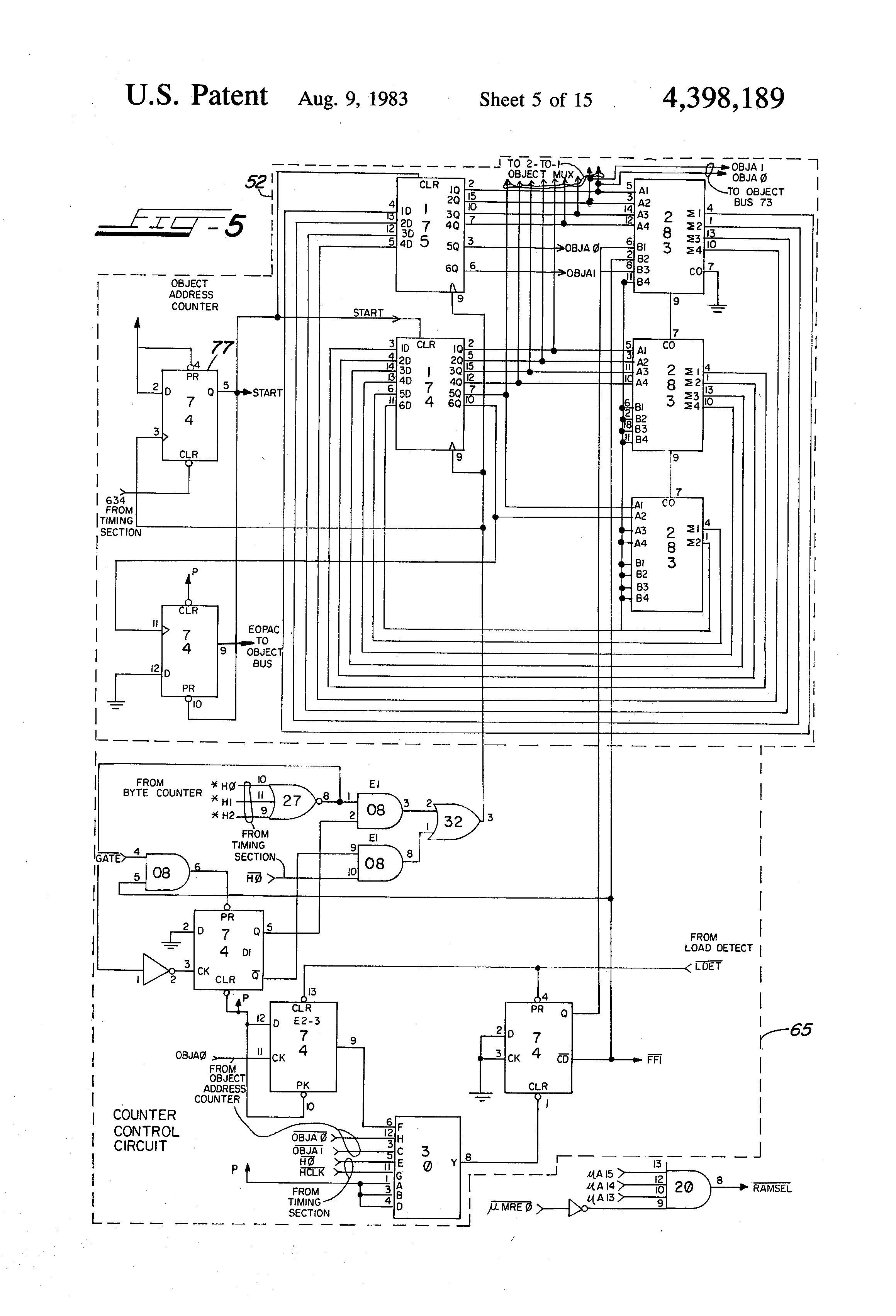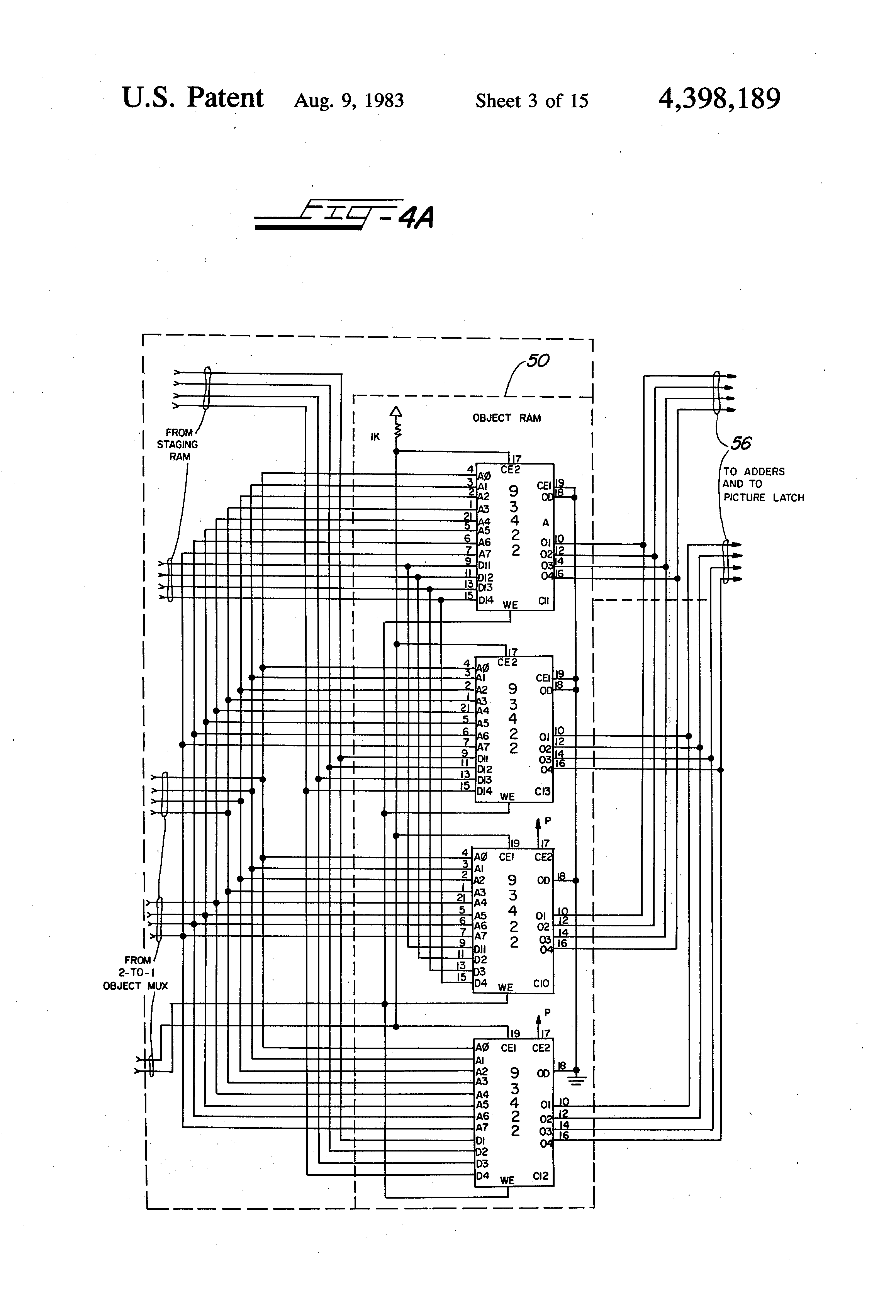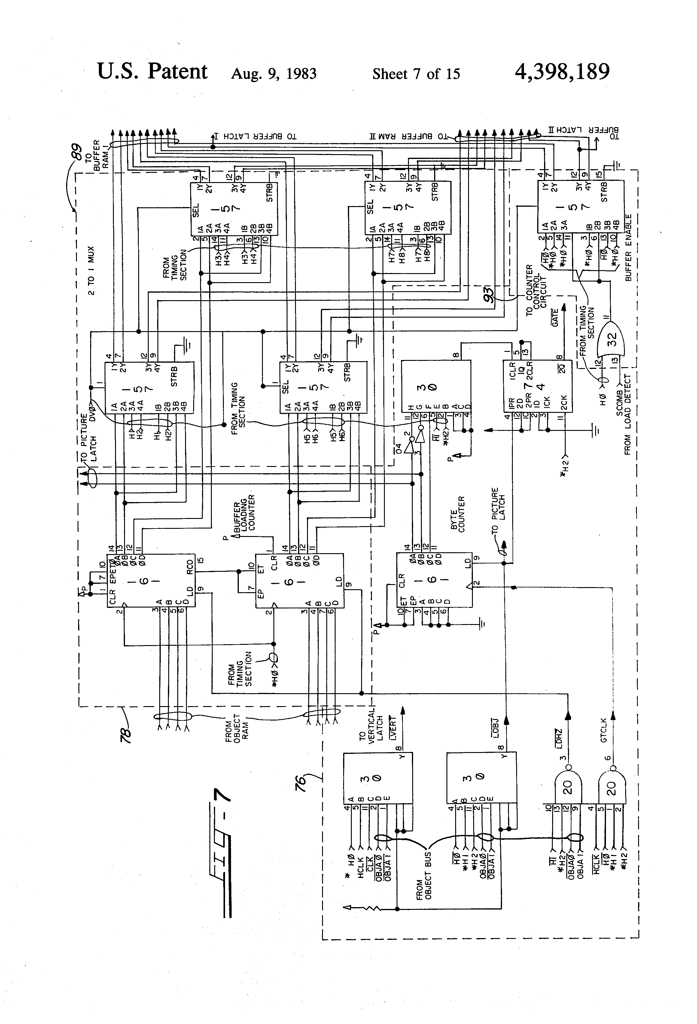 This invention relates to the display of video images in the context of electronic video amusement games. The growing sophistication of video games increasingly requires the display of large numbers of moving objects in a video display. Also, now that color monitors are commonly used, game displays require complex background patterns over which the moving objects move during game play. Modern video games are frequently designed for microcomputer control. Currently available microcomputers have limited computational power which may readily be overwhelmed by the simultaneous demands of game calculations and display control. Such demands have in the past been met with the use of high speed general purpose computers. The high cost of such computers, however, makes their use impractical in commercially viable video games. Recent developments in the video game art have been directed to the design of hardware that tends to relieve the game microcomputer from its display control responsibilities. The game microcomputer is then available for game associated computations to the extent that it can delegate the supervision and control of the game display to the display hardware. On the other hand, the display hardware "steals time" from the microcomputer to the extent that the hardware must communicate with the microcomputer and to the extent that the hardware requires microcomputer supervision. One example of a proposed use of dedicated display hardware is provided by Mayer, et al., U.S. Pat. No. 4,112,422. In Mayer the microcomputer specifies to a separate display circuit the objects that are to be displayed and the display positions of the objects. The display circuit then generates a signal suitable for use by a home TV receiver utilizing counters which are activated when the display positions of the various objects are reached. The design requires one counter for each object to be displayed. It is evident that the circuitry taught by Mayer, et al., necessarily increases in size, complexity, and expense as the number of objects displayed increases. The Mayer circuitry also requires that the microcomputer operate "in step" with the display circuitry. The display circuitry is not, therefore, substantially "transparent" to the microcomputer operations. The freedom of the microcomputer to perform game computations is also thereby severely limited. Some of the disadvantages of Mayer, et al., might be obviated by the system of Chung, U.S. Pat. No. 4,177,462. Chung's display circuit utilizes display controllers which act upon data supplied by the microcomputer. Each controller is indicated as having the capability of controlling up to 16 objects and putting a substantially single color background between each pair of objects. The objects are displayed on the basis of data supplied by the microcomputer which must, in turn, interrogate the display circuitry to obtain some of the game computational logic from a replaceable cartridge ROM in the display circuitry. Chung's display circuit, at best, gives the microcomputer only limited relief from duties that steal time that would otherwise be available for game-associated calculations. The microcomputer is required to be inactivated whenever communications occur between the microcomputer and the display circuitry. A further disadvantage of the Chung design is that it requires the use of content addressable memories which are special purpose devices and tend to be costly. It would be much more desirable for commercial reasons to build circuits using readily available low cost devices in the design of circuitry for arcade games. A feature of a preferred embodiment of the present invention is the rapid composition of a single horizontal line of a picture on the basis of minimal information from the game microcomputer. The passing of information from the microcomputer to the display circuit may then be completed in a very short period of time by a quick "handshake" operation. Except during the handshake period, which may take place at any time during the display cycle, the microcomputer and display circuitry operate independently of each other. The game display may have representations of objects to be displayed stored as blocks of digital data in a permanent memory means. Some of the blocks of data may be representations of a single object in a sequence of different orientations. Sequential presentation to a viewer of the different orientations in successive pictures would then provide an illusion of a single rotating object. Because of the flexibility of the display circuitry it is only necessary to store representations of rotations through a single quadrant. That is, the circuitry can display the 360° rotation of the point of an arrow about an axis if representations of the arrow pointing straight up, 90° to the right, and sufficient positions in between to give the illusion of smooth motion are contained in the permanent memory. The display circuitry is capable of inverting one or both orthogonal axes of presentation in order to generate the three remaining quadrants. The circuitry may also utilize a permanent memory means to store background information in the form of blocks of digital data. An embodiment of the invention provides means for determining which bits of data from the object, or foreground, memory means, and the background memory means are required for the composition of each horizontal line of a raster scan video display. Having made the determination, a transfer means then begins loading a buffer means with the digital data required by forthcoming horizontal lines. Loading of the buffer means begins just prior to the commencement of the display of a single picture and continues throughout the display of that picture. Meanwhile output means cause the buffer means to begin outputting a data stream for controlling the video presentation. Control means are provided for controlling the picture on a color monitor using the information provided by