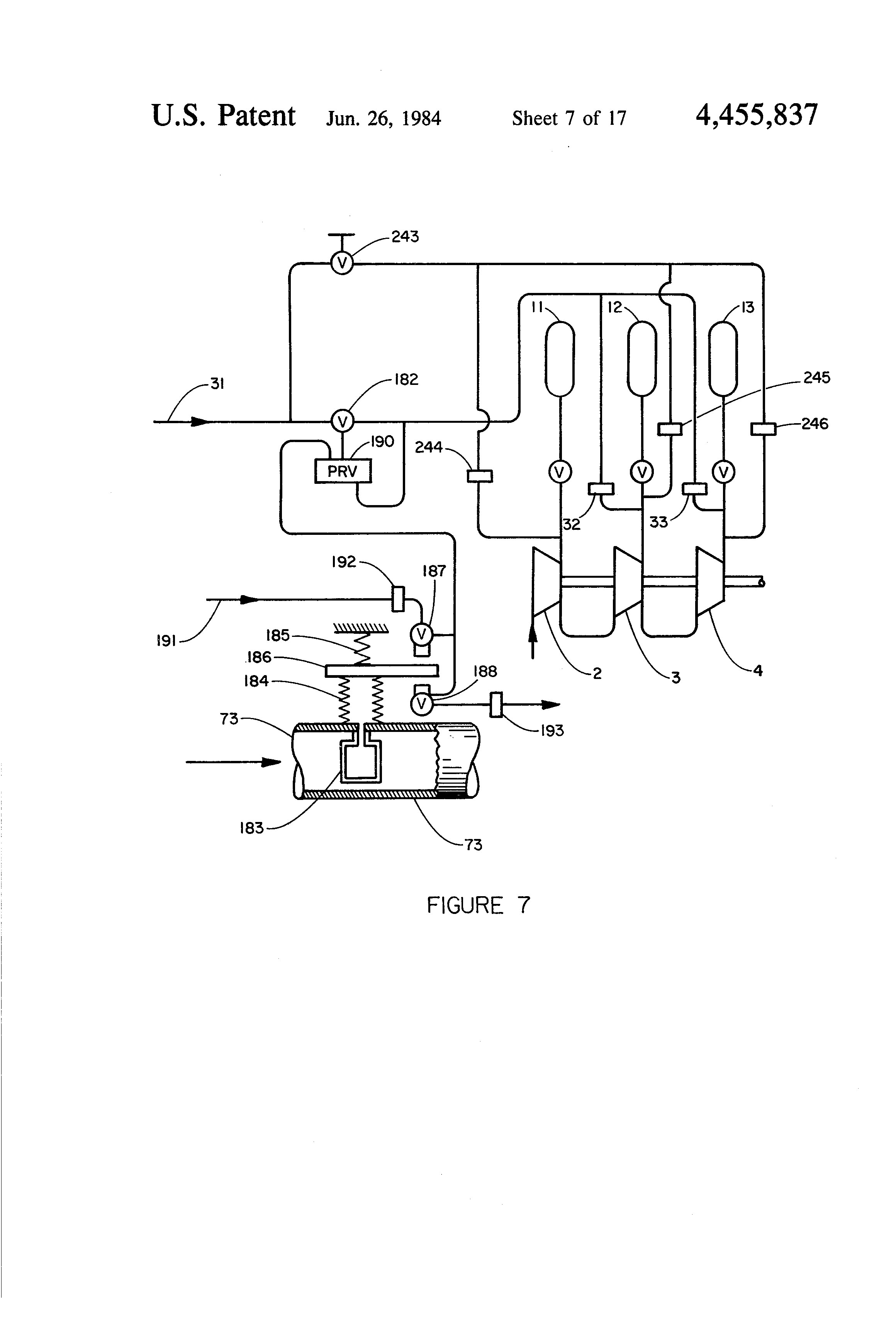 each such compressor whose number of stages exceeds one further comprising fixed open gas flow connections from the outlet end of each compressor stage, except one, to the inlet end of one other stage of said compressor, whereby said stages of said compressor are connected in series so that the pressure of a particular gas means, at delivery from each stage, increases as said gas mass is compressed through said series connected stages, from the inlet end to the outlet end of each stage, with the first stage in said series through which a gas mass first flows being both the lowest pressure stage and also that one stage whose inlet end does not have a fixed open gas flow connection from the outlet end of any other stage of said compressor, and with the last stage in said series through which a gas mass last flows being both the highest pressure stage and also that one stage whose outlet end does not have a fixed open gas flow connection to the supply end of any other stage of said compressor;