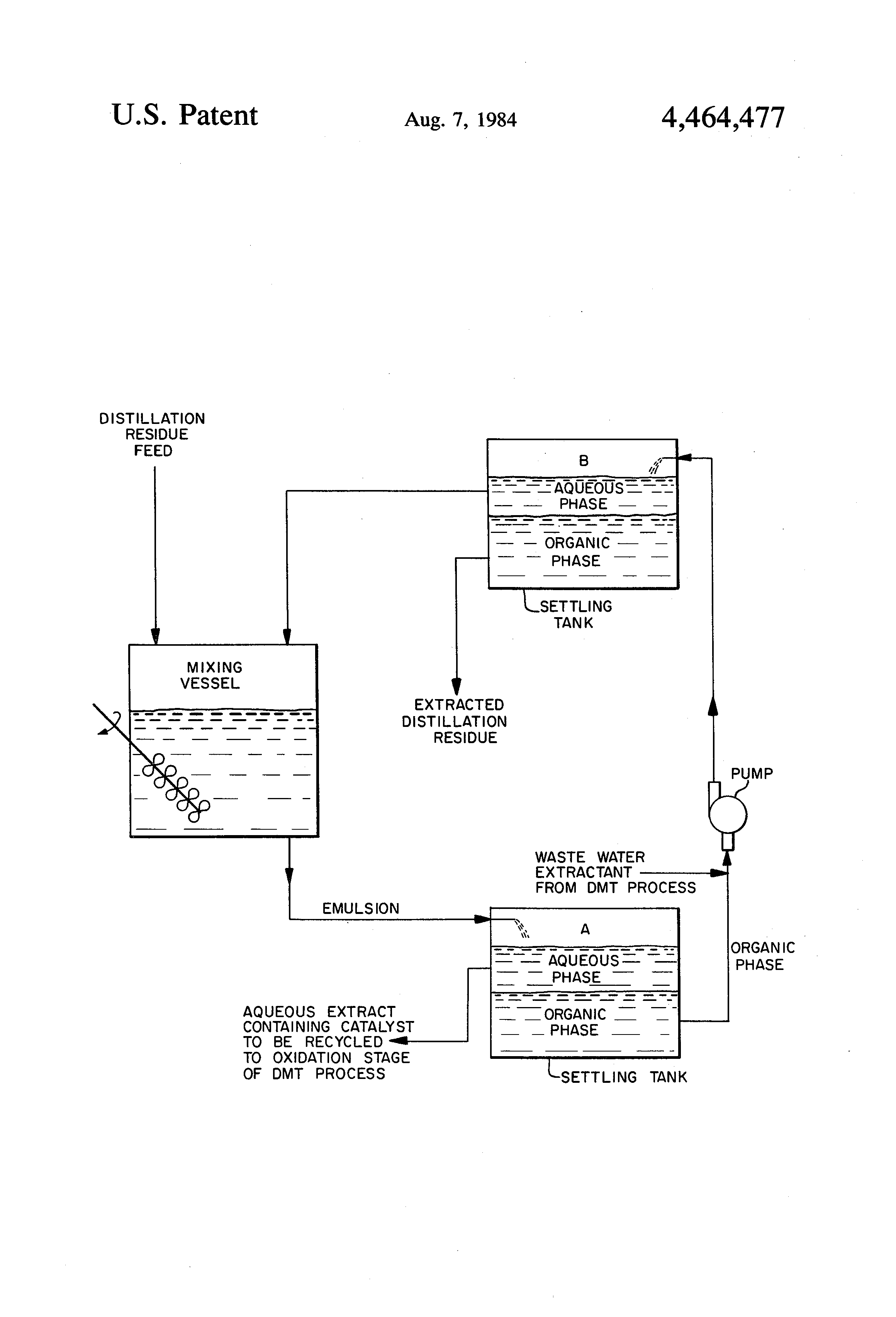 This application is a continuation in part of application Ser. No. 326,280 filed Dec. 01, 1981 now U.S. Pat. No. 3,372,875 which is continuation of Ser. No. 156,605 filed June 05, 1980 and now abandoned. The invention relates to a process for the recovery and reuse of heavy metal oxidation catalyst from residues in the Witten DMT process. Dimethyl terephthalate (DMT) is produced in numerous large-scale technical plants according to the Witten DMT process (as described for example in German Pat. No. 1,041,945). Polyesters are obtained by reacting polyhydric alcohols with DMT. Such high-molecular compounds--also called saturated polyesters--are processed, inter alia, to fibers, filaments, films or molded articles. According to the Witten DMT process, a mixture of p-xylene (PX) and methyl p-toluate (PTE) is oxidized in the liquid phase in the absence of solvents and halogen compounds under a pressure of about 4-8 bar and at a temperature of about 140°-170° C. with atmospheric oxygen in the presence of dissolved heavy metal catalysts, for example in the presence of a mixture of cobalt and manganese compounds (see German Pat. No. 2,010,137); in addition, still other catalysts have been investigated for the Witten DMT process, containing besides cobalt and/or manganese also nickel, cerium, or beryllium (cf. H. Bunger: "Compendium" 78/79, supplemental issue of periodical "Erdol und Kohle, Erdgas, Petrochemie" [Petroleum and Coal, Natural Gas, Petrochemistry], pp. 417-436). Following the oxidation stage, the thus-obtained reaction mixture consisting primarily of monomethyl terephthalate (MMT) and of p-toluic acid (PTA) is esterified with methanol under a pressure of about 20-25 bar and at a temperature of about 250°-280° C. The esterification product is separated by distillation into a PTE fraction, a DMT fraction, and a high-boiling, tarry residue. The PTE fraction is recycled into the oxidation. The high-boiling, tarry distillation residue contains, inter alia, all of the metal components of the catalyst system. There is an industrial need for recovering the oxidation catalysts from the tarry distillation residue and reuse same for the oxidation of PX and PTE. It has been suggested to recover the oxidation catalyst from high-boiling distillation residue obtained in the DMT production according to the Witten DMT method by a liquid-liquid extraction and to recycle the catalyst-containing extract into the oxidation stage. Extractants proposed in this connection were, for example, water or mixtures of water and water-soluble carboxylic acids (cf. Japanese Patent Application No. 67/42997). Such a liquid-liquid extraction, however, yields extracts having a non-uniform and frequently inadequately low catalytic activity and selectivity; for this reason, various additional measures have been proposed to avoid losses in activity and selectivity (cf. DOS [German Unexamined Laid-Open Application] No. 2,525,135; DAS [German Published Application] No. 2,531,106). These processes are still not fully satisfactory. Due to incomplete extraction, catalyst losses are incurred, and disturbances in operation are encountered due to emulsion formation. Besides, the catalyst concentrations in the extracts are low, so that the extracts must be concentrated before being reused in the oxidation stage. For raising the concentration, specific devices must be employed, causing considerable initial investment and operating costs. During storage, various compounds are separated from the concentrated extracts due to crystallization; this complicates the handling of the extracts. Furthermore, the extracts contain trimellitic acid and trimellitic acid monomethyl ester; these compounds can impair the catalytic activity and selectivity (cf. DAS No. 2,923,681). In the aforementioned processes, iron is also extracted from the distillation residue besides the catalyst components; this iron stems from the material of the apparatus. The iron, with continuous recycling of the extract into the oxidation, is increasingly enriched in the catalyst cycle with increasingly exhaustive extraction of the heavy metals. However, an extensive iron enrichment is undesirable, because this, too, impairs the selectivity of the oxidation. Furthermore, the residue extracted according to the aforementioned processes contains water in all cases, which can be a disturbing factor in any subsequent further use of the residue. The objectives of the process of this invention thus evolve from the aforedescribed state of the art and the invention seeks to provide the following advantages and effects: the degree of recovery of heavy metal oxidation catalyst is increased; the amount of extractant is reduced; an extract having an increased catalyst concentration and a reduced content of trimellitic acid, trimellitic acid monomethyl ester, and those compounds that crystallize out during storage from the extract; improper iron enrichment in the catalyst circulation is avoided in spite of increased extent of heavy metal extraction; and an extracted residue with a low water content is recovered. These objectives have been accomplished according to this invention in a process which is characterized by an extraction wherein the extractant and the residue containing the heavy metal catalyst are conducted countercurrently through the extraction stages in a quantitative ratio of residue to extractant of from 1:0.9 to 1:0.1. The extraction procedure according to the invention wherein the residue and the extractant are conducted countercurrently to each other can consist of two or more extraction stages. With an increasing number of extraction stages, the amount of extractant based on the quantity of residue can be reduced. Two to six extraction stages are advantageous. According to the state of the art, the distillation residue and the extractant are intermixed for a time of 10-240 minutes. According to the invention, an intermixing of residue with extractant, sufficient 