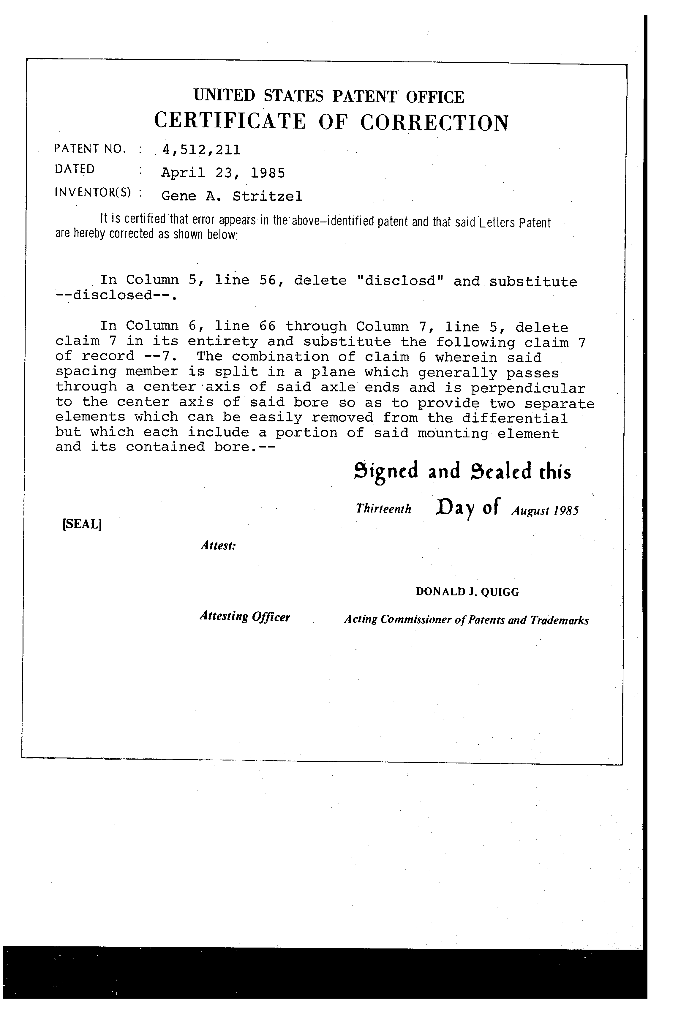 A spacing member 40 is of a special design for use with a differential assembly having drive gears 26 and 26, in the form of worm gears, which are operatively connected to each other through sets of transfer gears 34 and 36, having worm wheel portions 37 for meshing with respective drive gears 26 and 28. The spacing member 40 is made up of a number of pieces for ease of installation and removal and is provided with a mounting element 42 which functions to secure the spacing element in a preferred position between the innermost ends of axle segments 12 and 14. The mounting element 42 is provided with a bore 43 for receiving a journal pin 44 associated with an intermediate gear 38 position between a pair of transfer gears 34 and 36.